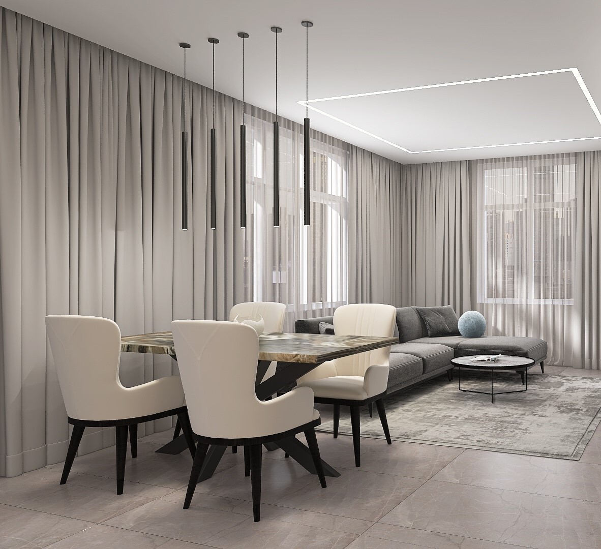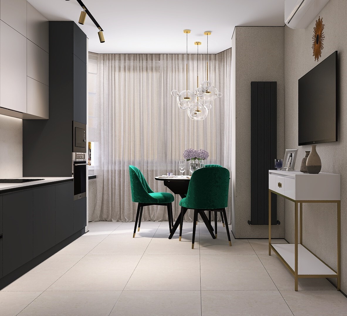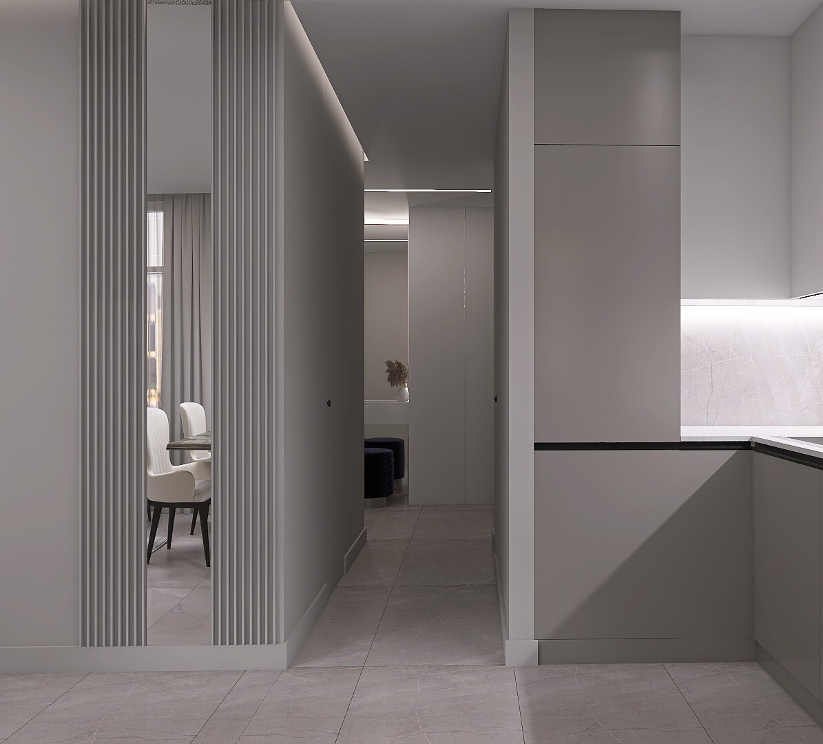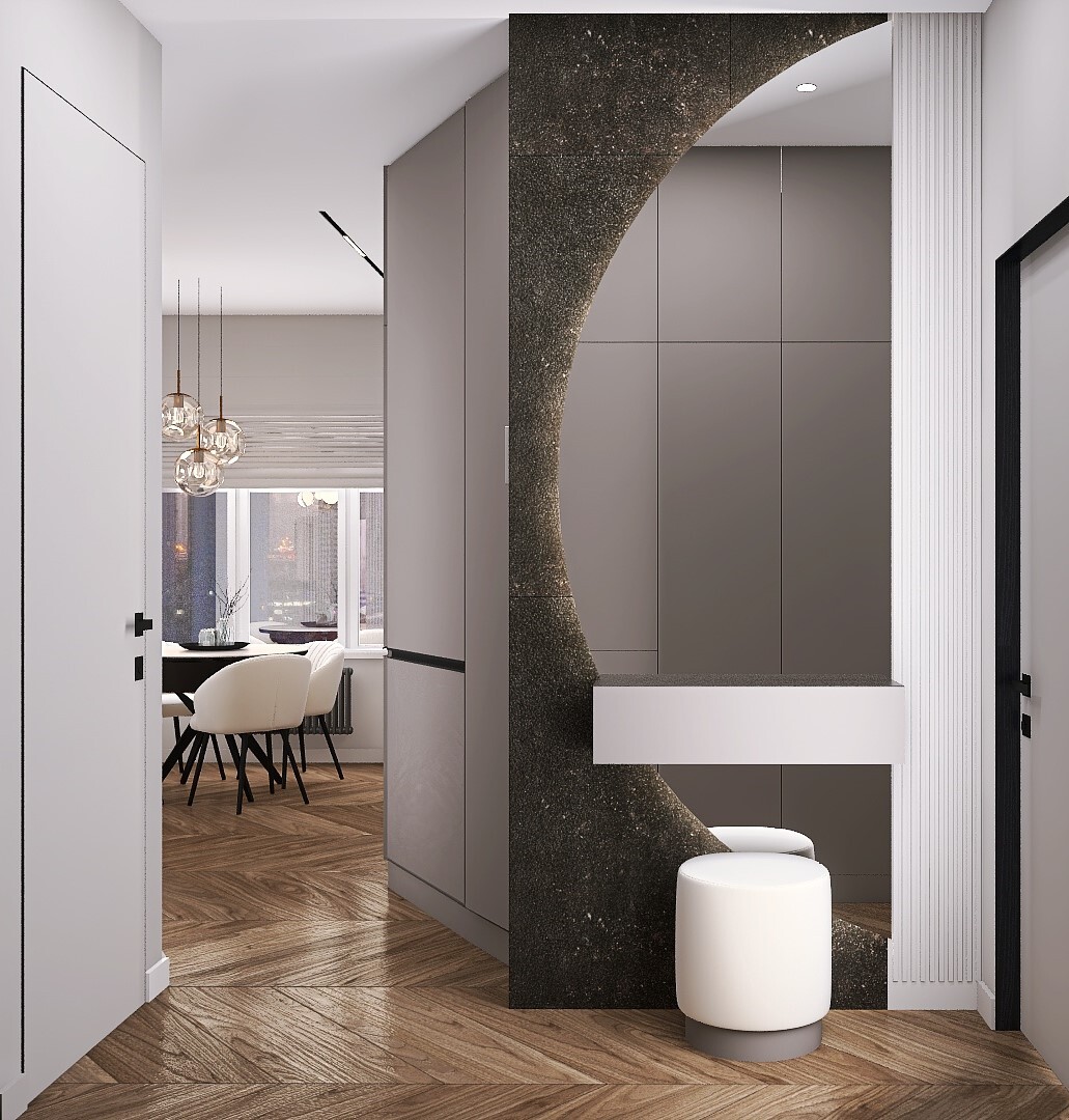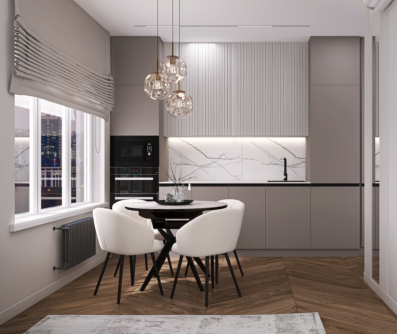 Заказчики мне сразу сказали, что нужно всё максимально строго, сдержанно, но элегантно. Холодные тона, но не с теплыми нотками. А еще приветствуется функциональность и практичность. И вот, что получилось на основе пожеланий. Проект уже реализован, новоселье отмечено.