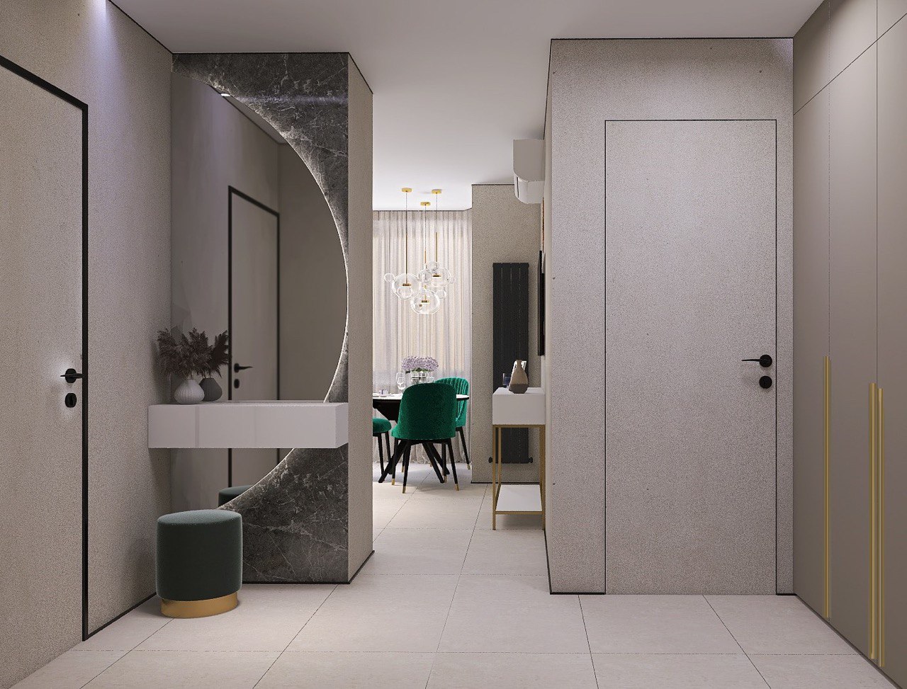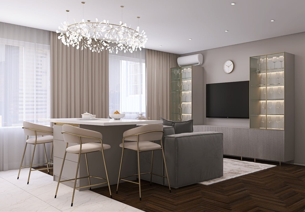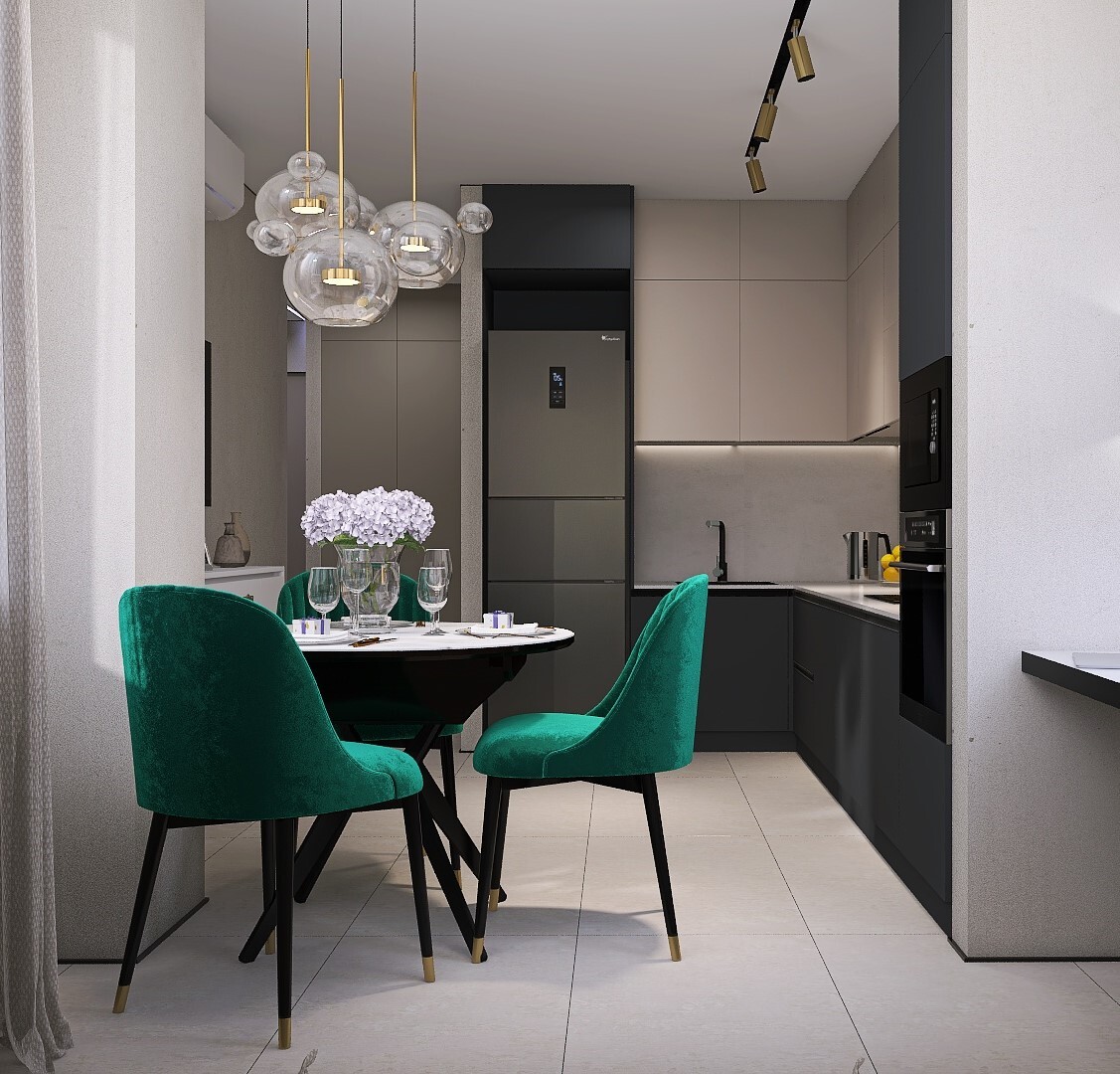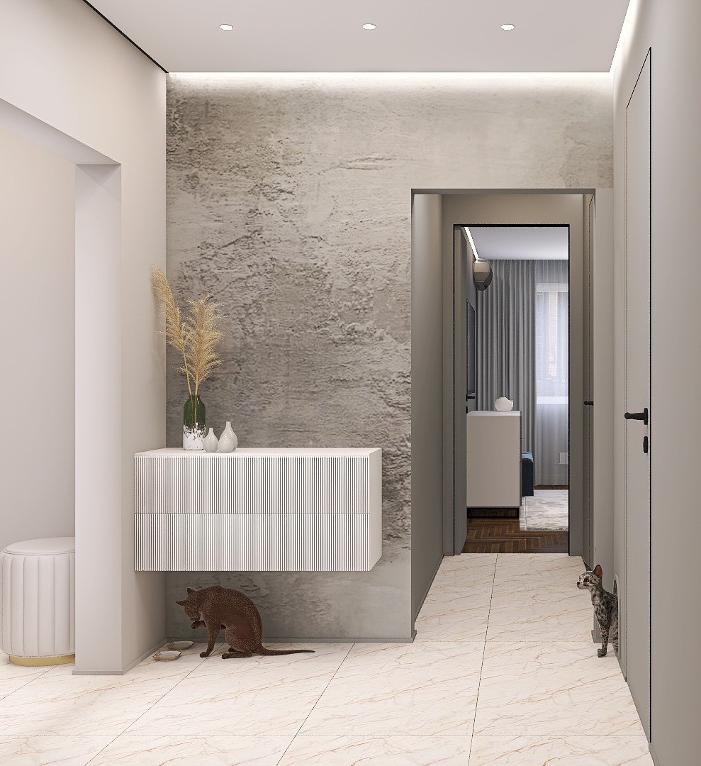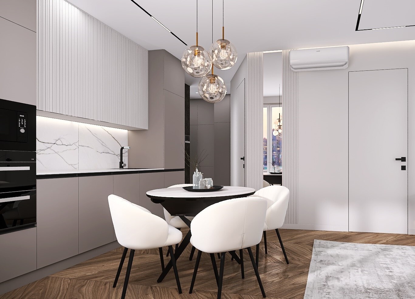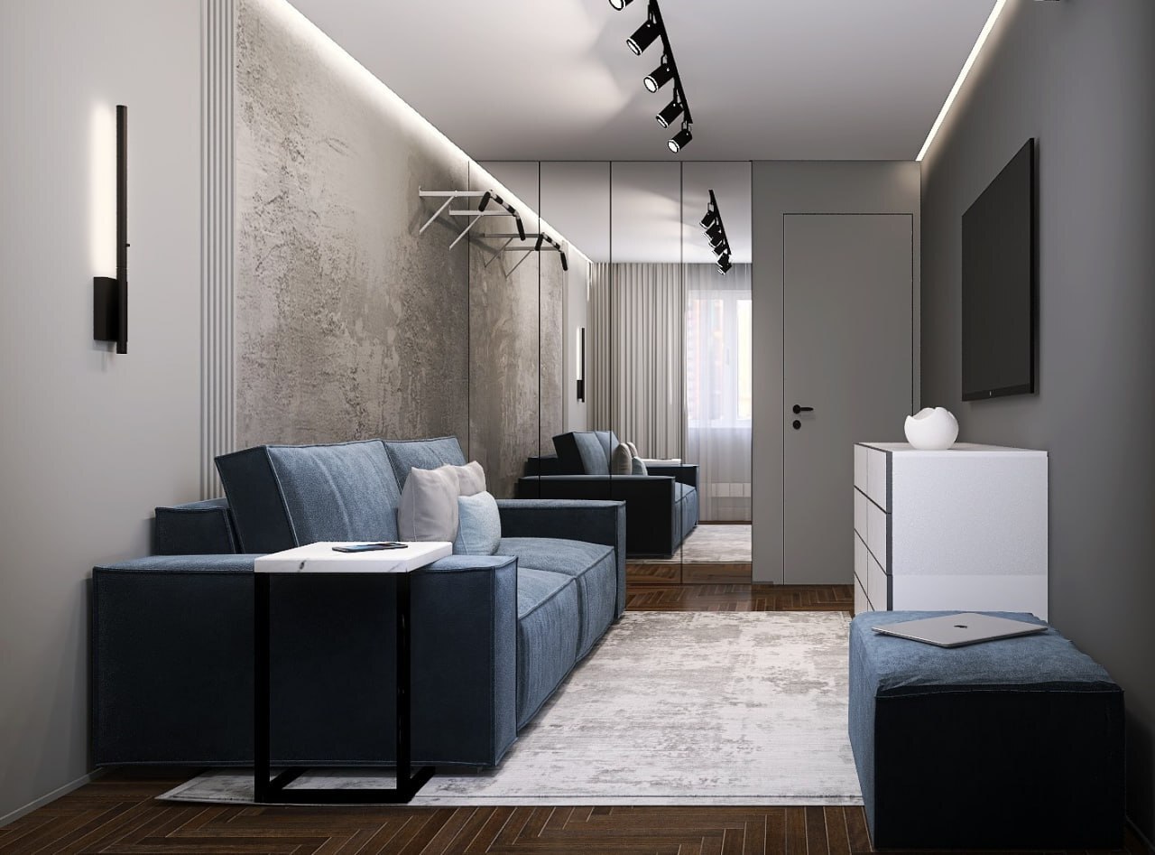 Заказчики мне сразу сказали, что нужно всё максимально строго, сдержанно, но элегантно. Холодные тона, но не с теплыми нотками. А еще приветствуется функциональность и практичность. И вот, что получилось на основе пожеланий. Проект уже реализован, новоселье отмечено.