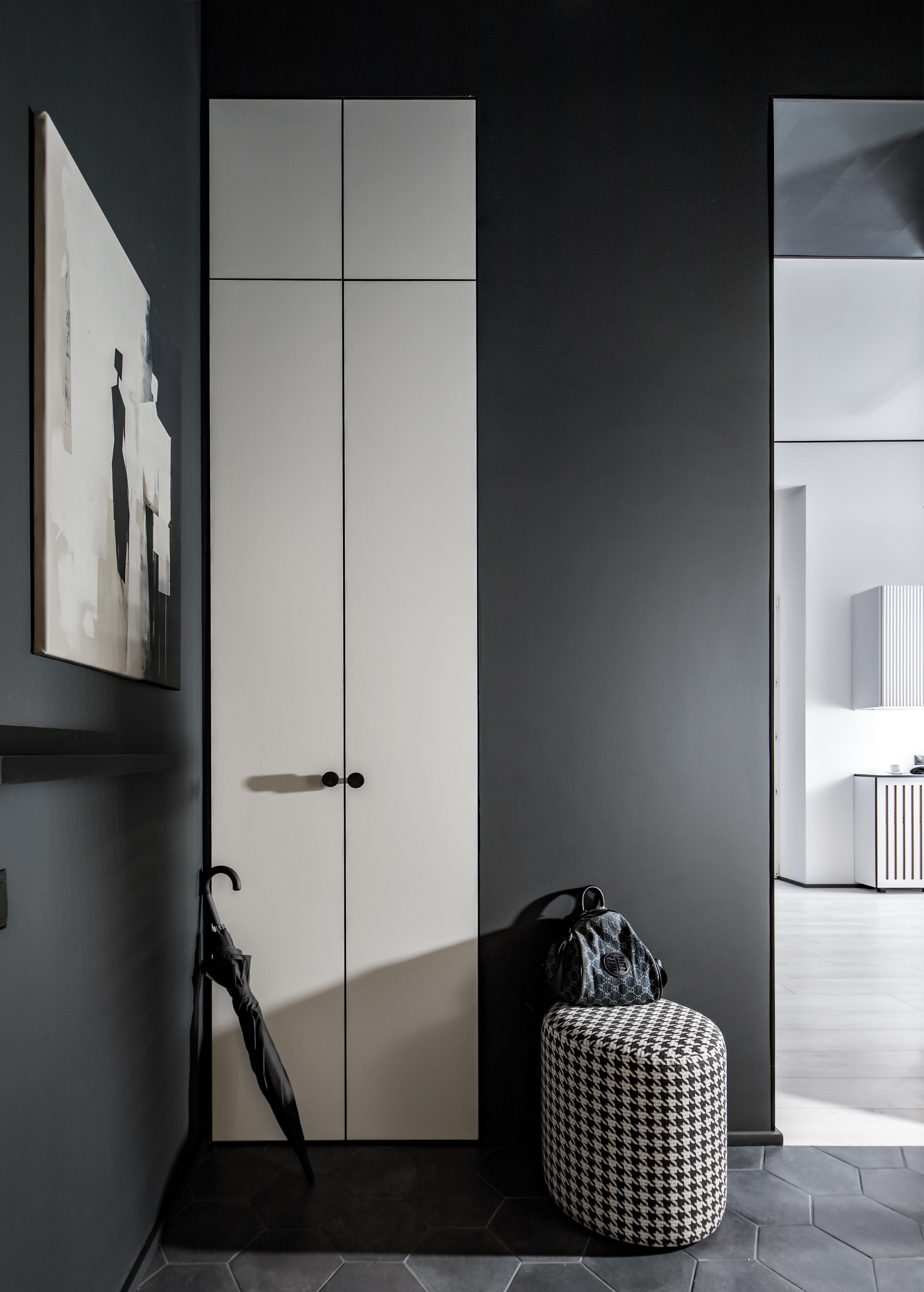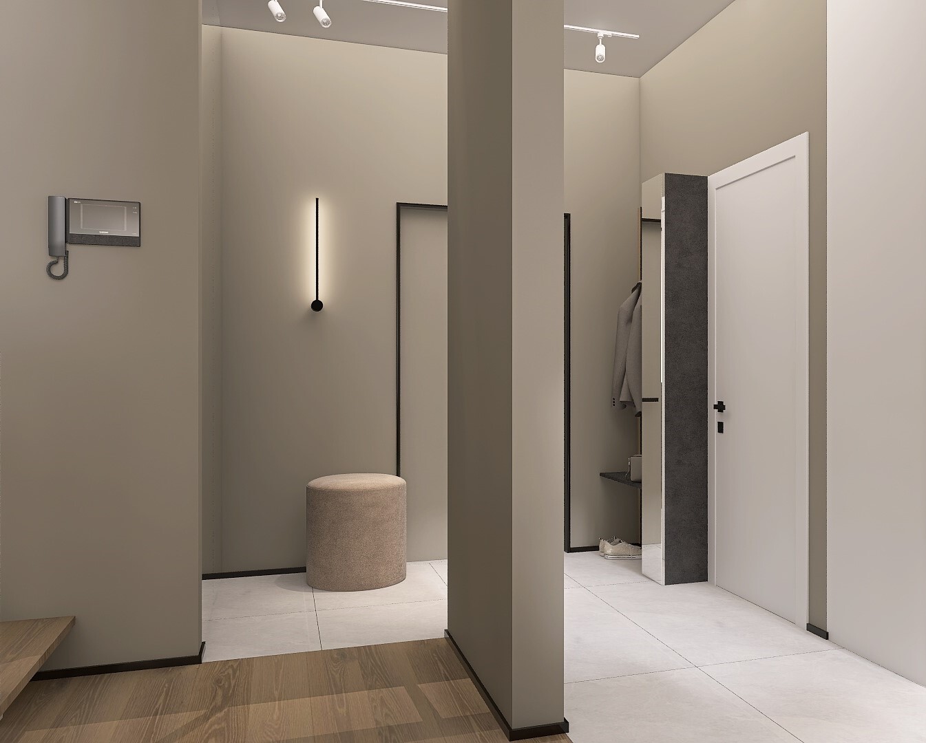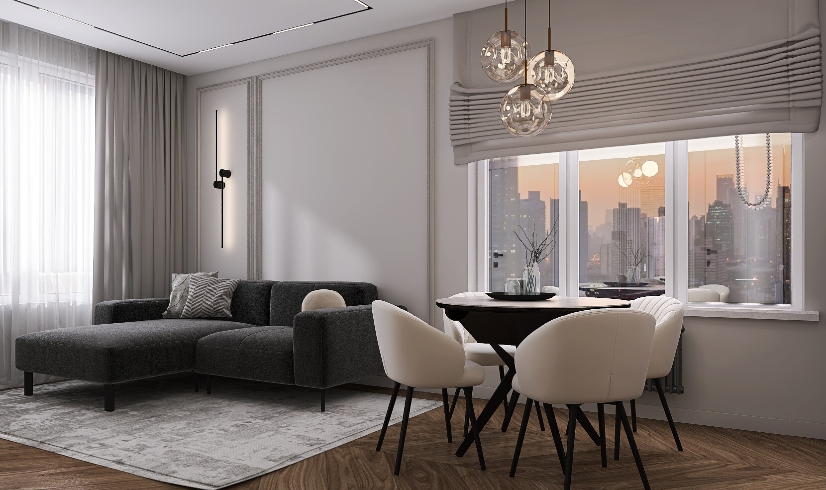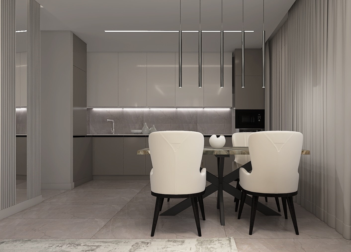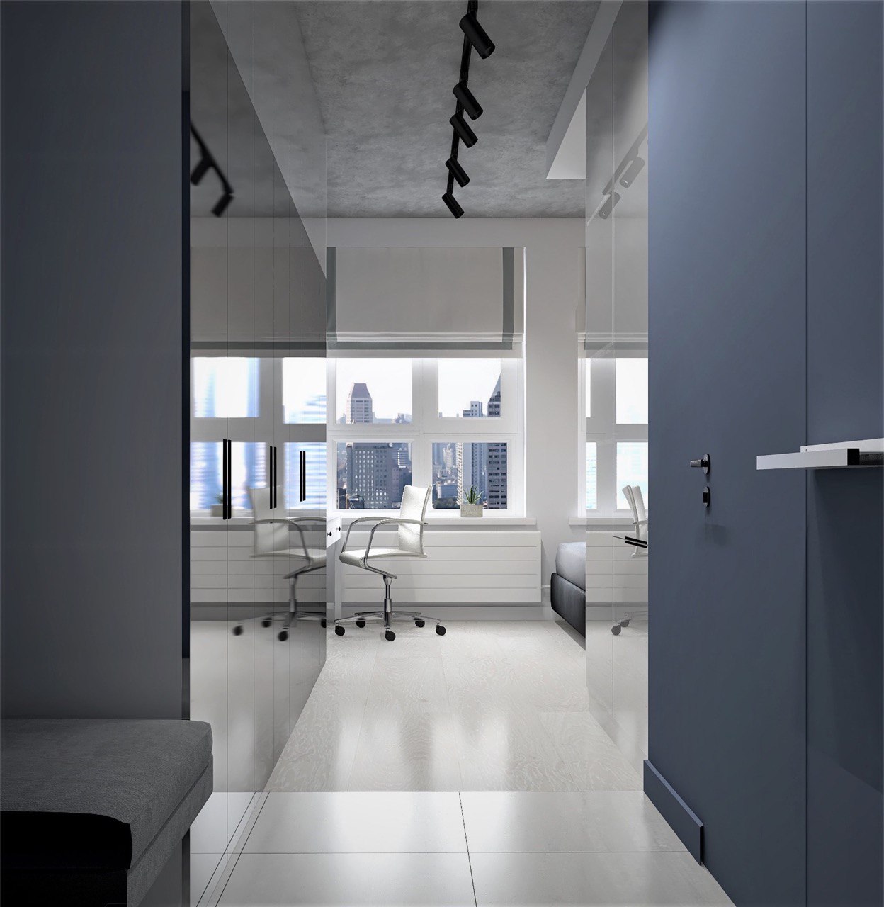 Заказчики мне сразу сказали, что нужно всё максимально строго, сдержанно, но элегантно. Холодные тона, но не с теплыми нотками. А еще приветствуется функциональность и практичность. И вот, что получилось на основе пожеланий. Проект уже реализован, новоселье отмечено.