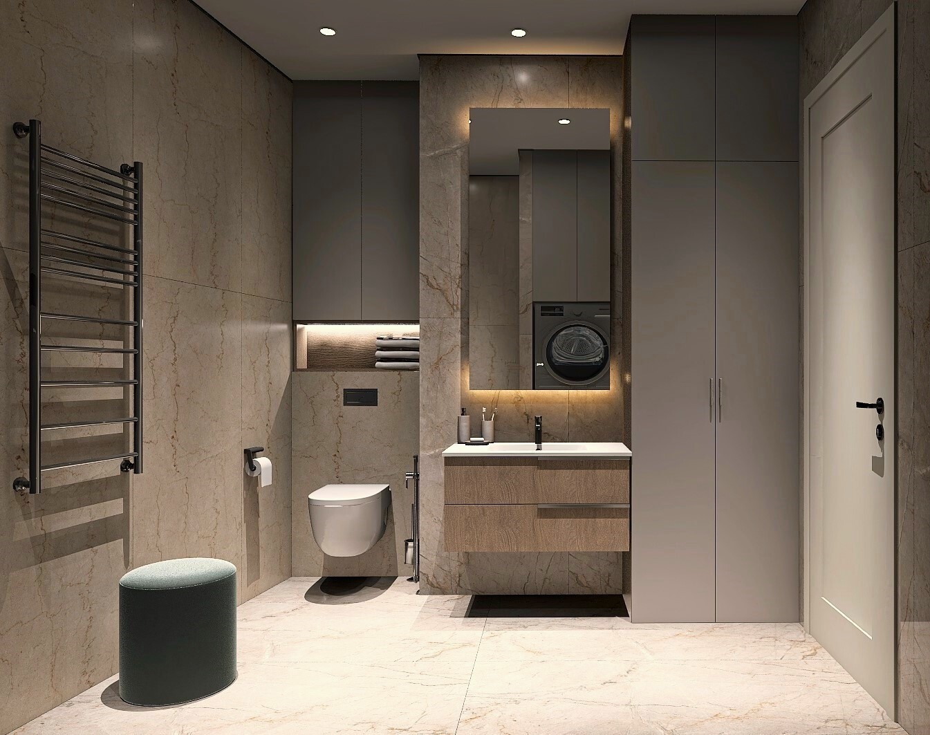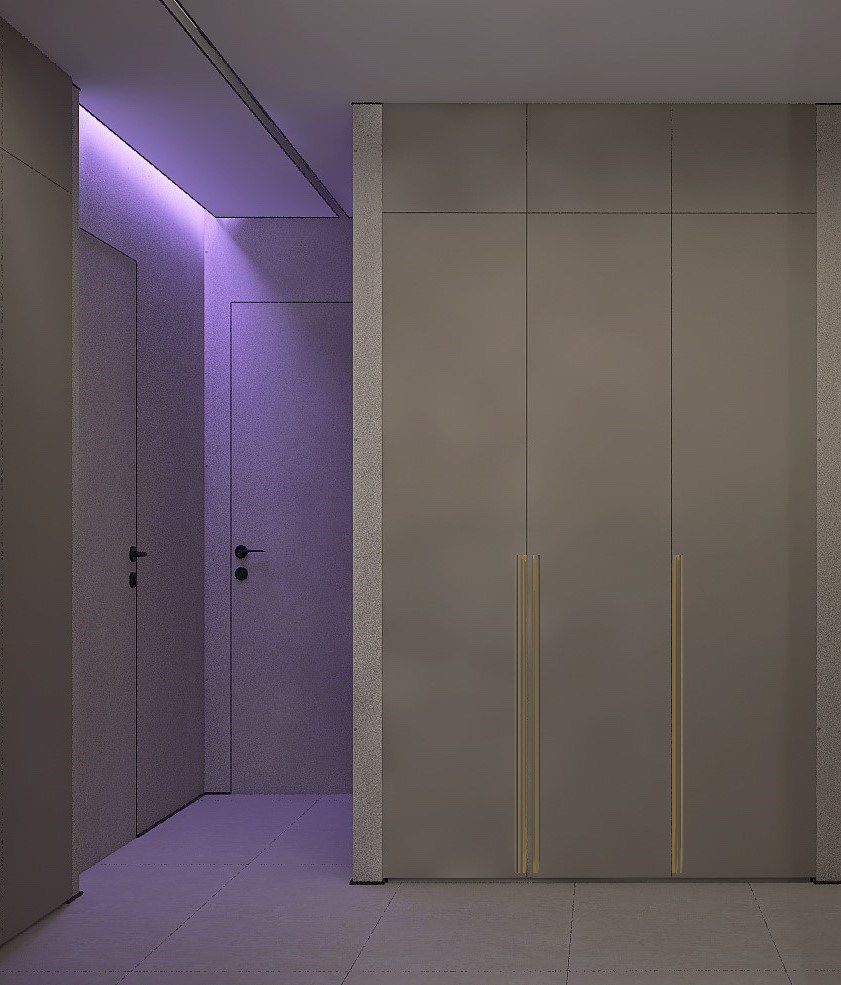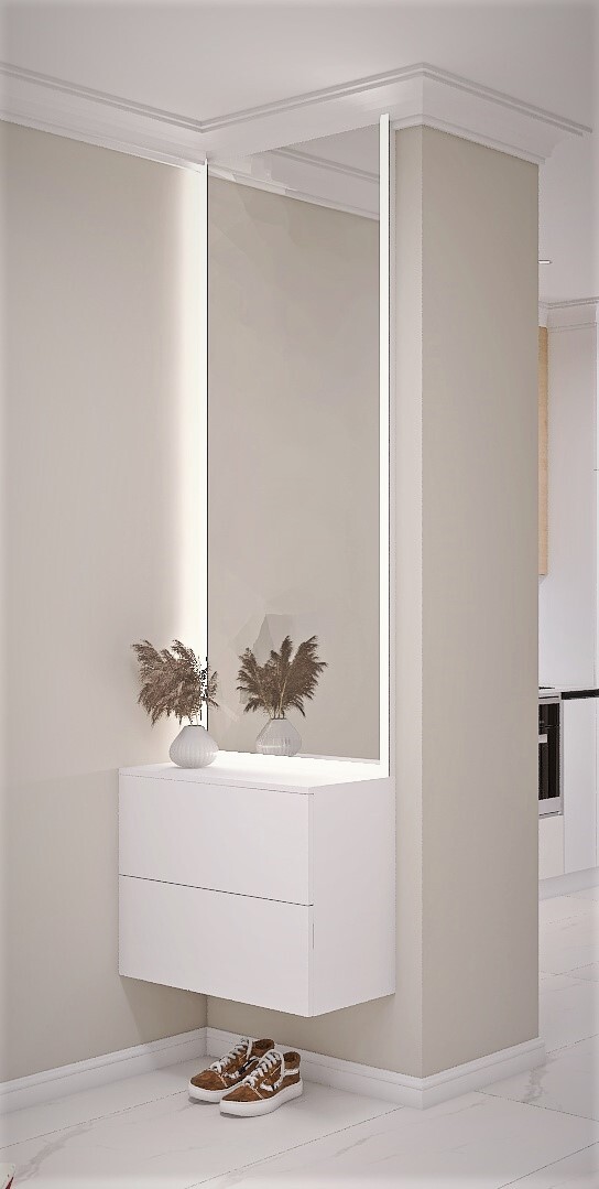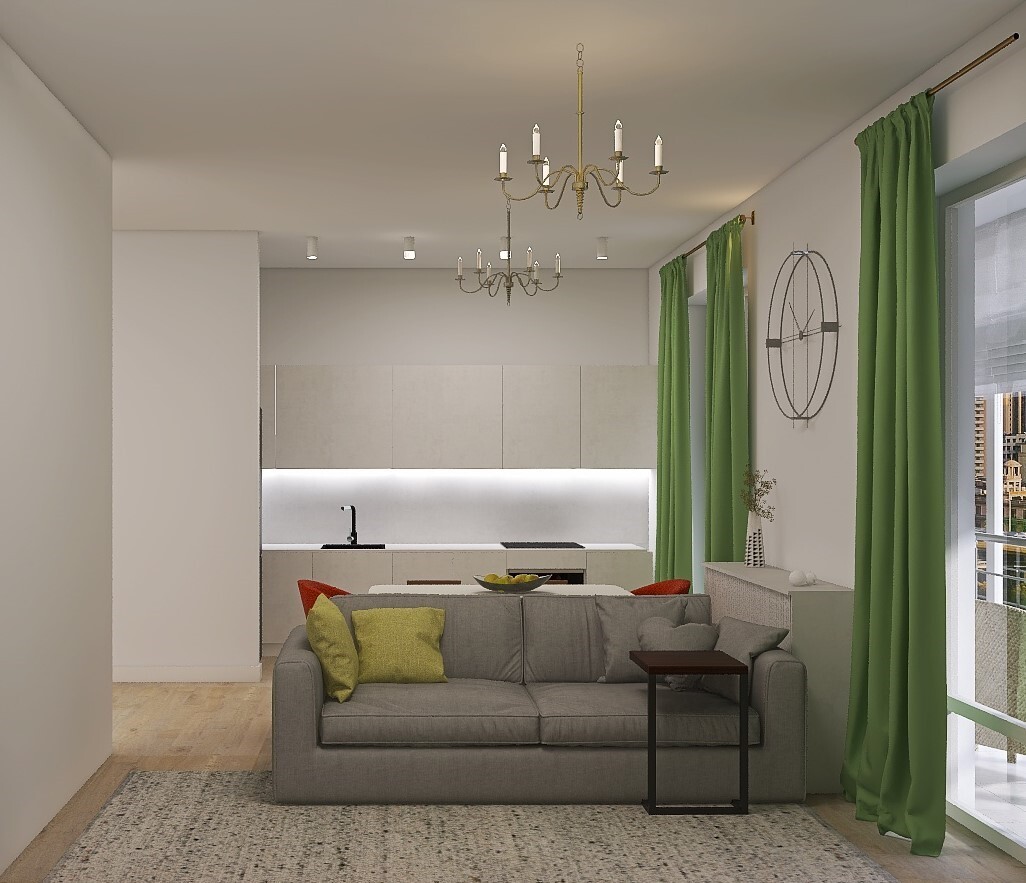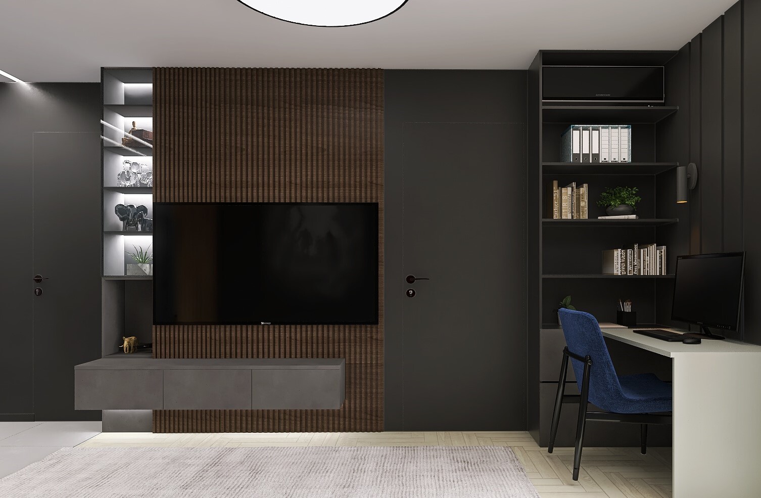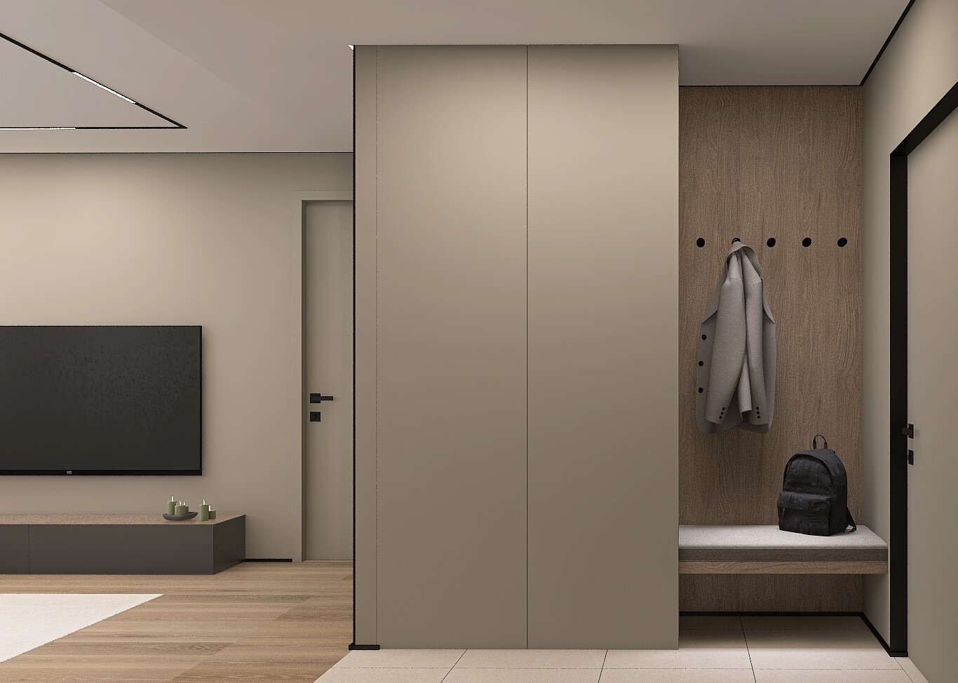 Заказчики мне сразу сказали, что нужно всё максимально строго, сдержанно, но элегантно. Холодные тона, но не с теплыми нотками. А еще приветствуется функциональность и практичность. И вот, что получилось на основе пожеланий. Проект уже реализован, новоселье отмечено.