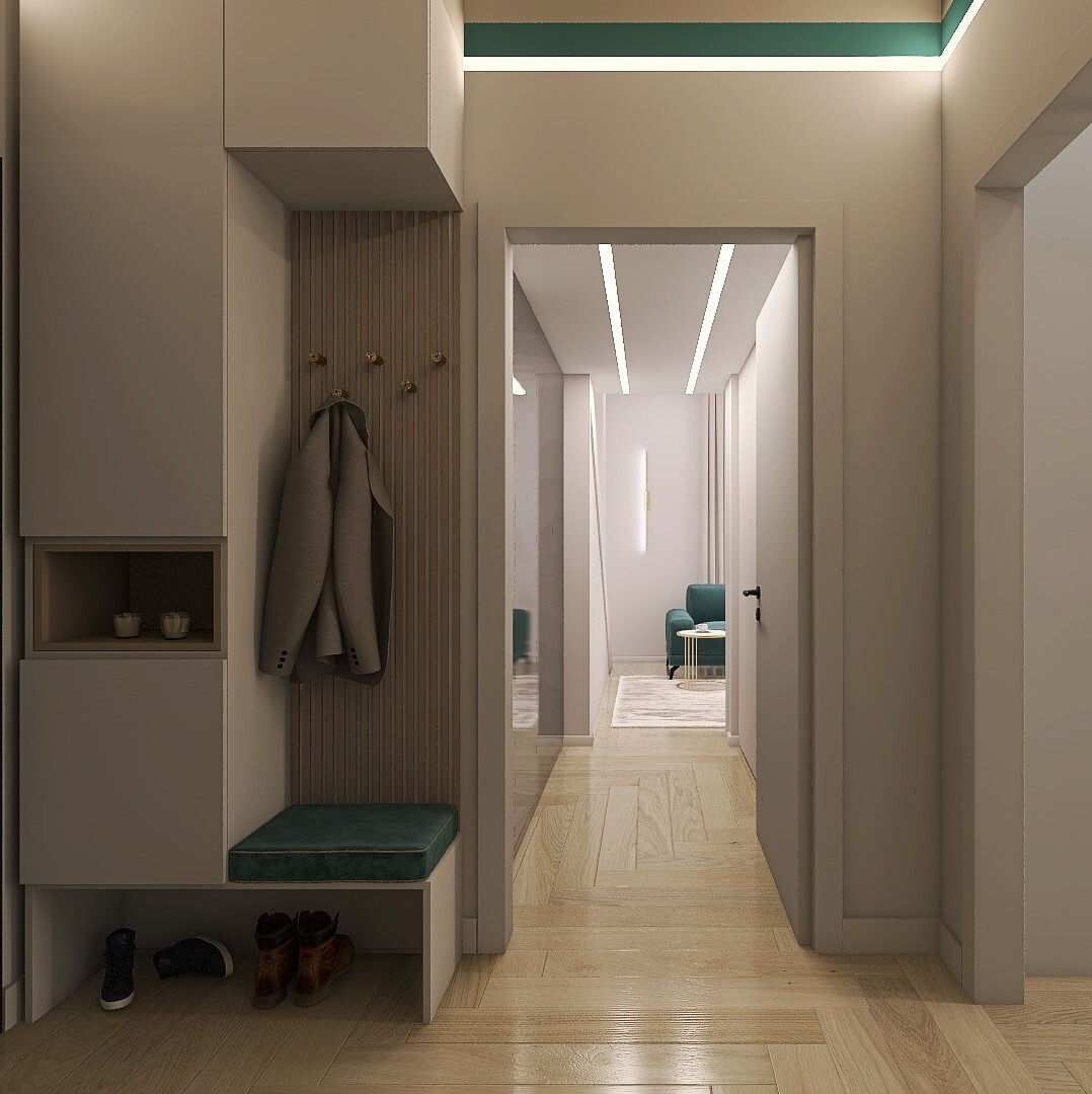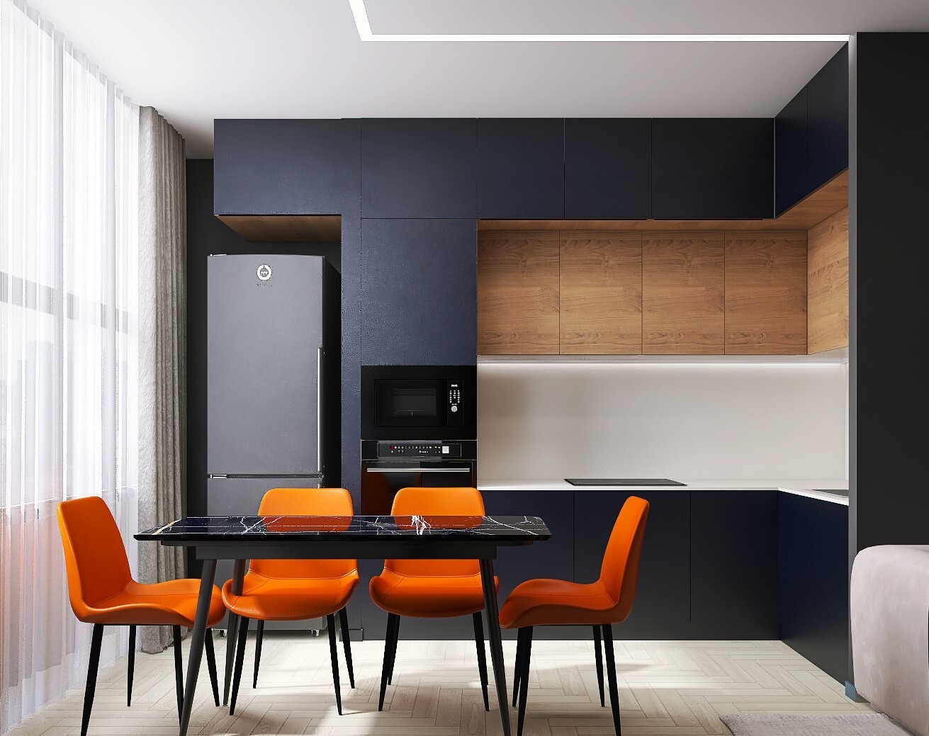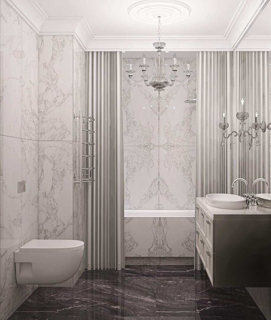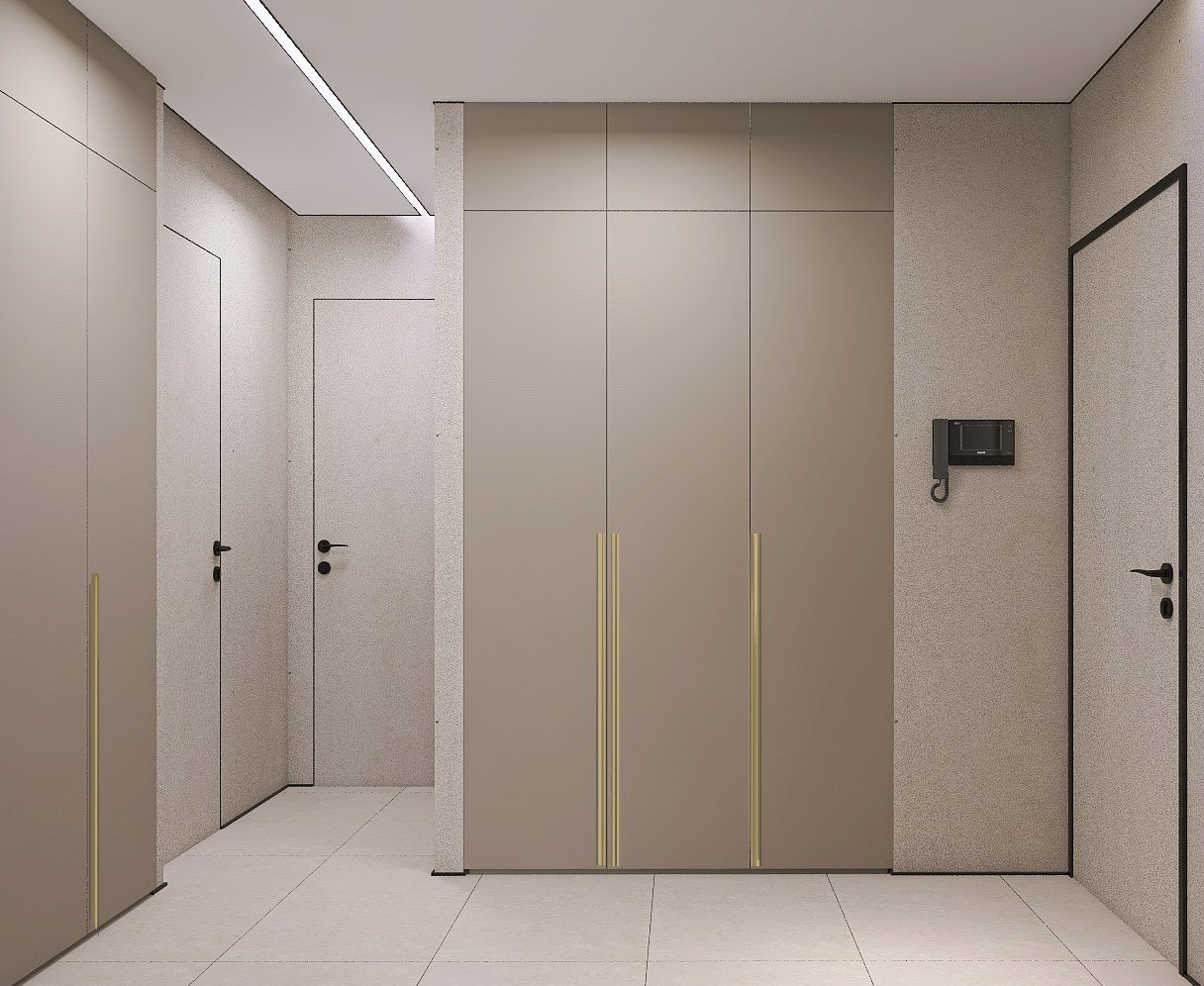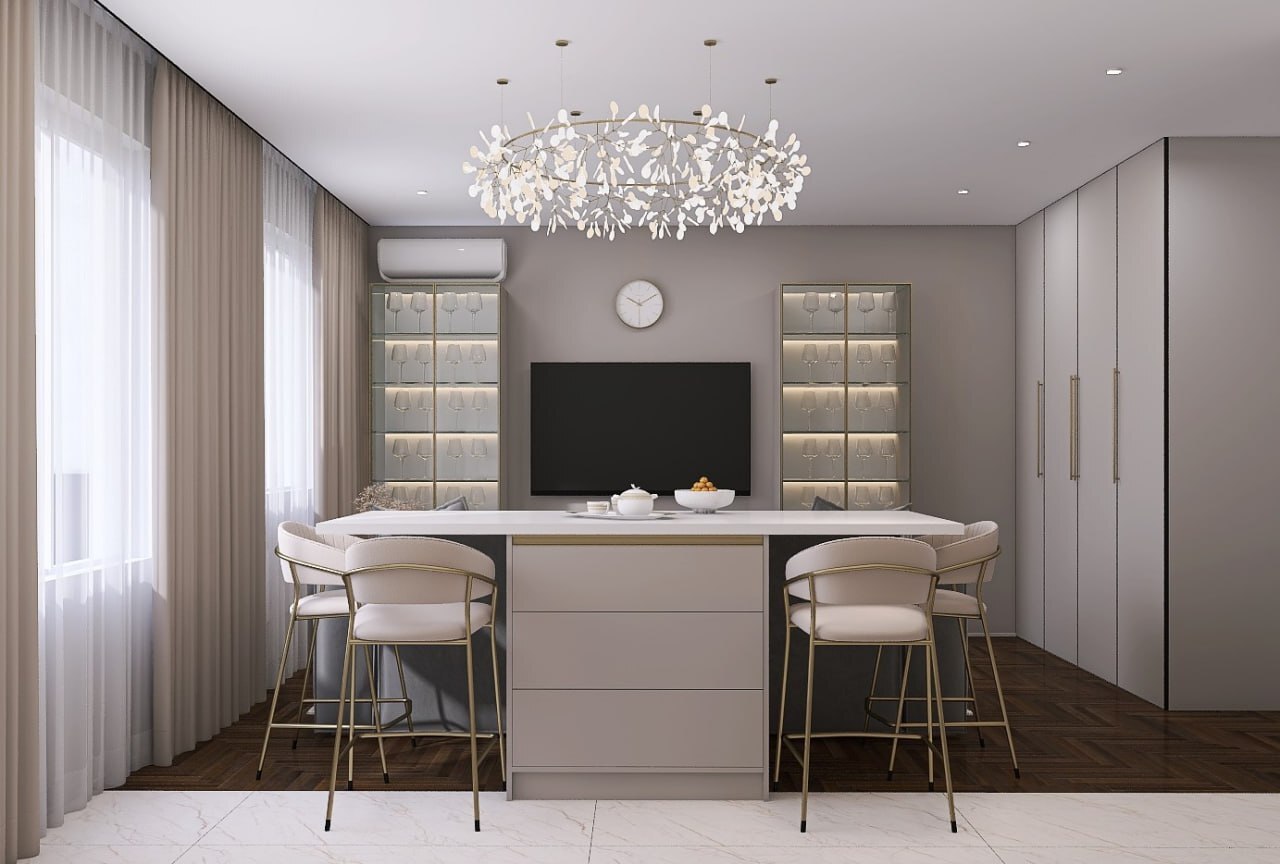 Заказчики мне сразу сказали, что нужно всё максимально строго, сдержанно, но элегантно. Холодные тона, но не с теплыми нотками. А еще приветствуется функциональность и практичность. И вот, что получилось на основе пожеланий. Проект уже реализован, новоселье отмечено.