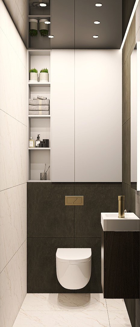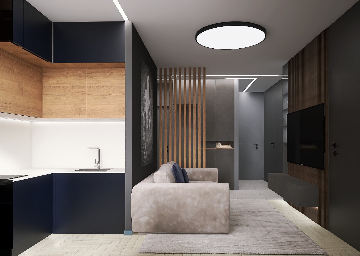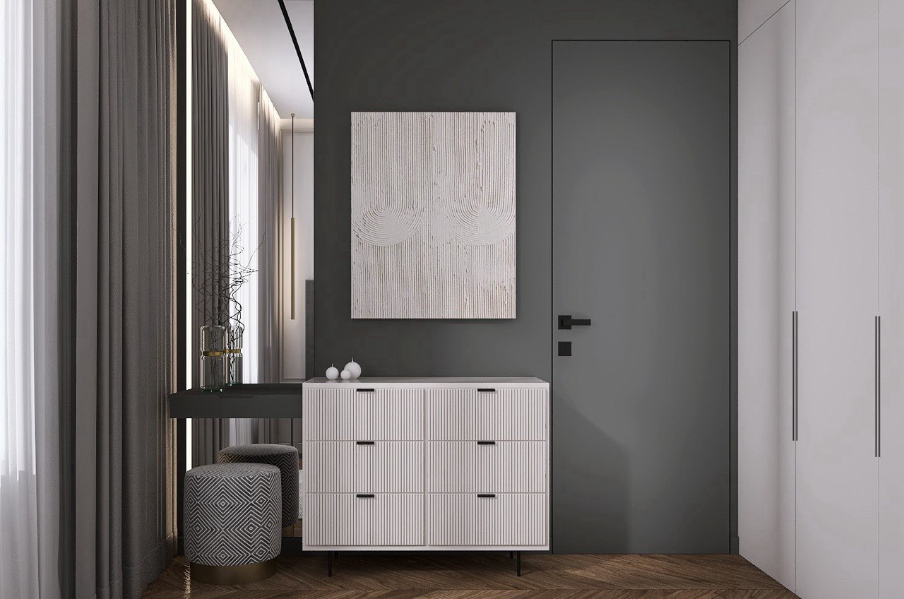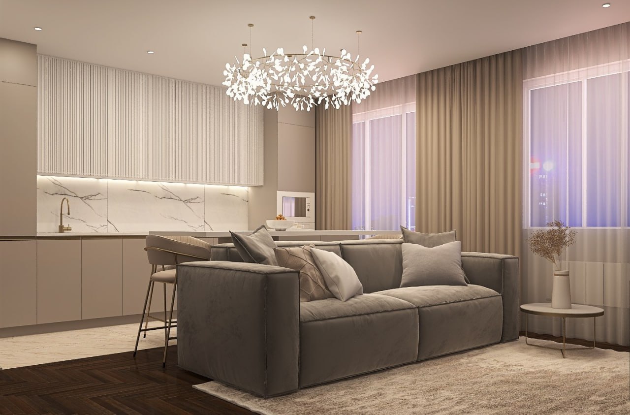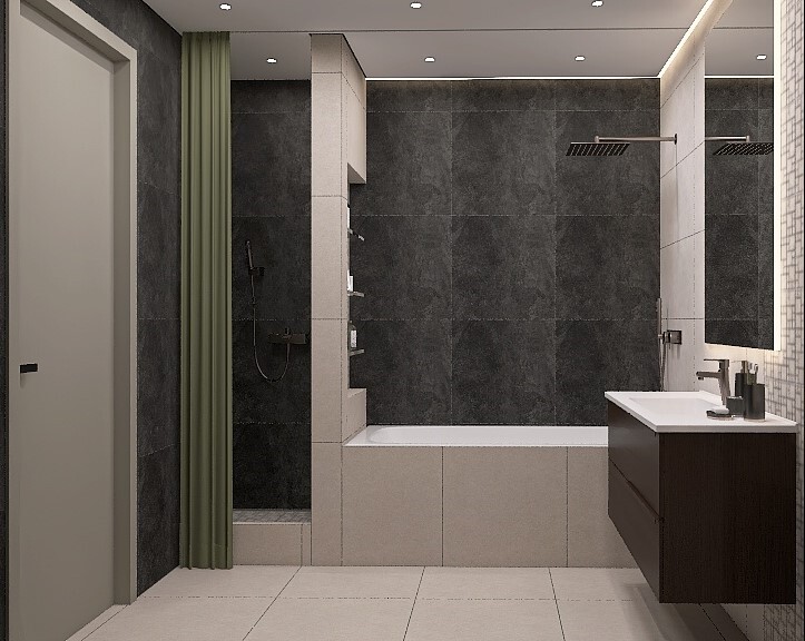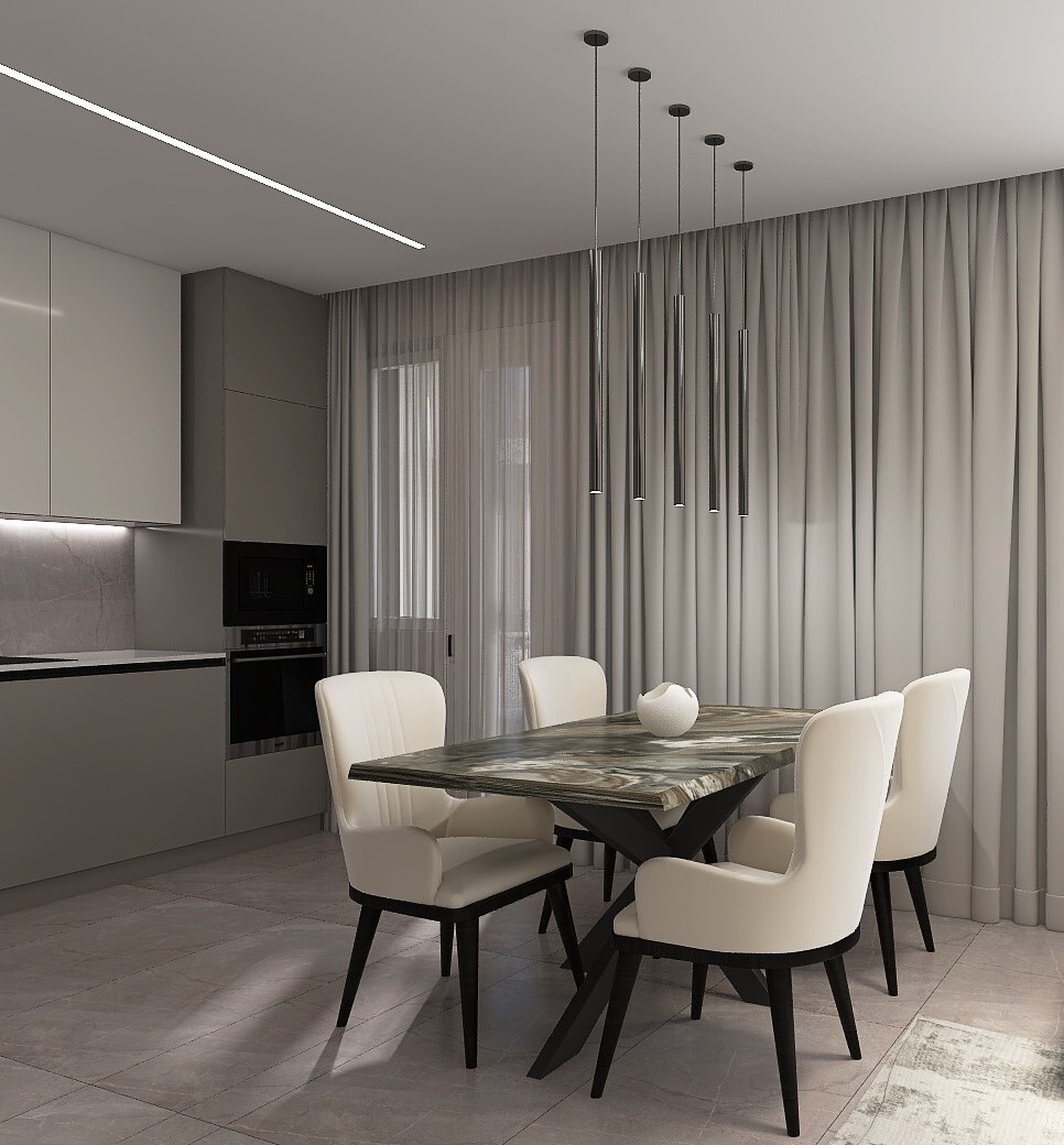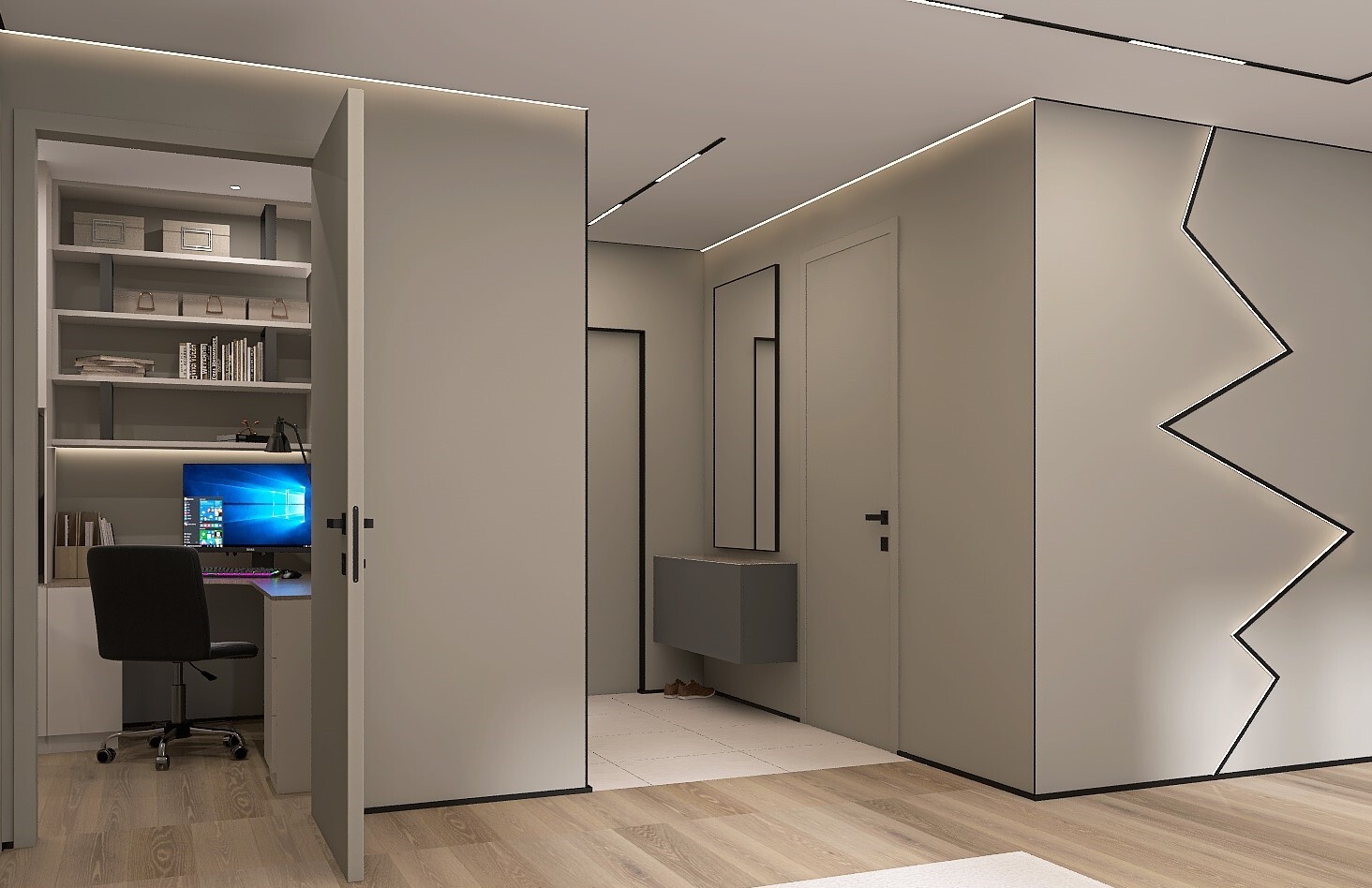 Заказчики мне сразу сказали, что нужно всё максимально строго, сдержанно, но элегантно. Холодные тона, но не с теплыми нотками. А еще приветствуется функциональность и практичность. И вот, что получилось на основе пожеланий. Проект уже реализован, новоселье отмечено.