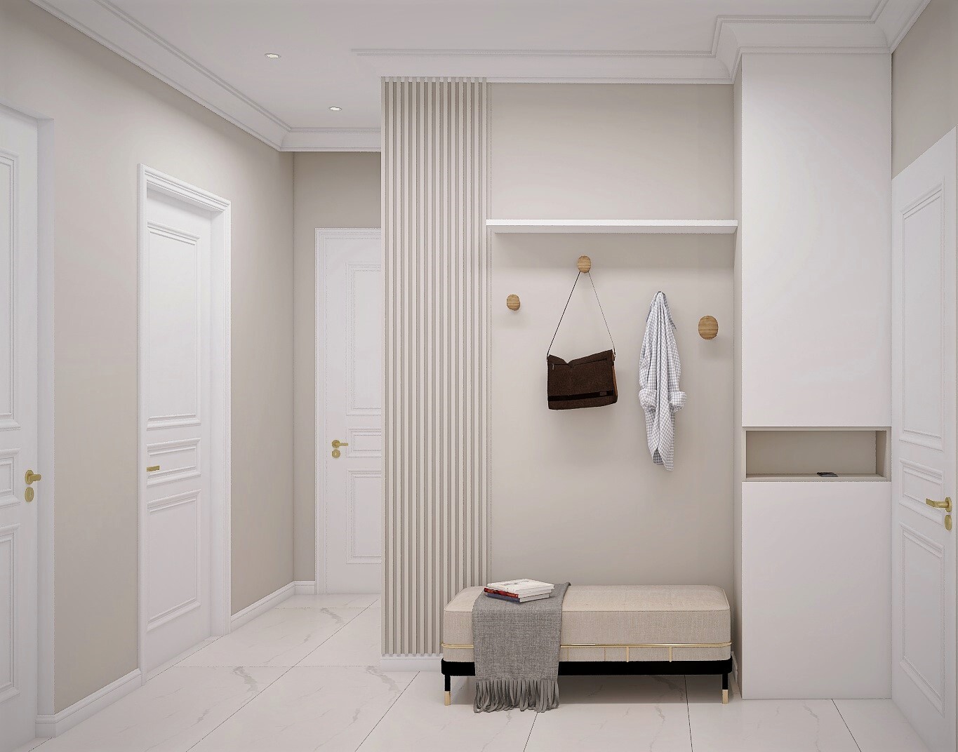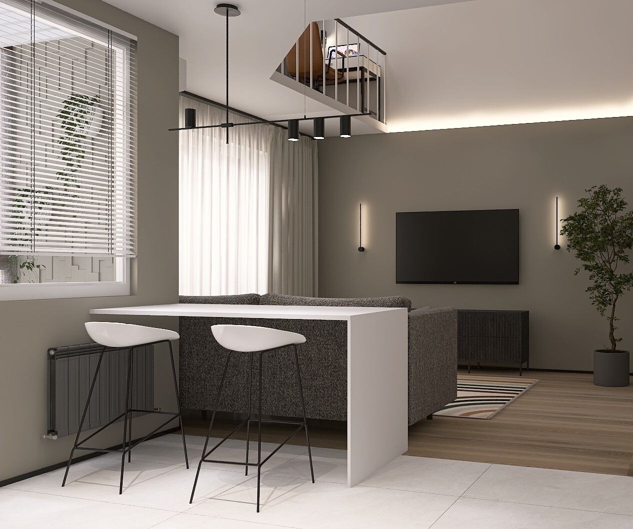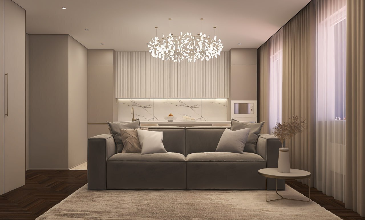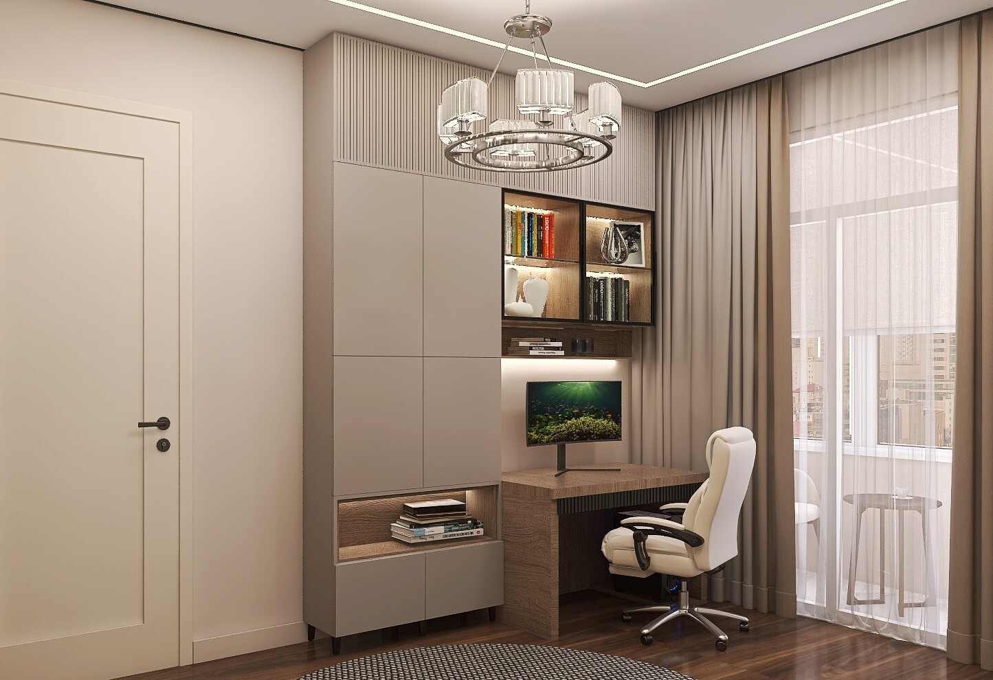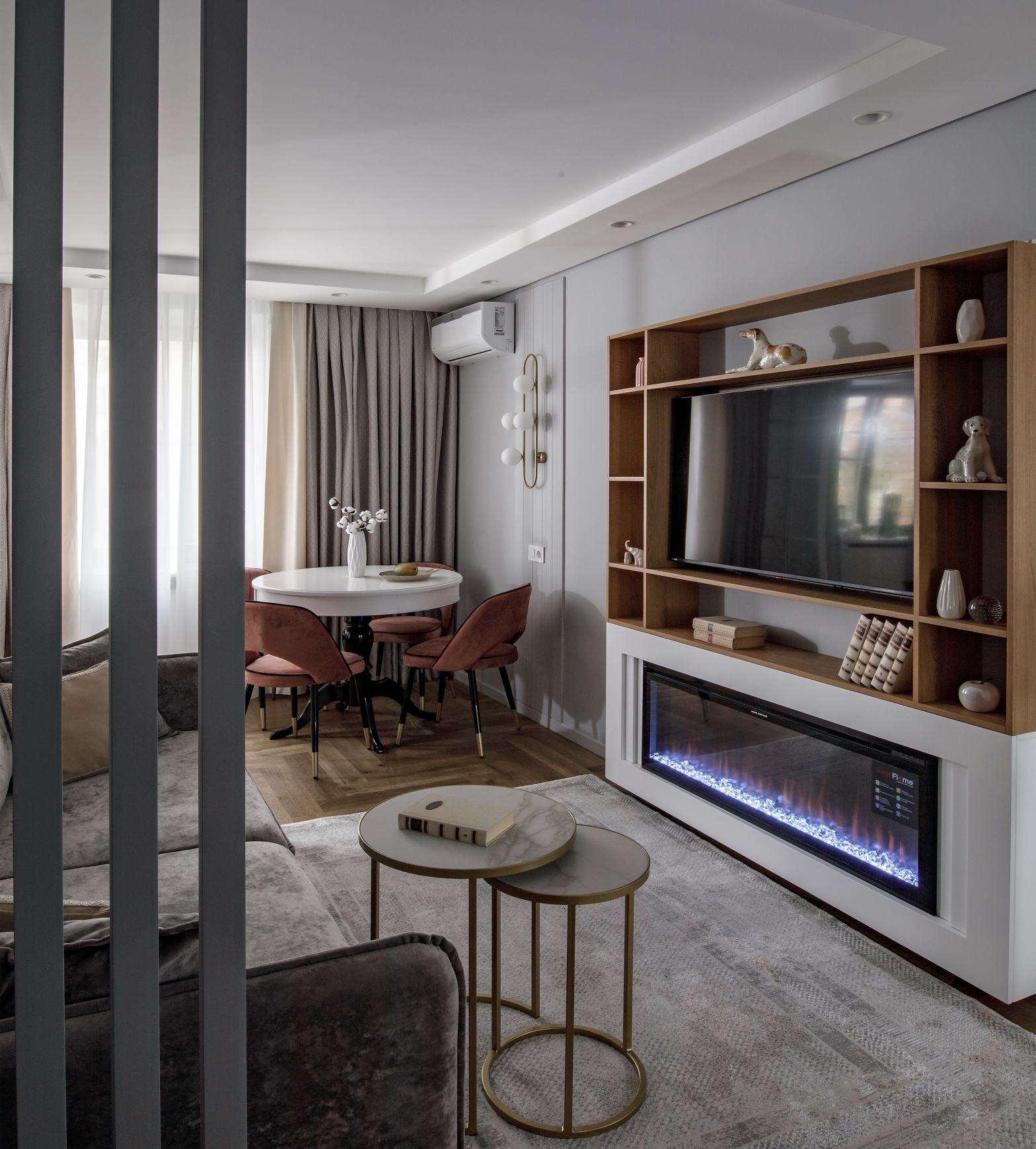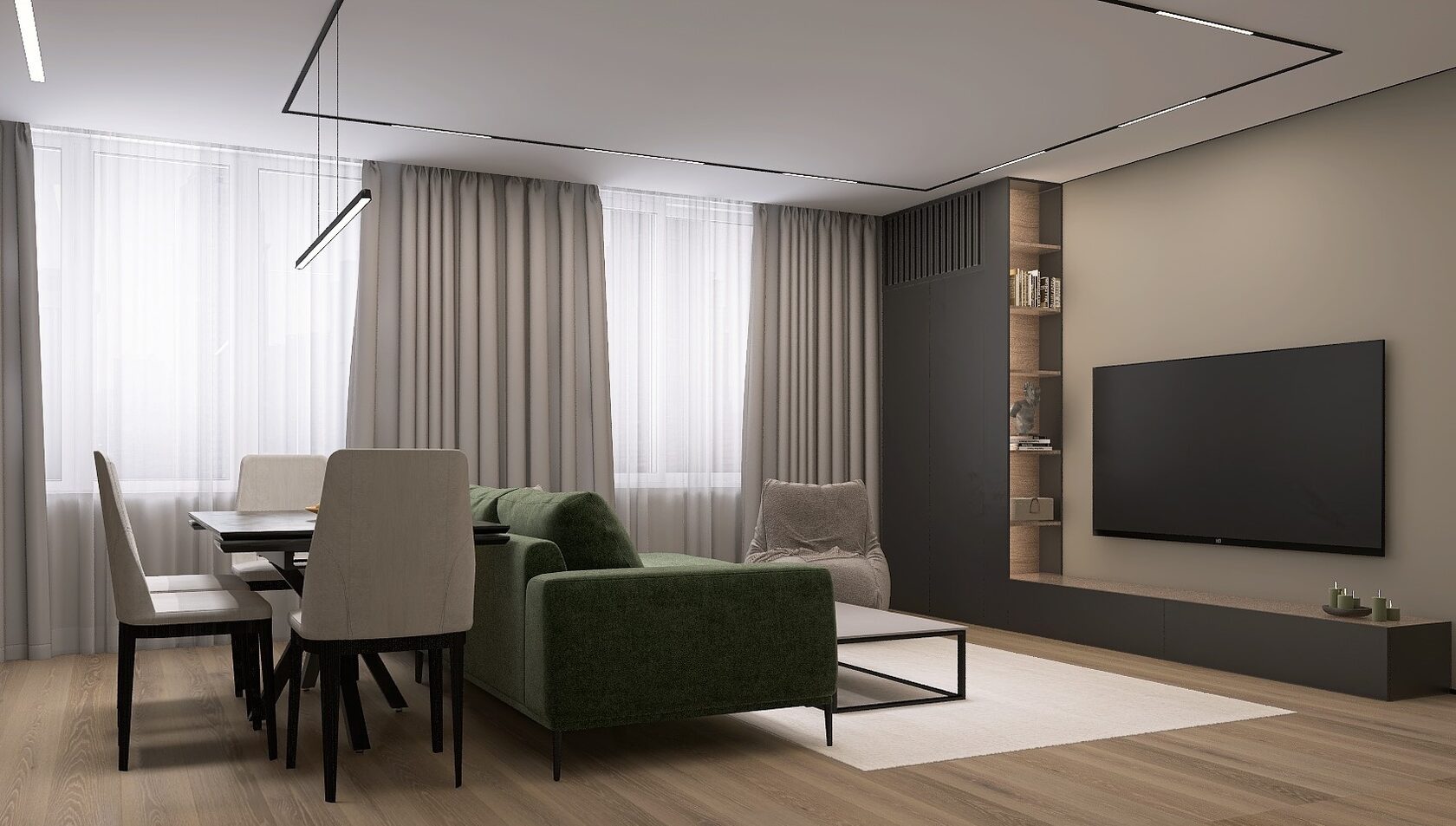 Заказчики мне сразу сказали, что нужно всё максимально строго, сдержанно, но элегантно. Холодные тона, но не с теплыми нотками. А еще приветствуется функциональность и практичность. И вот, что получилось на основе пожеланий. Проект уже реализован, новоселье отмечено.