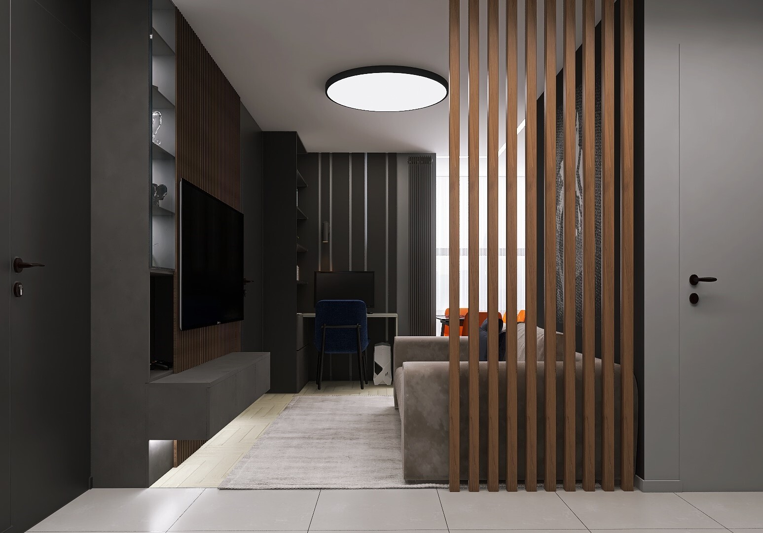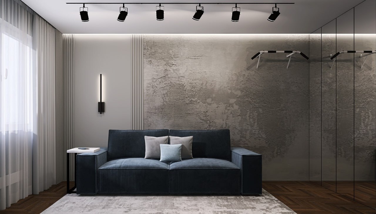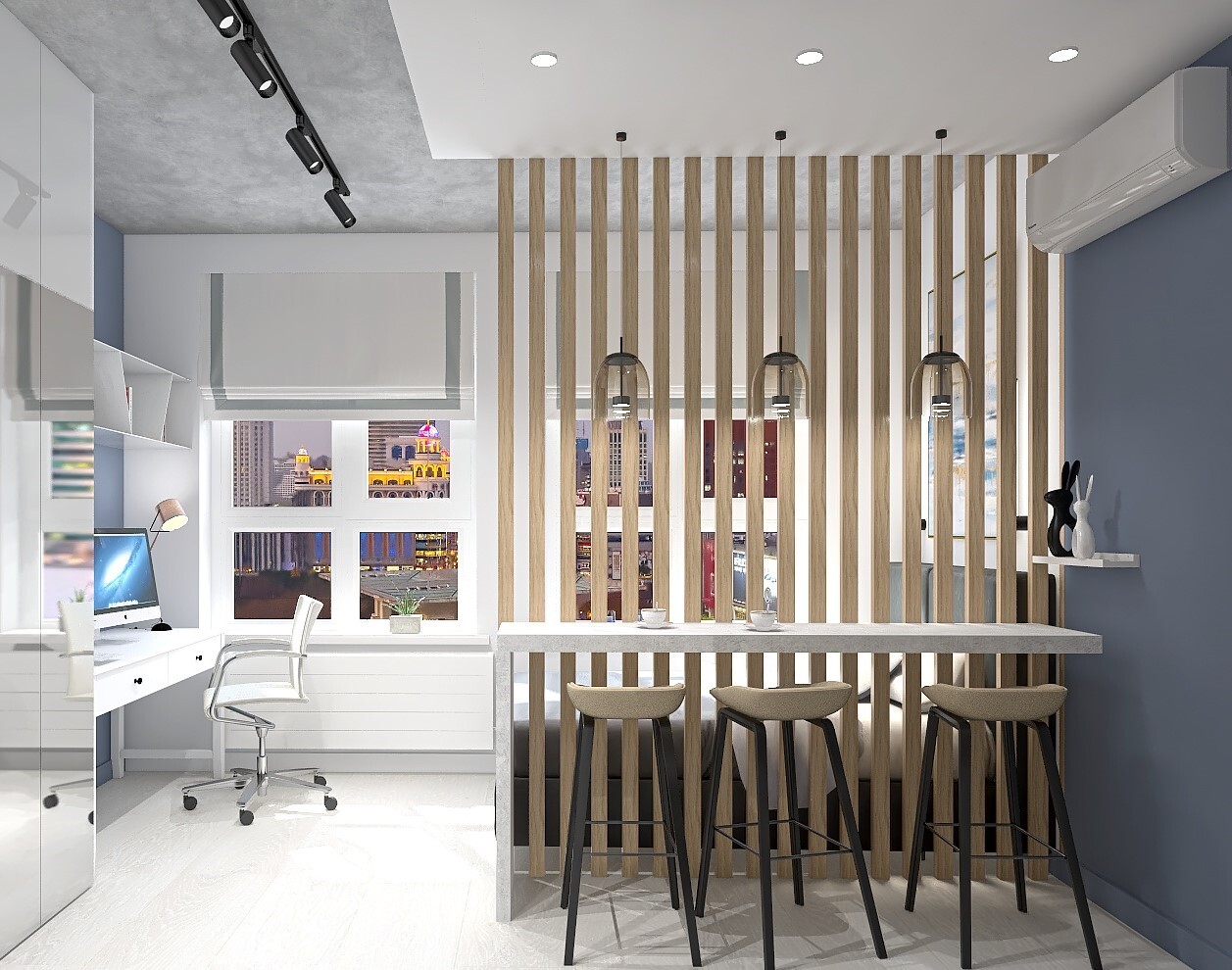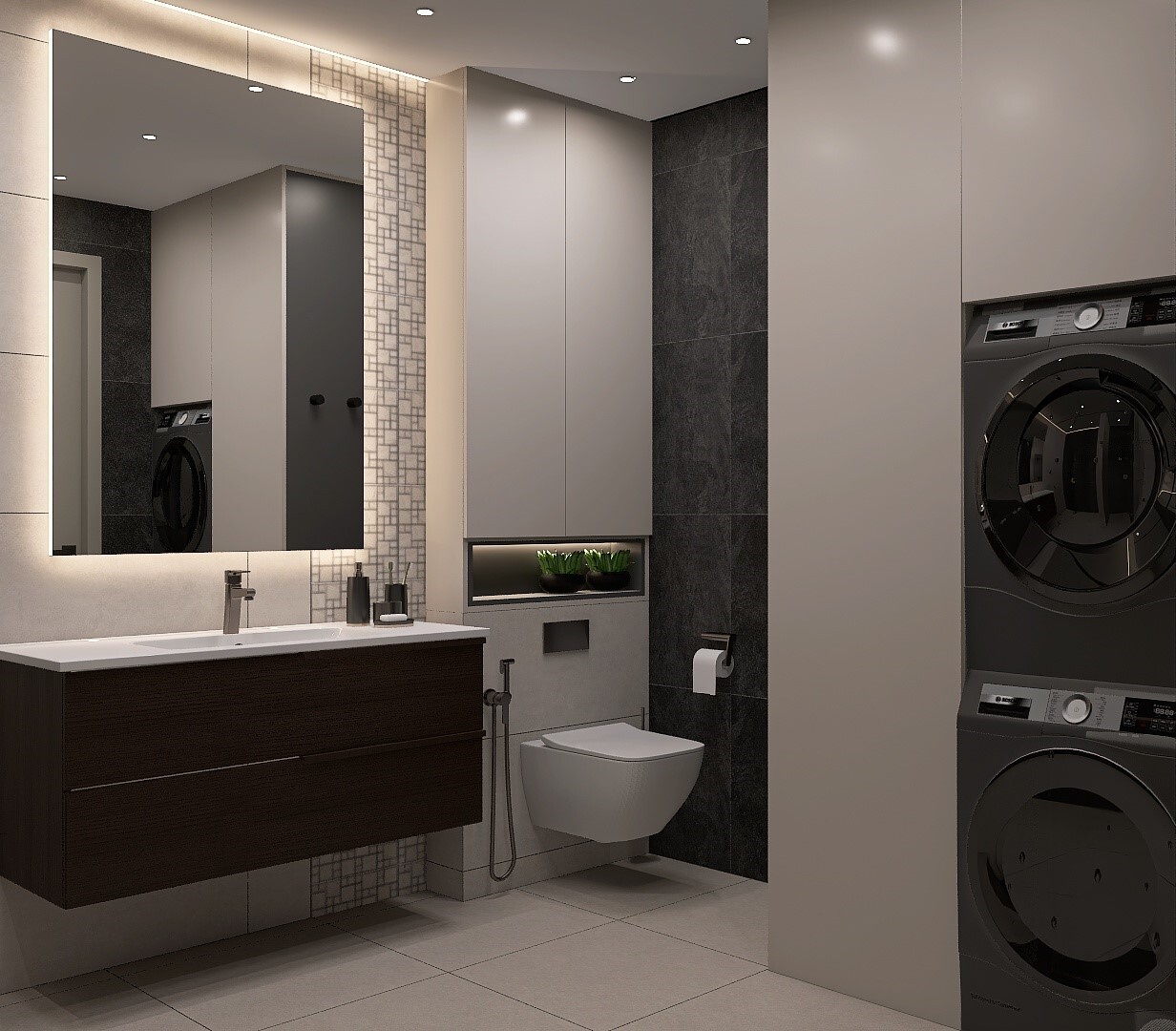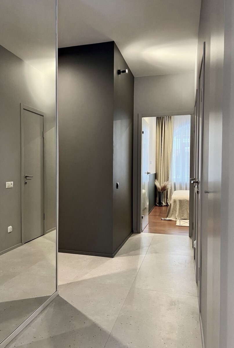 Заказчики мне сразу сказали, что нужно всё максимально строго, сдержанно, но элегантно. Холодные тона, но не с теплыми нотками. А еще приветствуется функциональность и практичность. И вот, что получилось на основе пожеланий. Проект уже реализован, новоселье отмечено.
