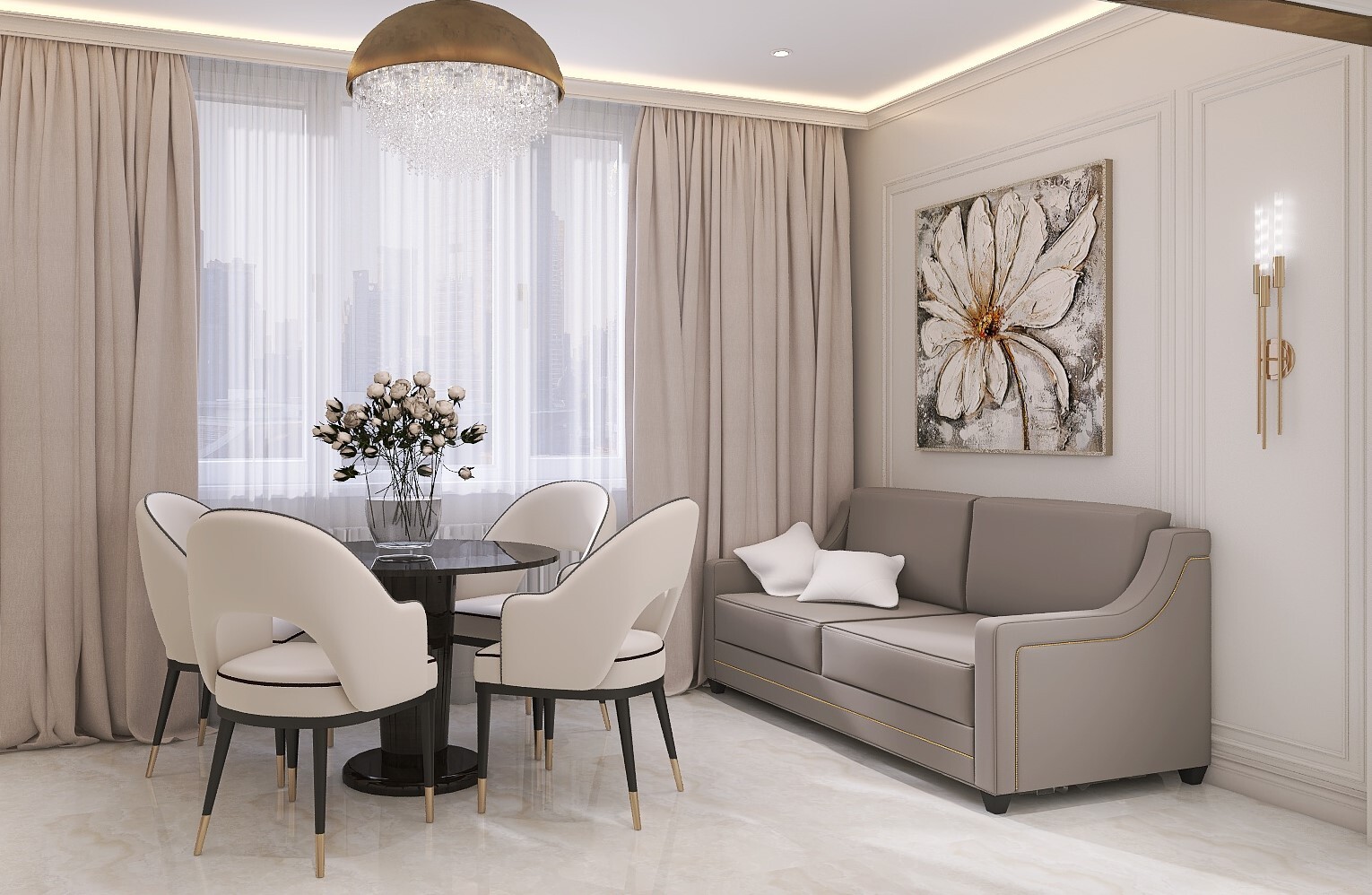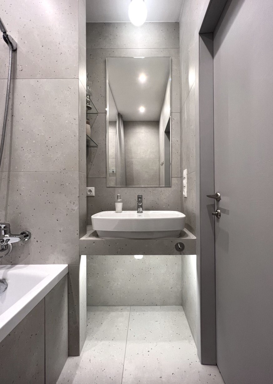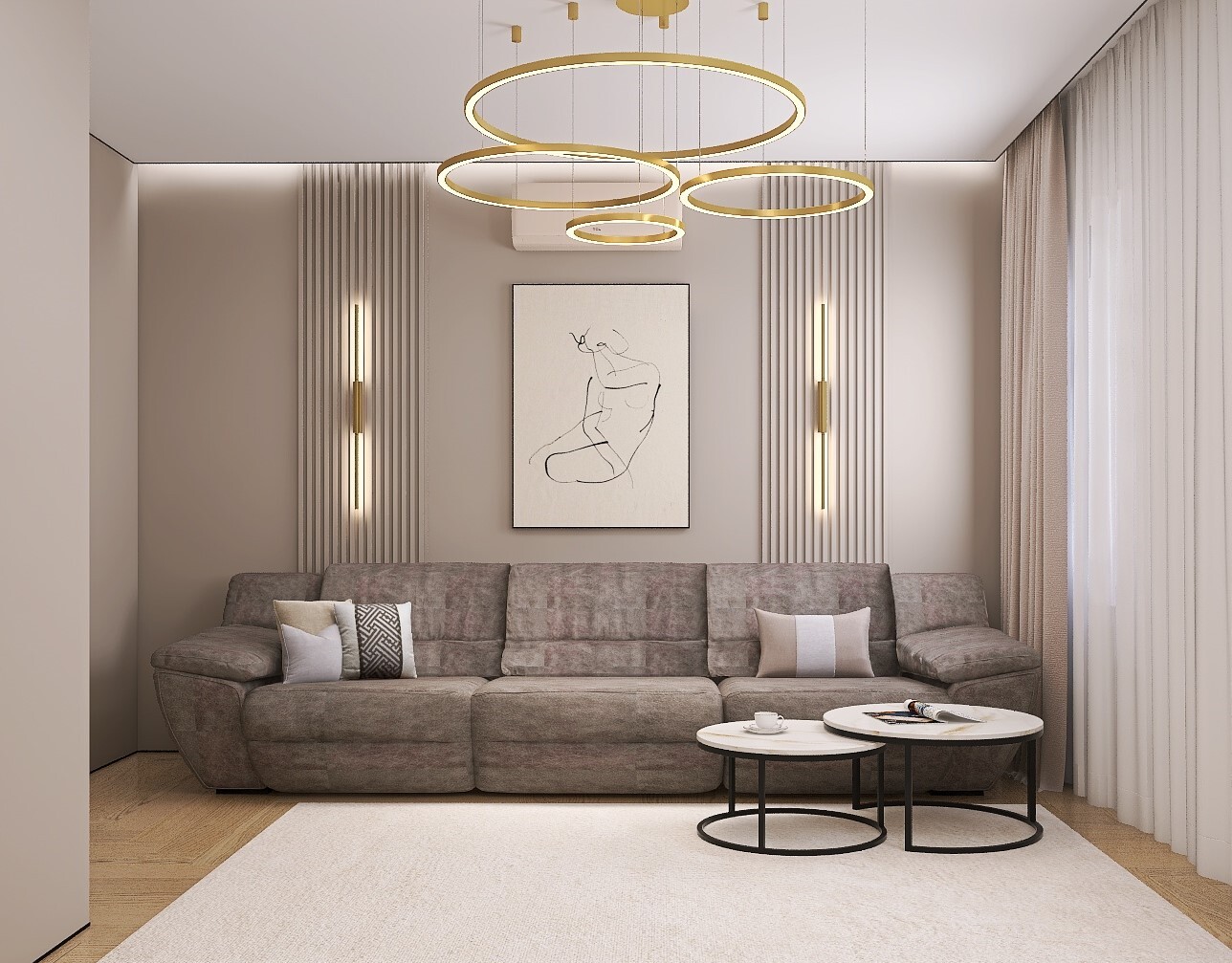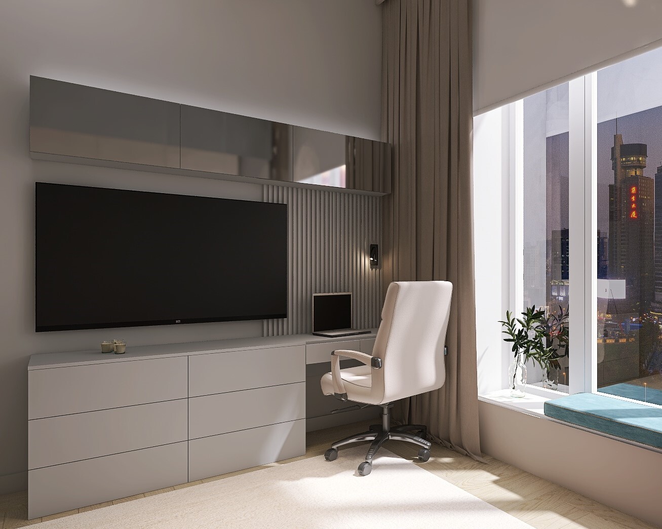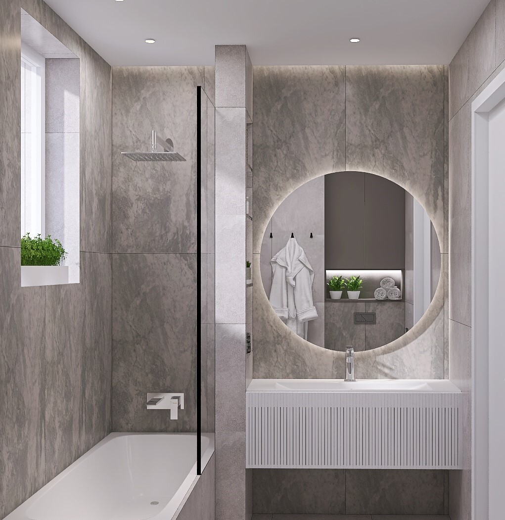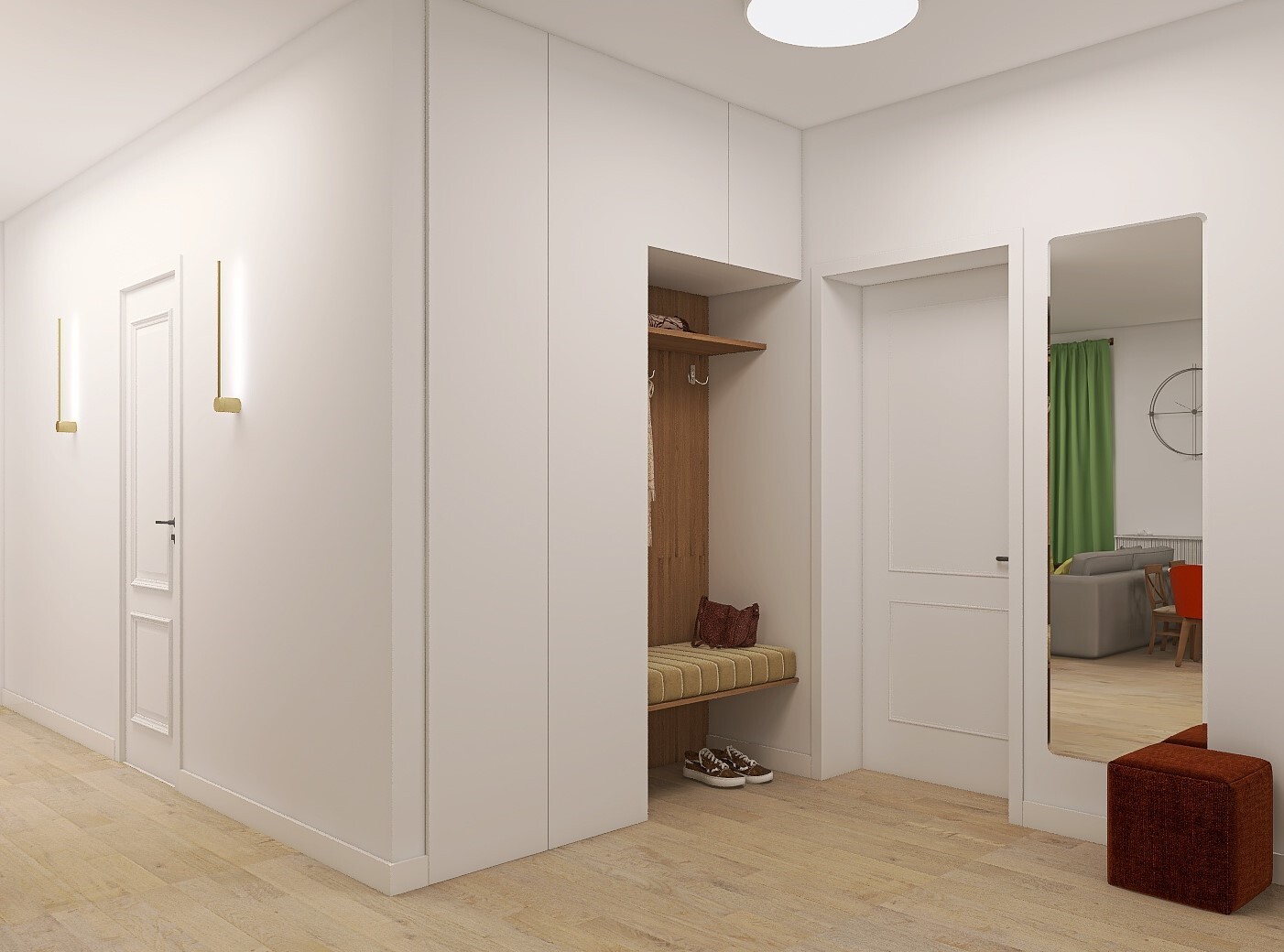 Заказчики мне сразу сказали, что нужно всё максимально строго, сдержанно, но элегантно. Холодные тона, но не с теплыми нотками. А еще приветствуется функциональность и практичность. И вот, что получилось на основе пожеланий. Проект уже реализован, новоселье отмечено.