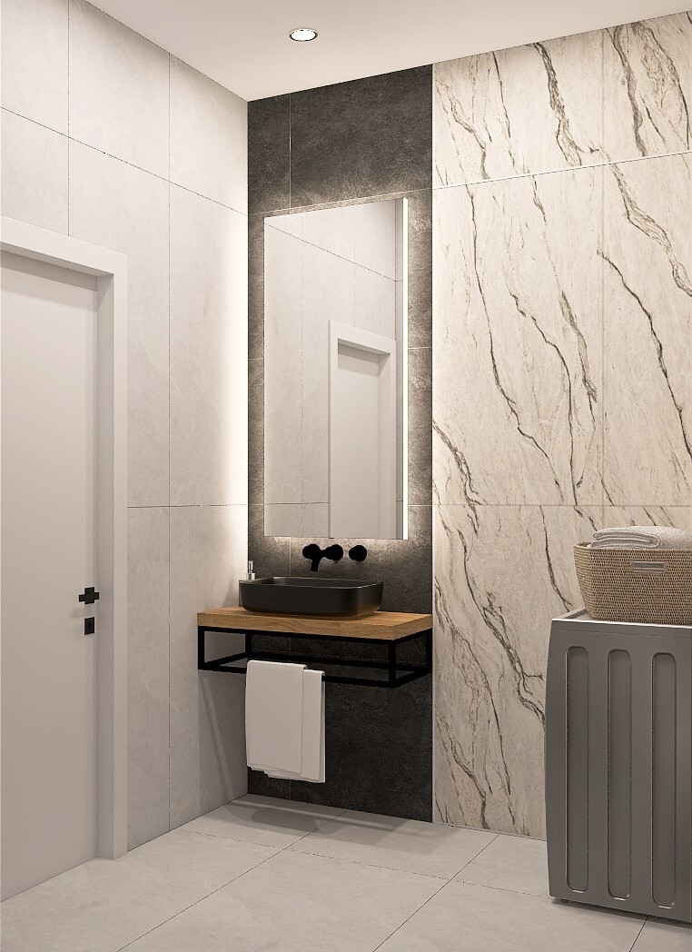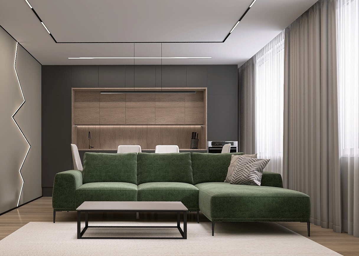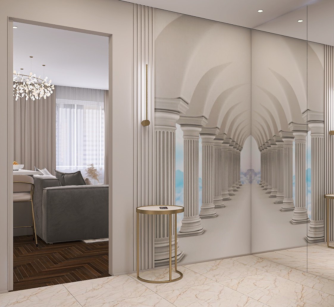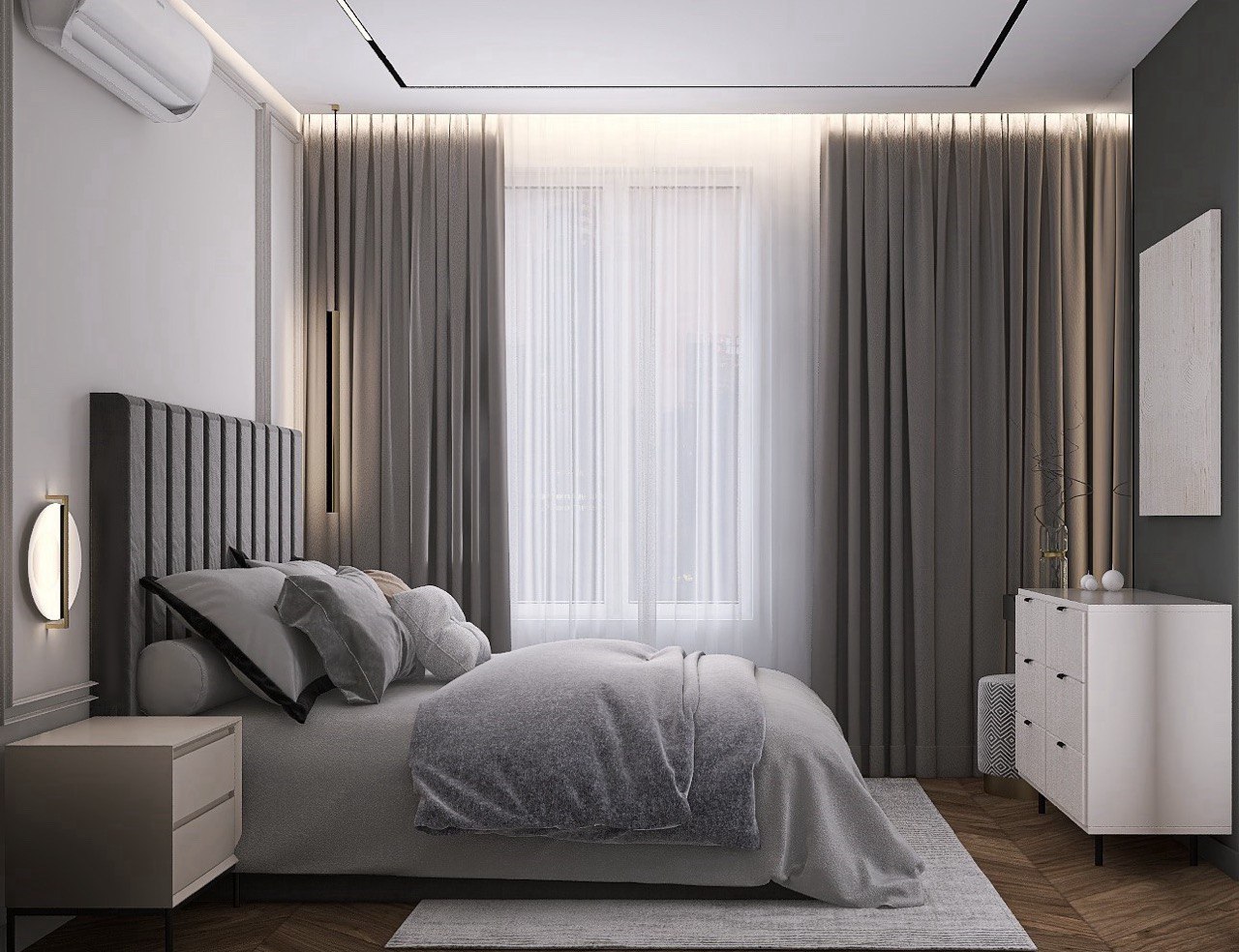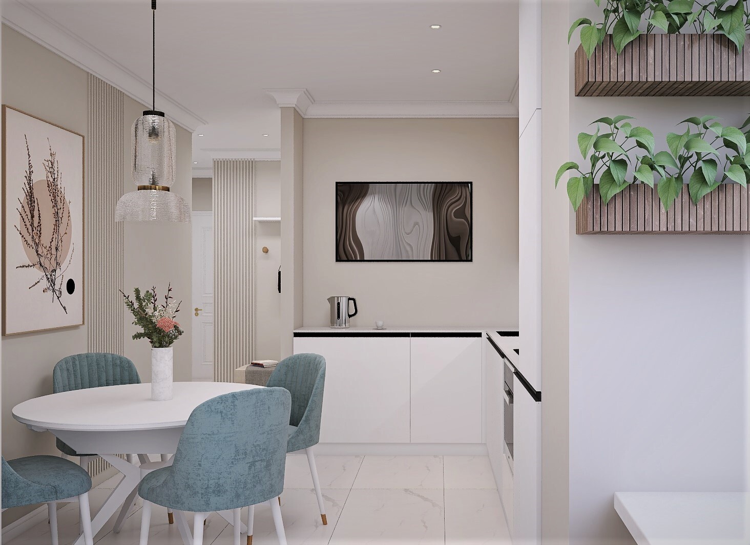 Заказчики мне сразу сказали, что нужно всё максимально строго, сдержанно, но элегантно. Холодные тона, но не с теплыми нотками. А еще приветствуется функциональность и практичность. И вот, что получилось на основе пожеланий. Проект уже реализован, новоселье отмечено.