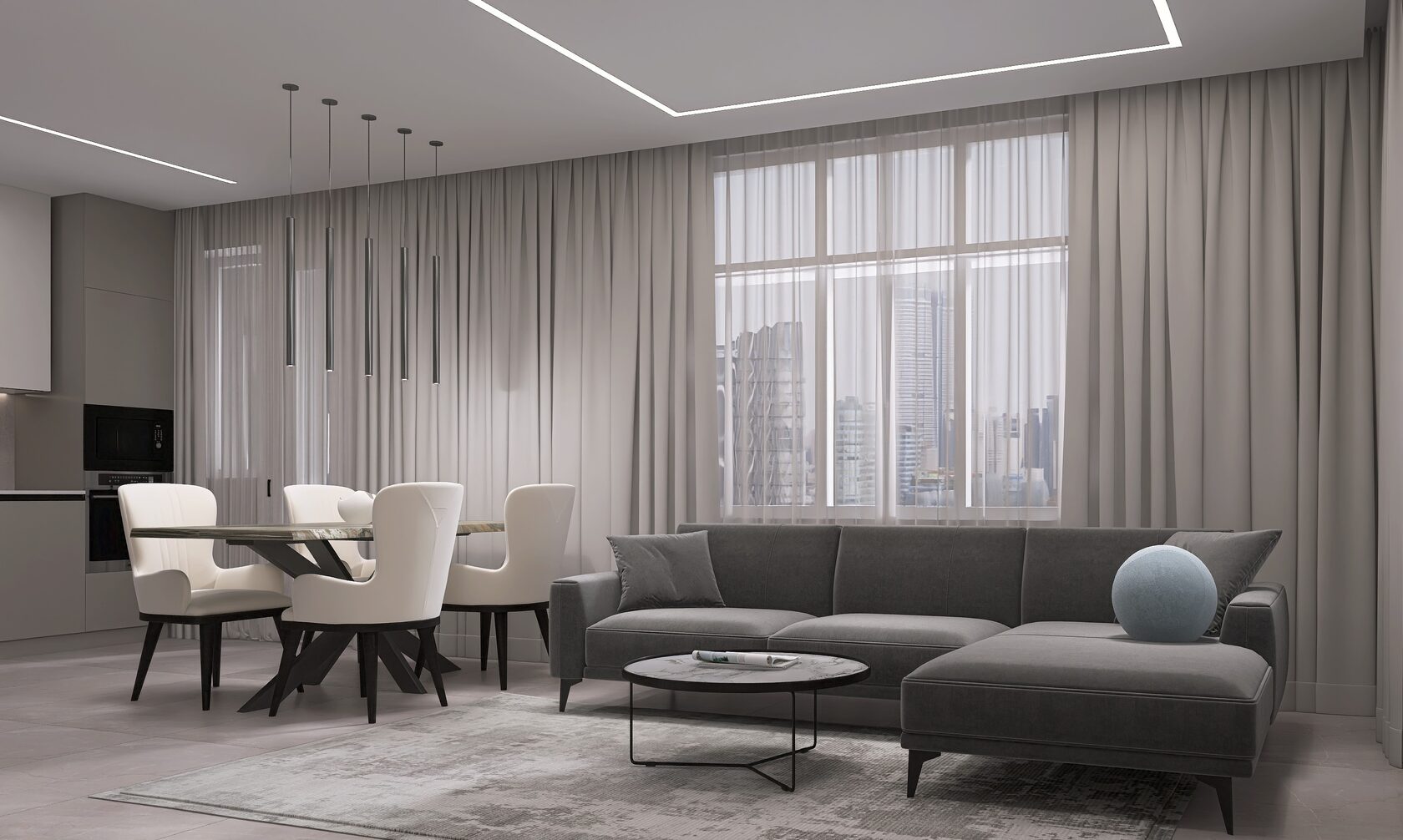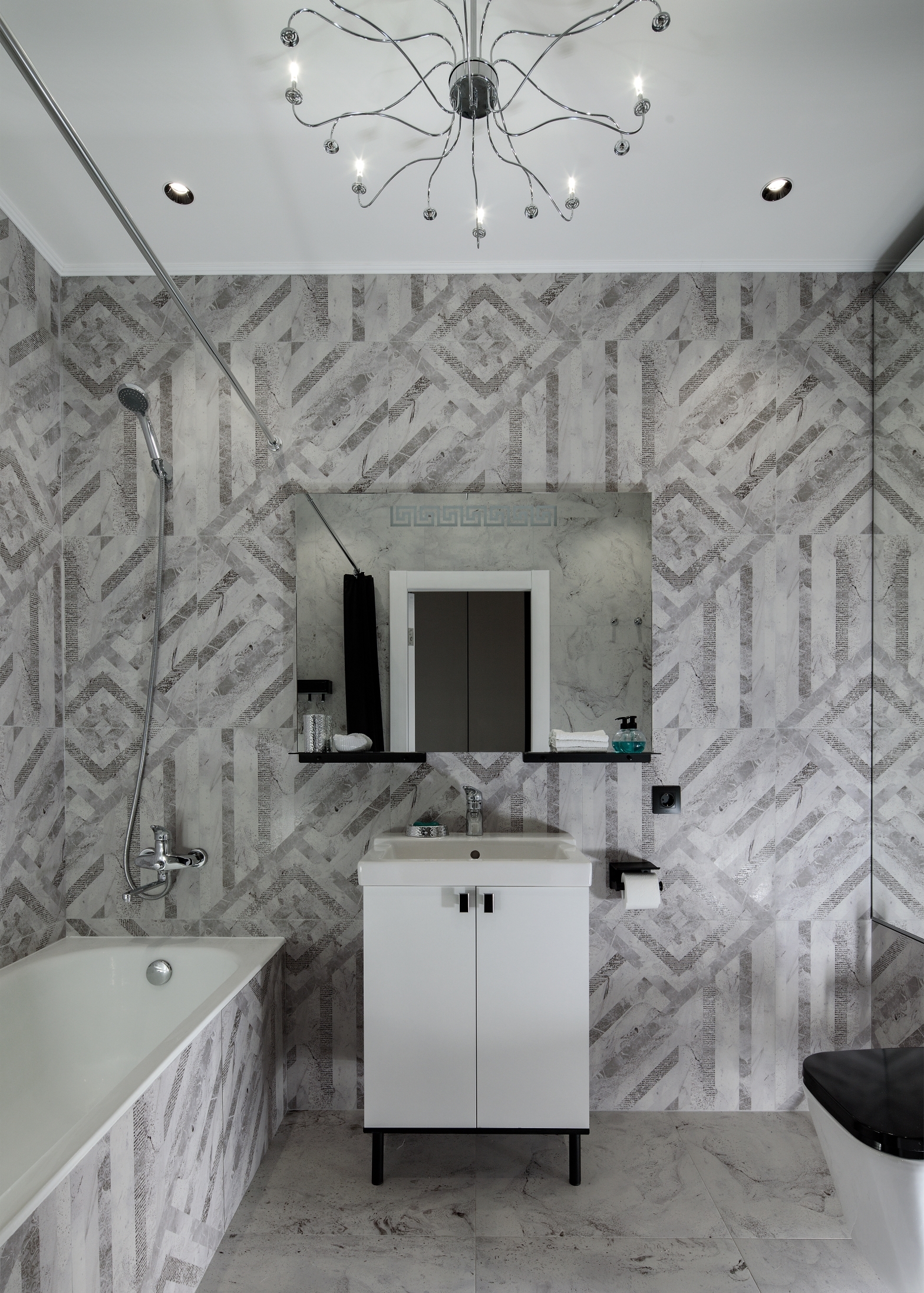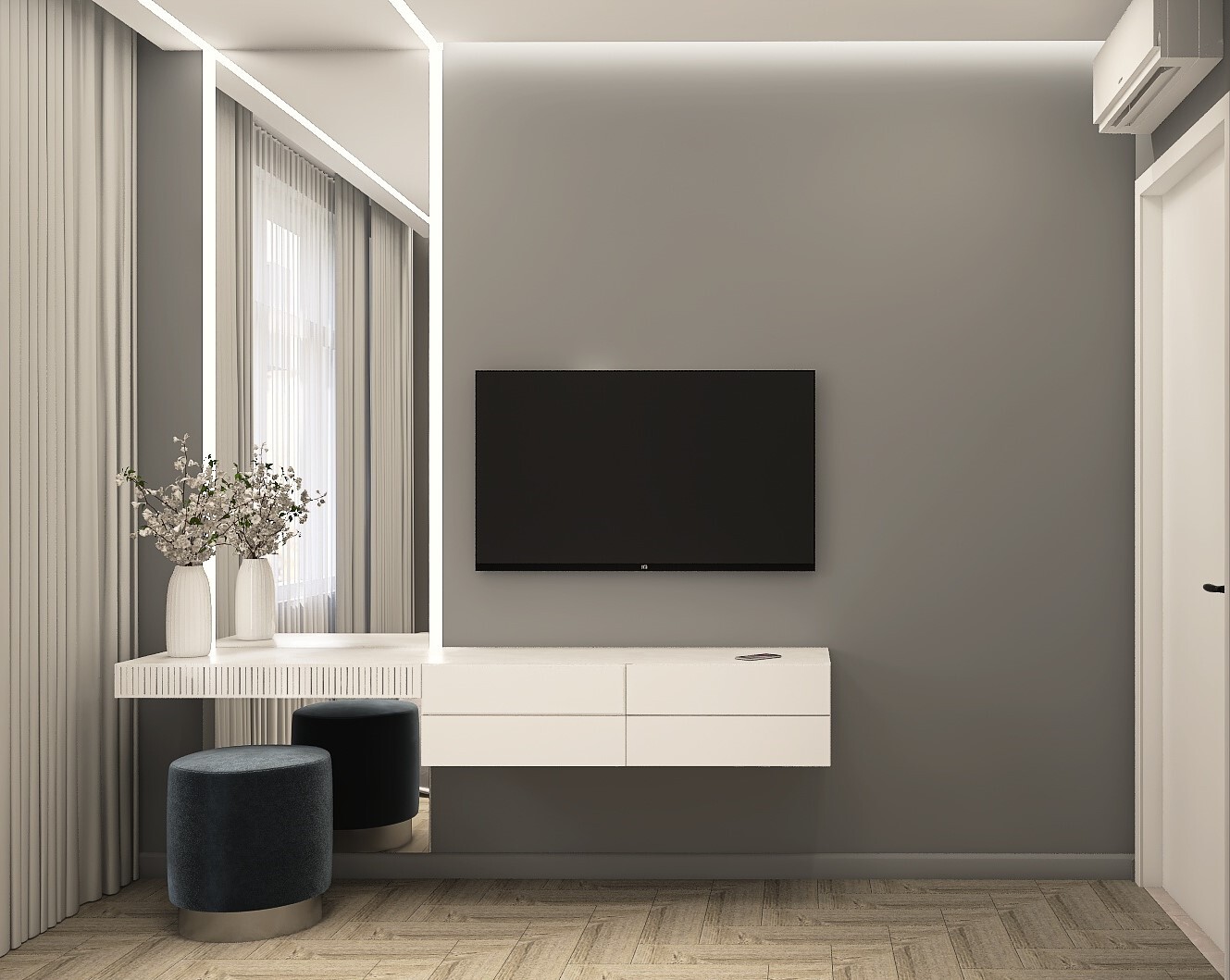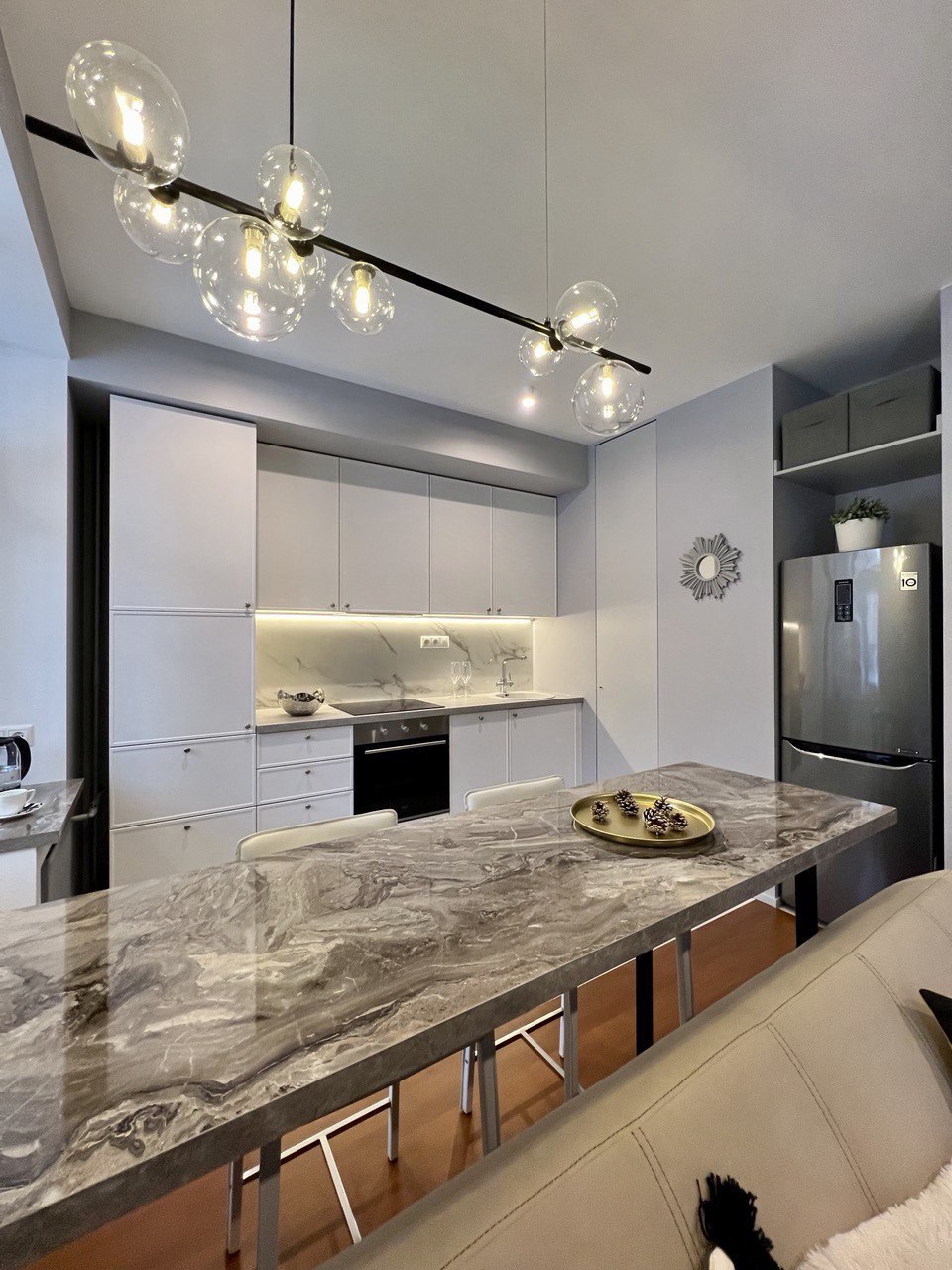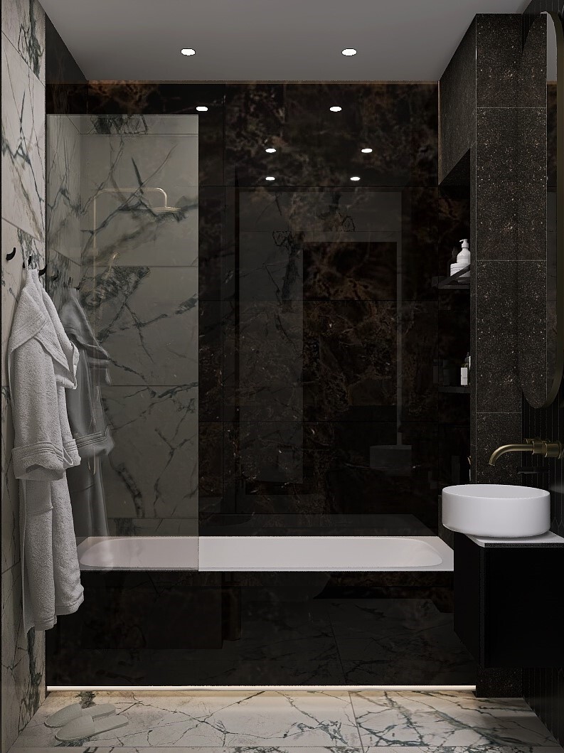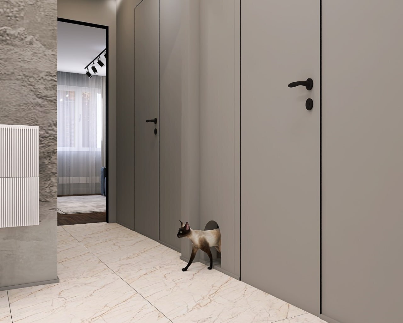 Заказчики мне сразу сказали, что нужно всё максимально строго, сдержанно, но элегантно. Холодные тона, но не с теплыми нотками. А еще приветствуется функциональность и практичность. И вот, что получилось на основе пожеланий. Проект уже реализован, новоселье отмечено.