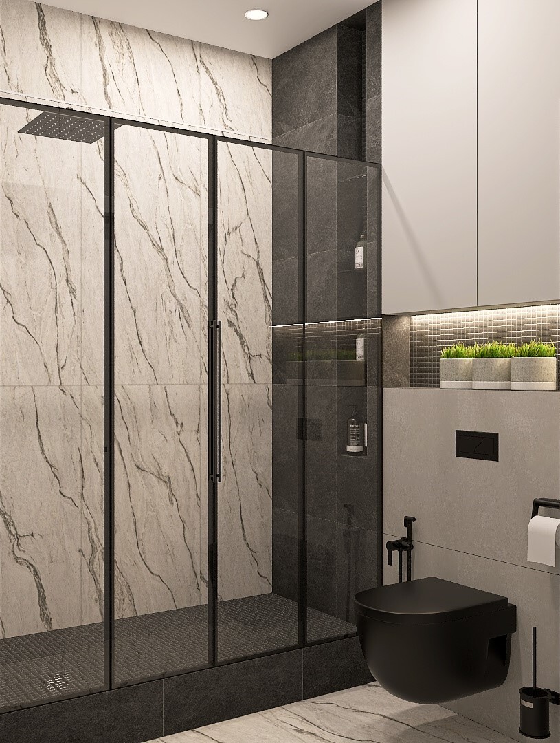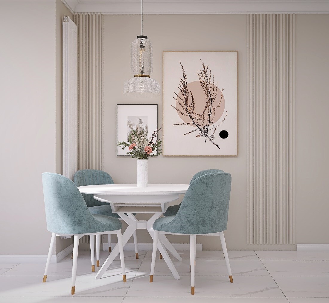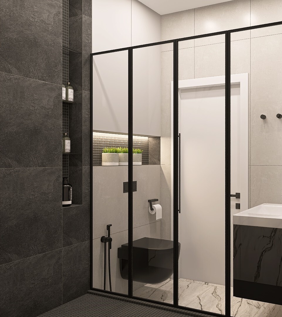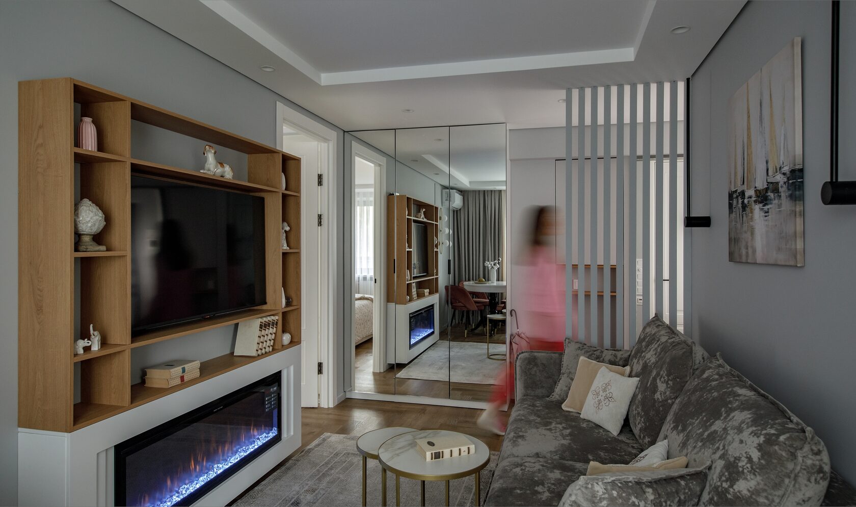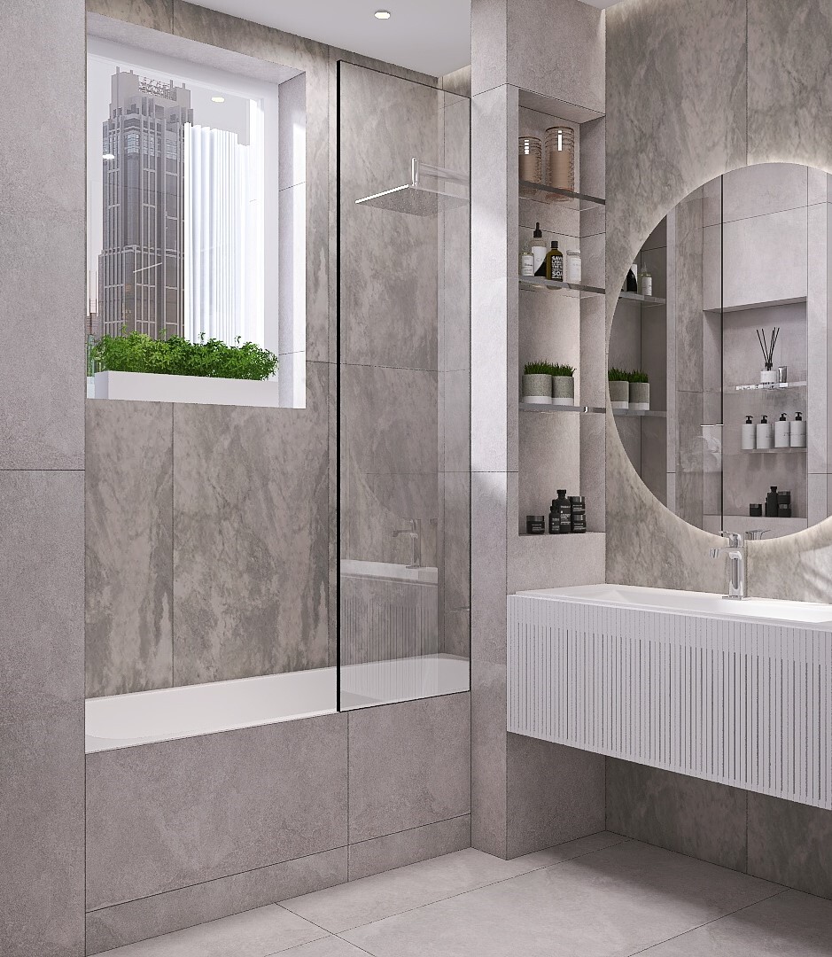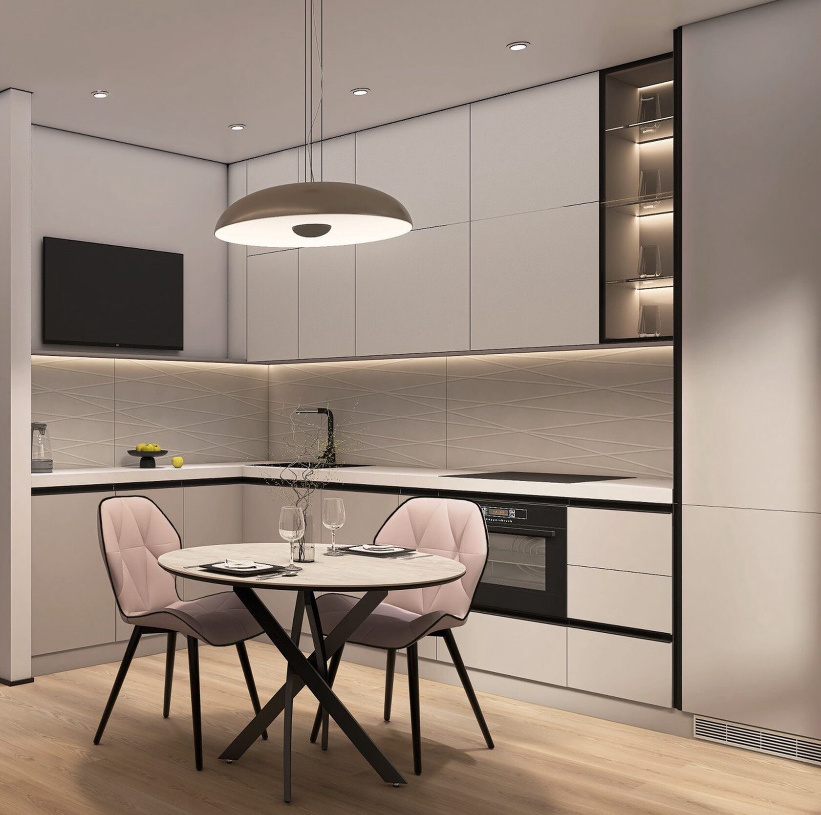 Заказчики мне сразу сказали, что нужно всё максимально строго, сдержанно, но элегантно. Холодные тона, но не с теплыми нотками. А еще приветствуется функциональность и практичность. И вот, что получилось на основе пожеланий. Проект уже реализован, новоселье отмечено.