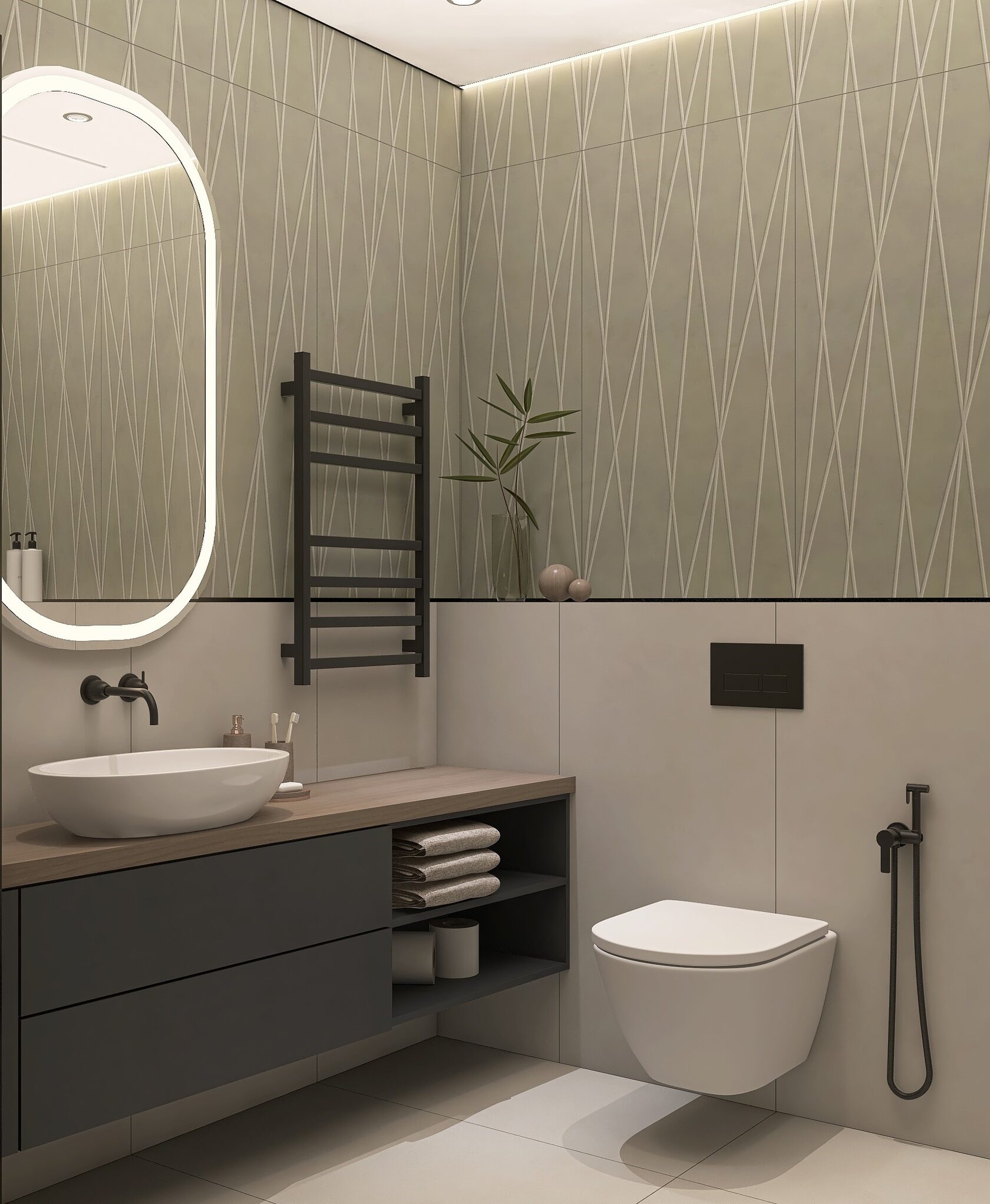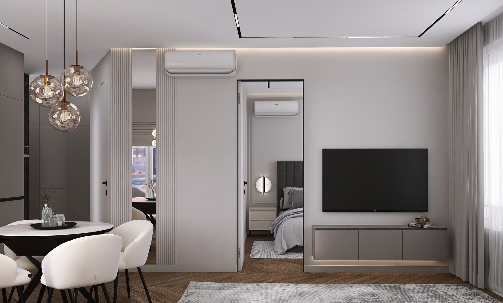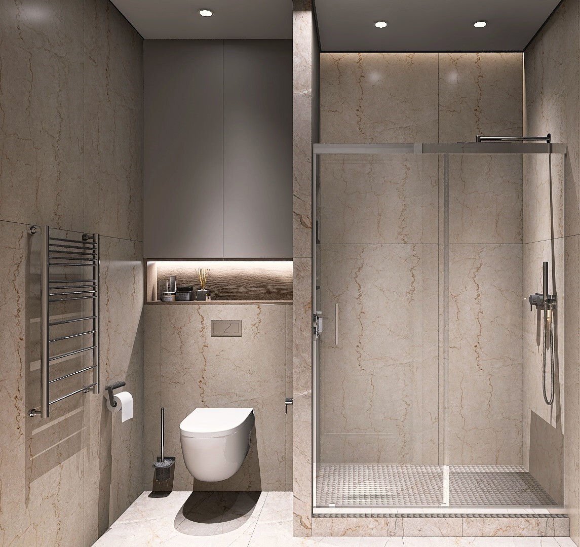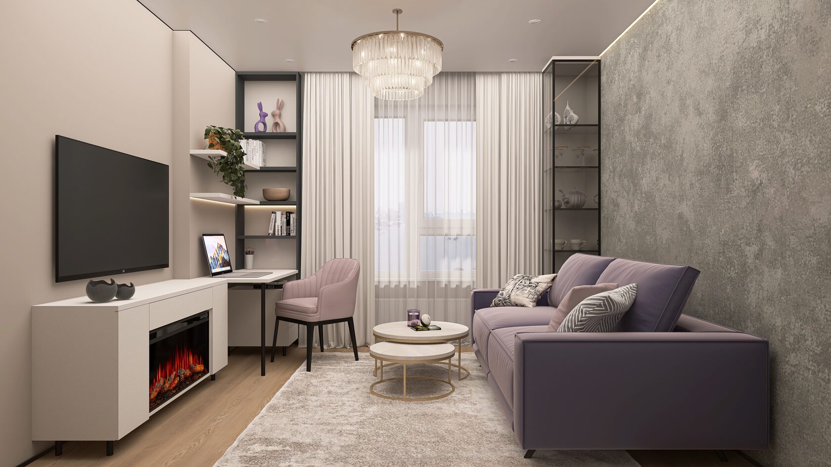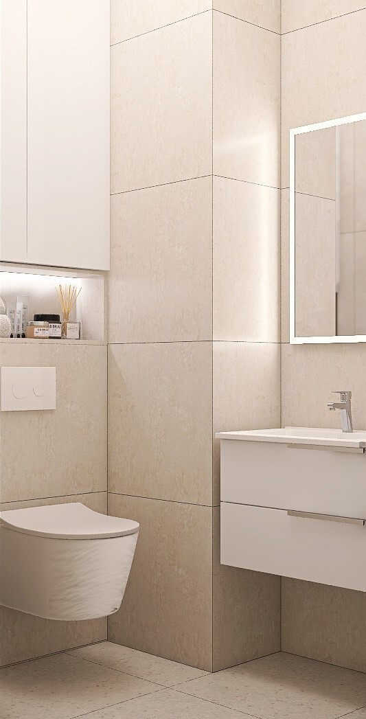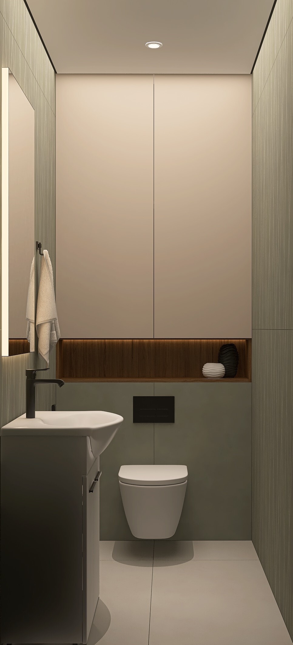 Заказчики мне сразу сказали, что нужно всё максимально строго, сдержанно, но элегантно. Холодные тона, но не с теплыми нотками. А еще приветствуется функциональность и практичность. И вот, что получилось на основе пожеланий. Проект уже реализован, новоселье отмечено.