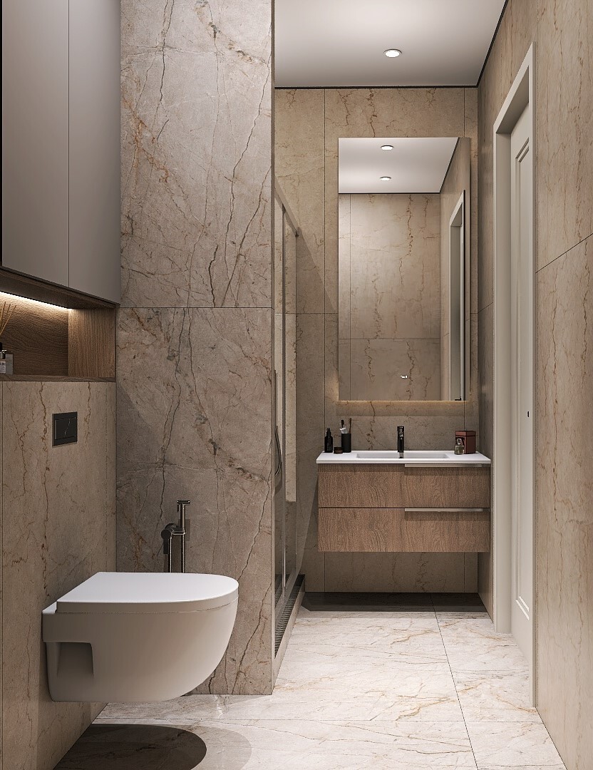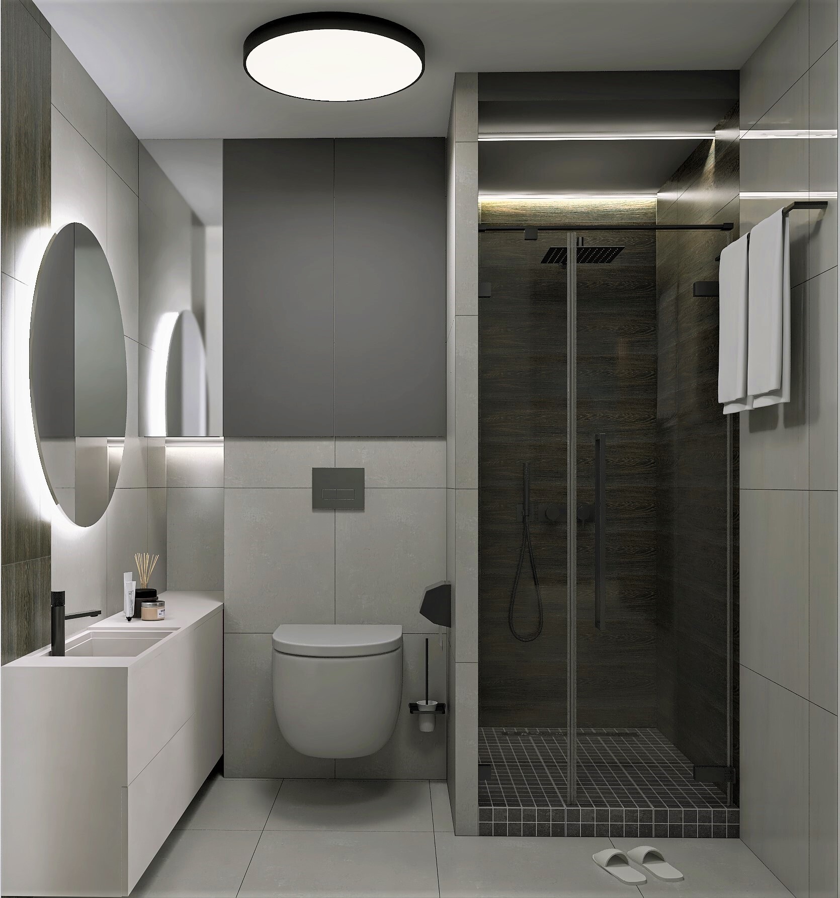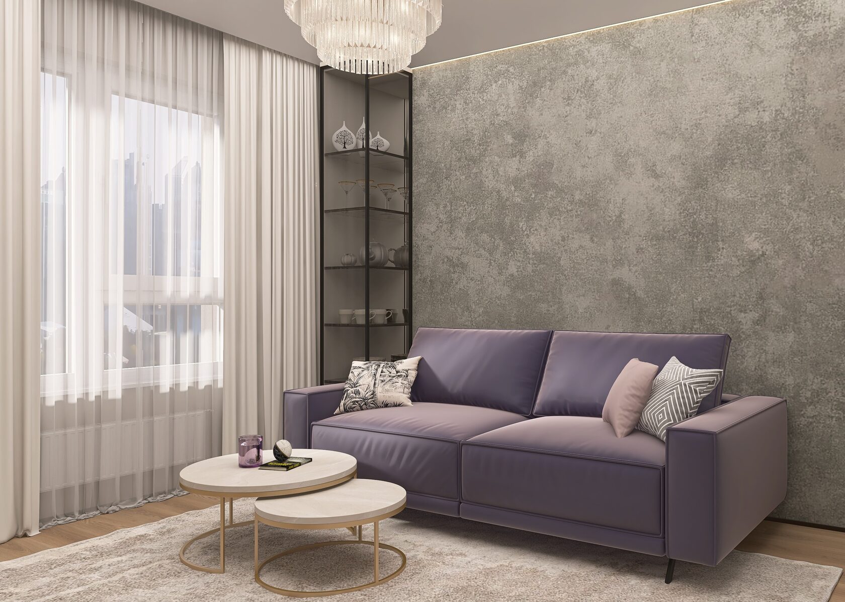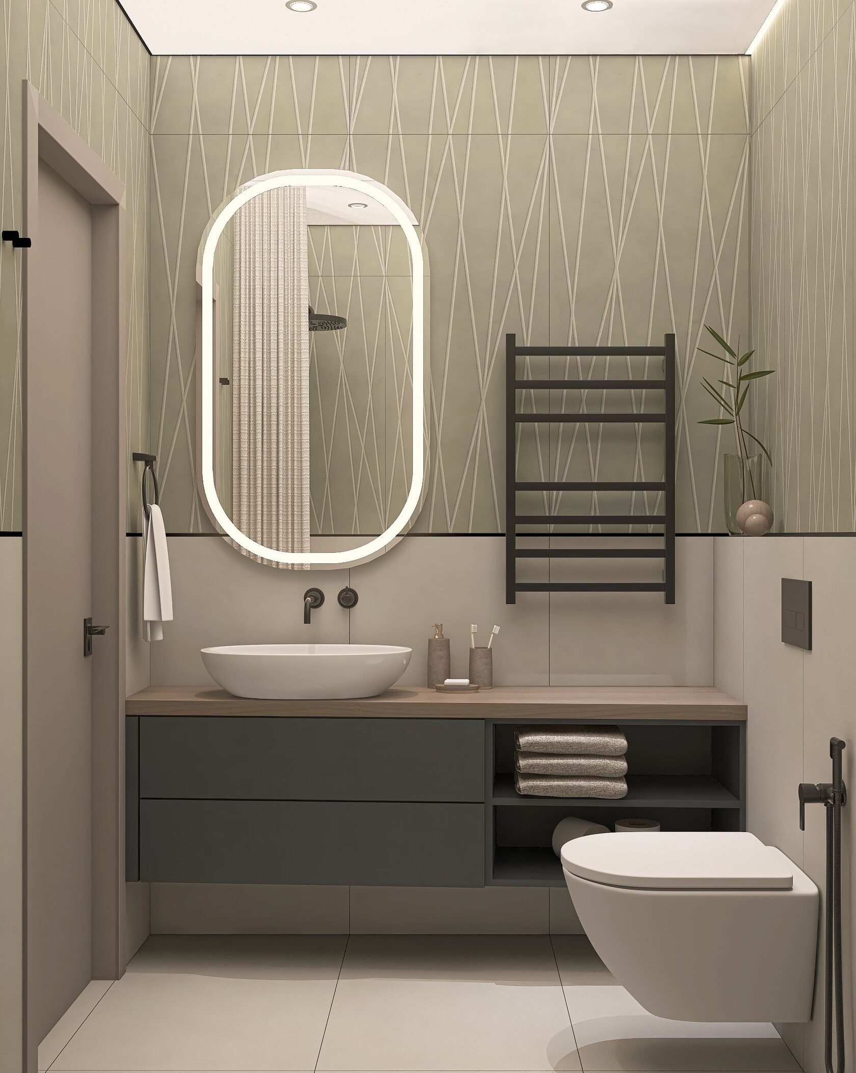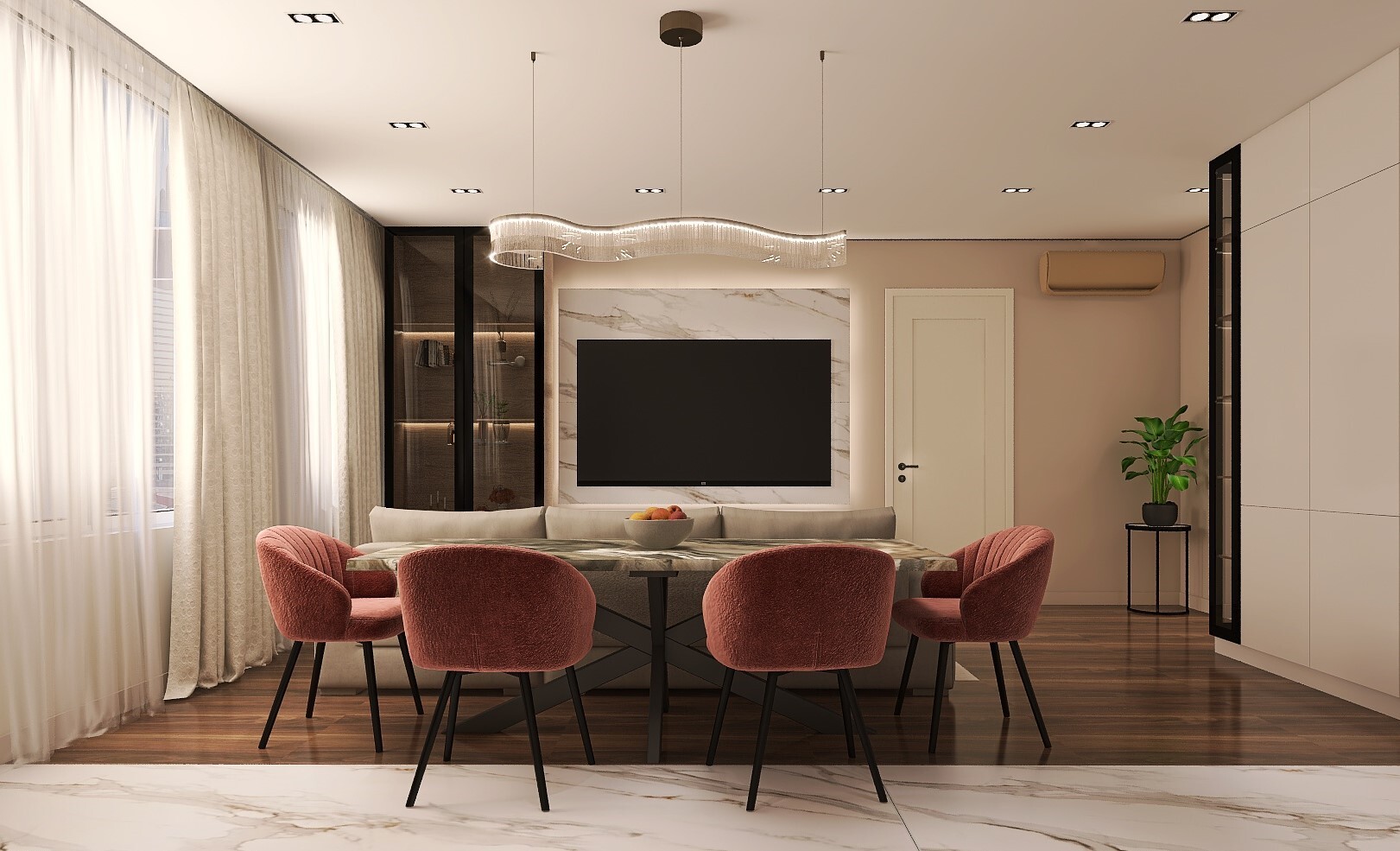 Заказчики мне сразу сказали, что нужно всё максимально строго, сдержанно, но элегантно. Холодные тона, но не с теплыми нотками. А еще приветствуется функциональность и практичность. И вот, что получилось на основе пожеланий. Проект уже реализован, новоселье отмечено.