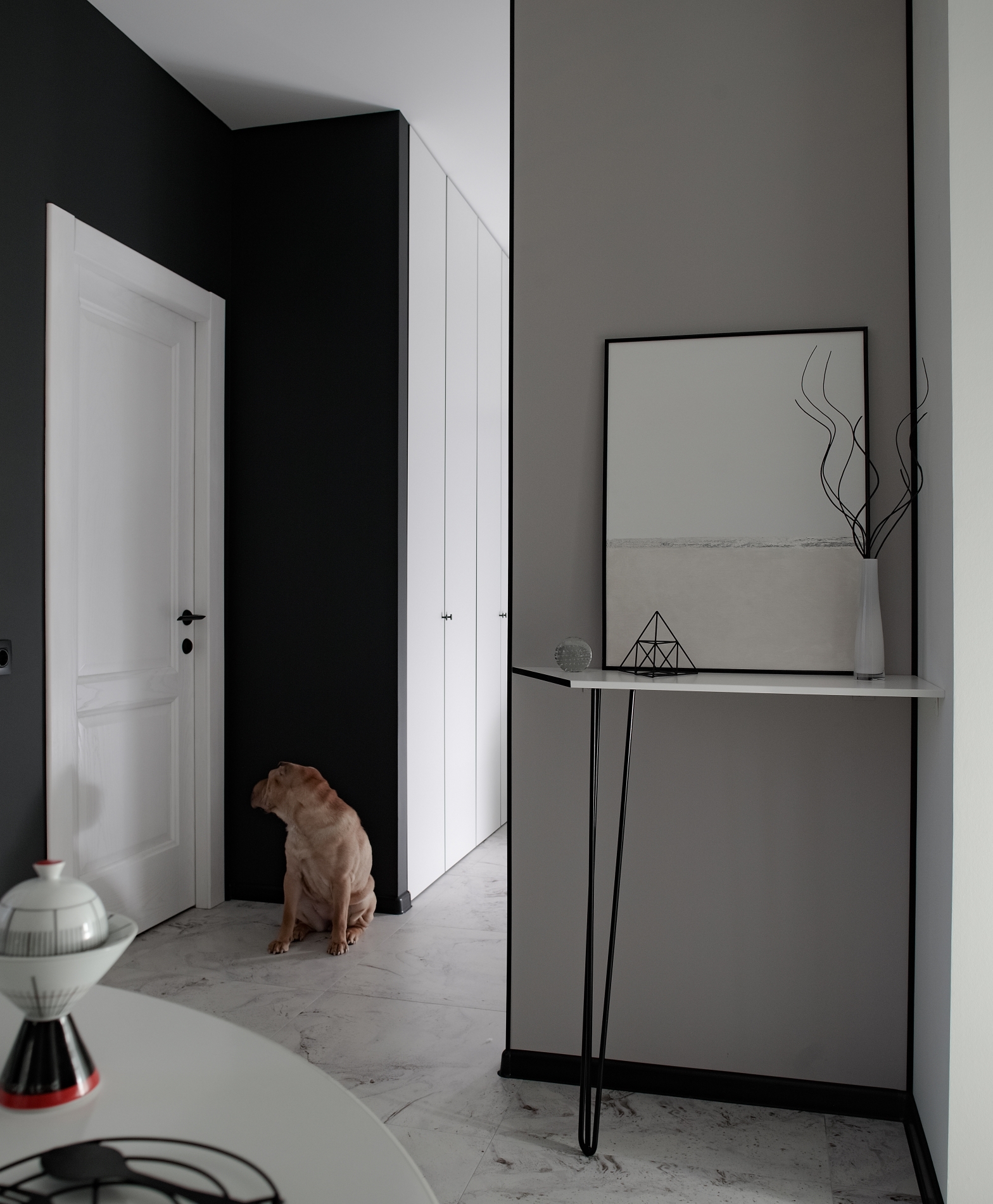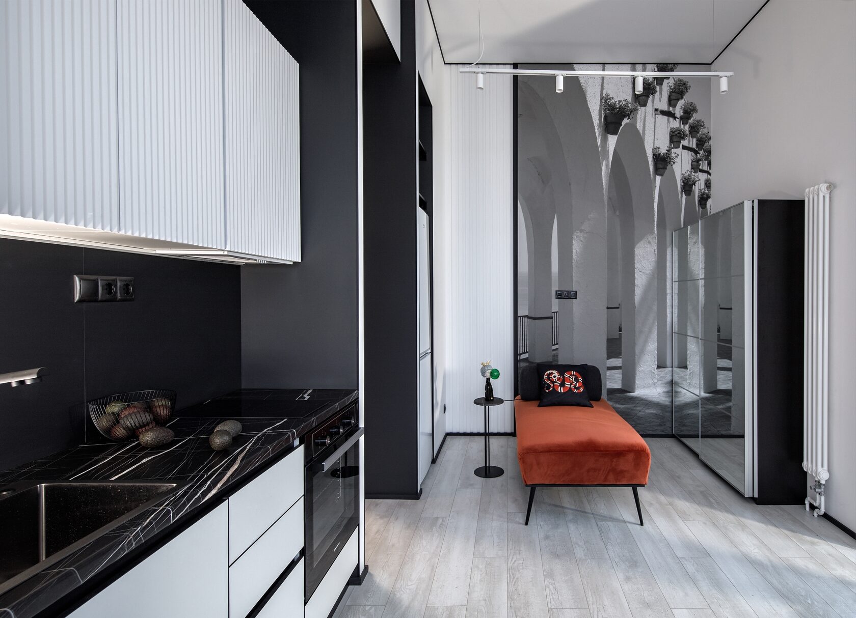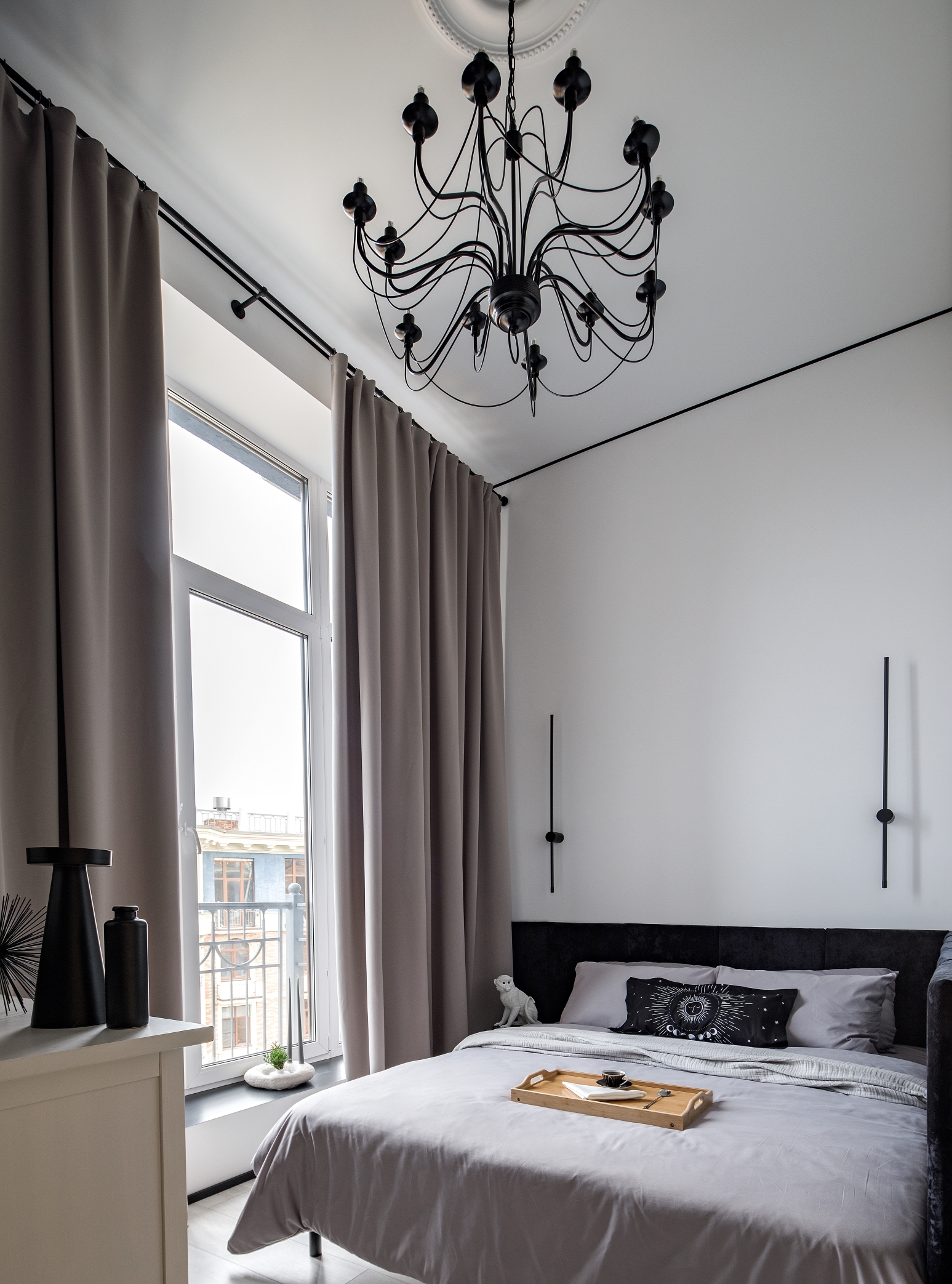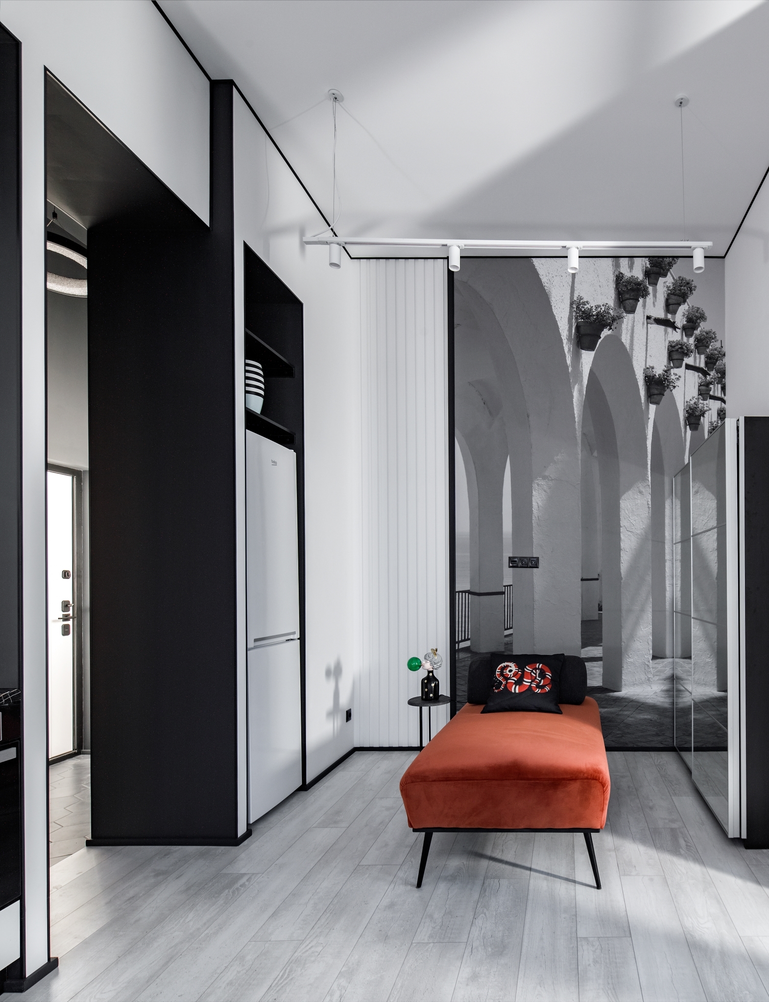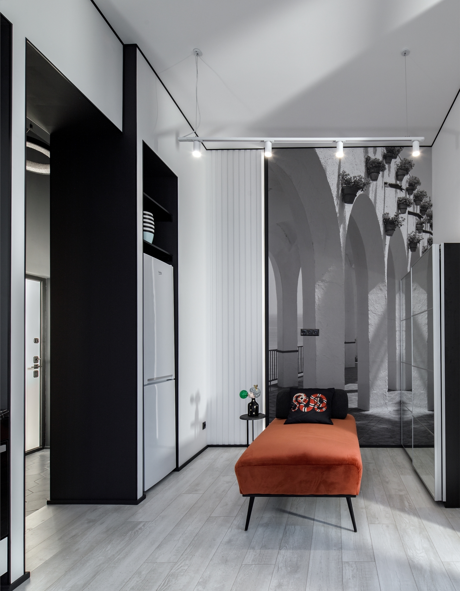Интерьер этой квартиры построен на черно-белых контрастах, которые дополняют яркие детали и огромная фреска. Квартира расположена на последнем этаже и выделяется своими потолками высотой 3,7 метра и высокими окнами, что дало возможность «поиграть» с пространством и светом. В интерьере совместили французскую классику, лофт и современный стиль. Фото Сергей Моргунов