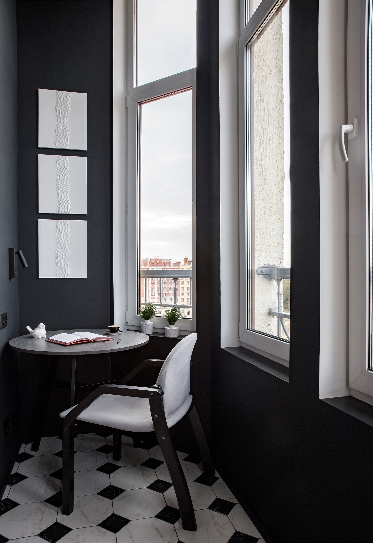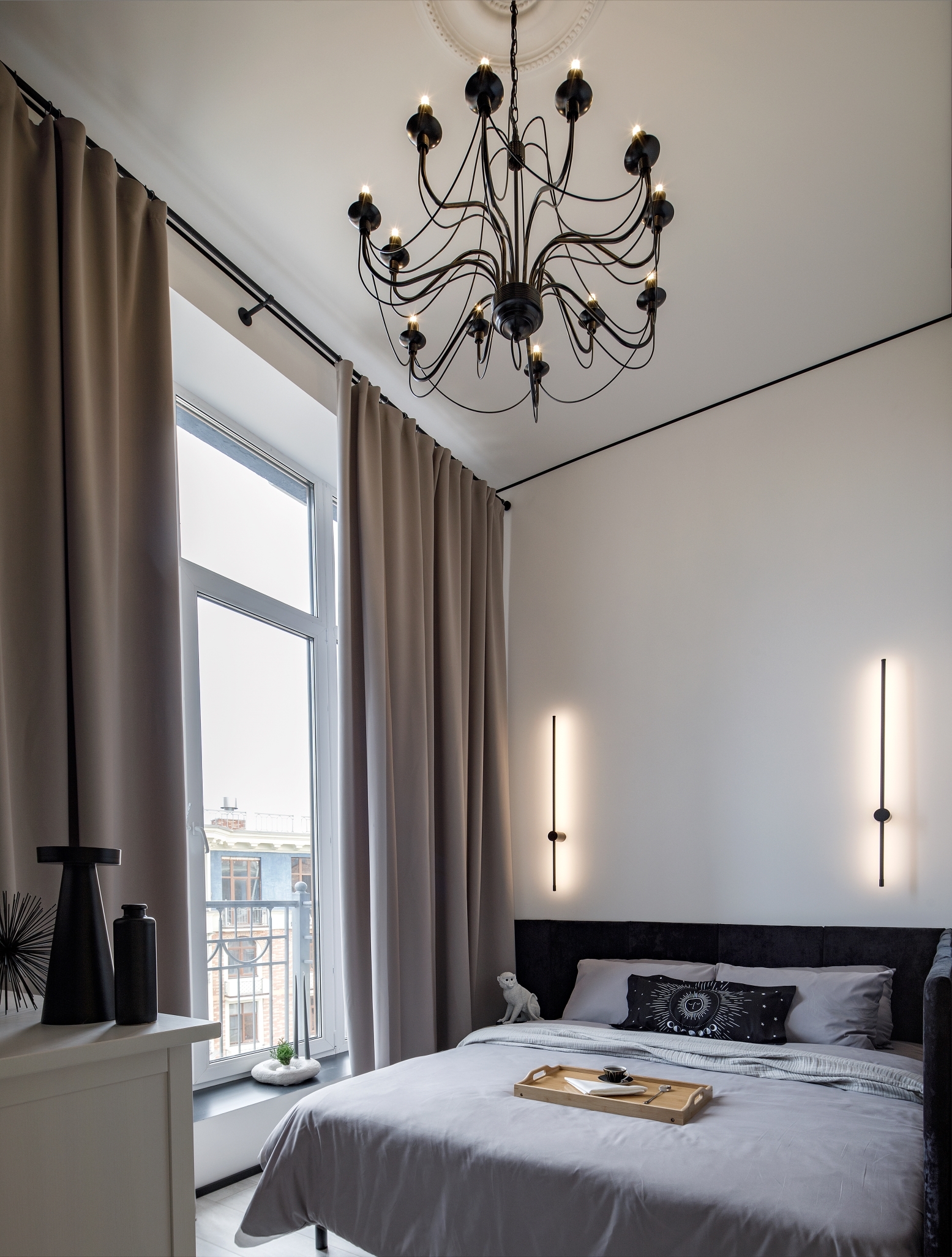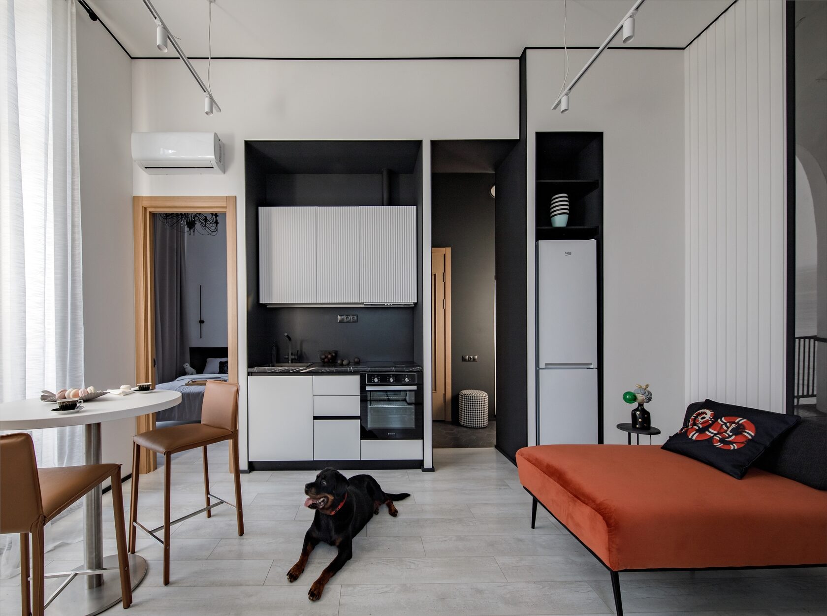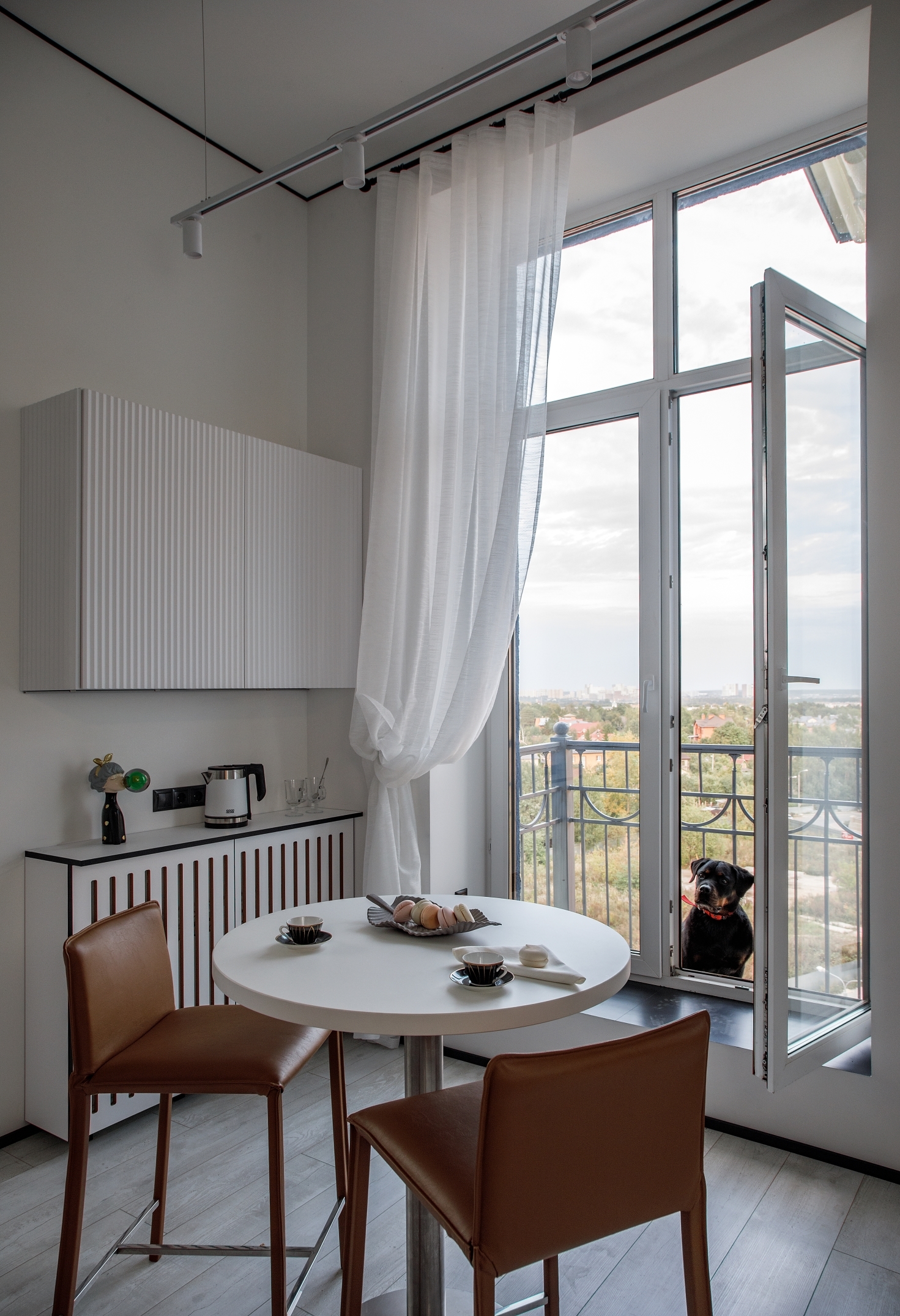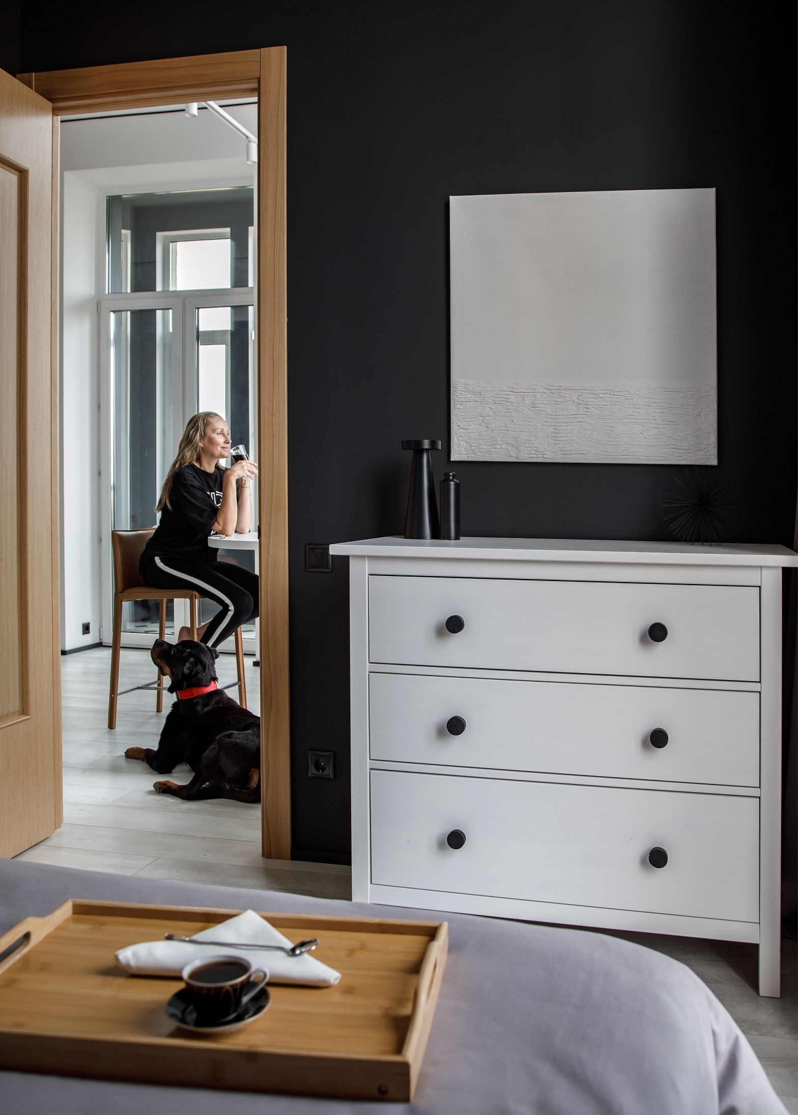 Интерьер этой квартиры построен на черно-белых контрастах, которые дополняют яркие детали и огромная фреска. Квартира расположена на последнем этаже и выделяется своими потолками высотой 3,7 метра и высокими окнами, что дало возможность «поиграть» с пространством и светом. В интерьере совместили французскую классику, лофт и современный стиль. Фото Сергей Моргунов
