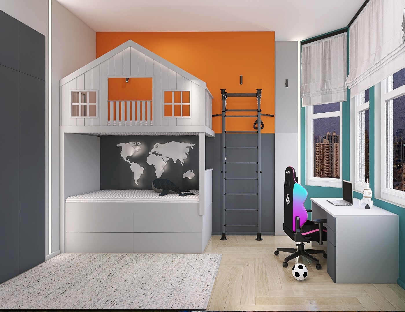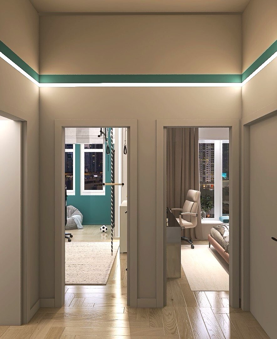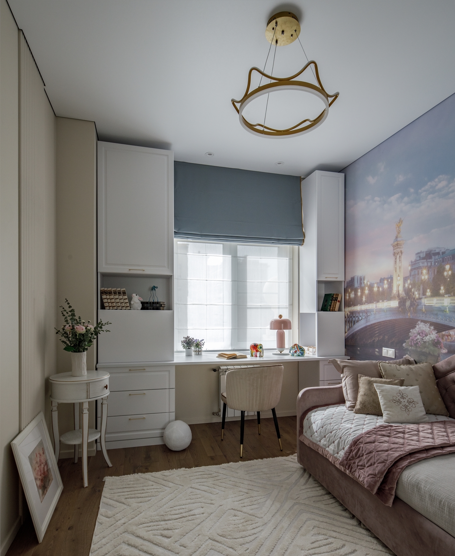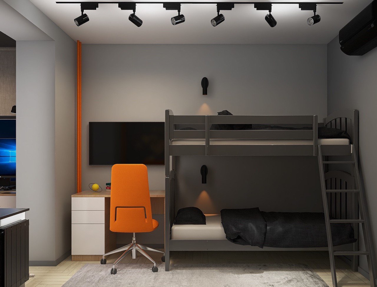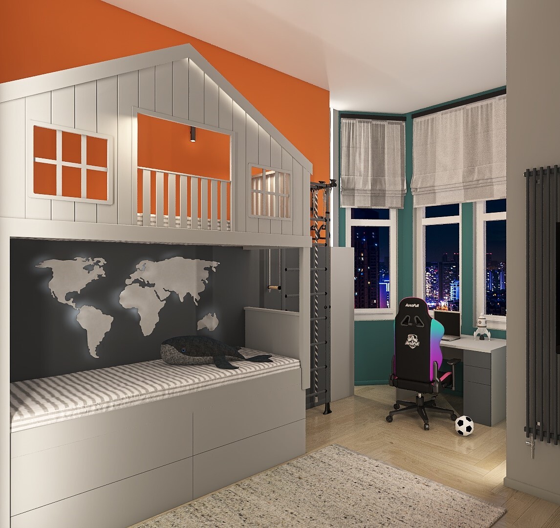 Высокие потолки 3.7 м запустили фантазию и заказчики пришли ко мне с главным пожеланием - сделать второй этаж. Но пришлось их переубедить, ведь для двух этажей надо не менее 4.5 м. Поэтому в квартире получилась только антресольная полка для папы - чтобы, не мешая никому, играть в компьютерные игры. В маленькой спальне поставили кровать-трансформер, а сыну придумали интерактивную двухярусную кровать.