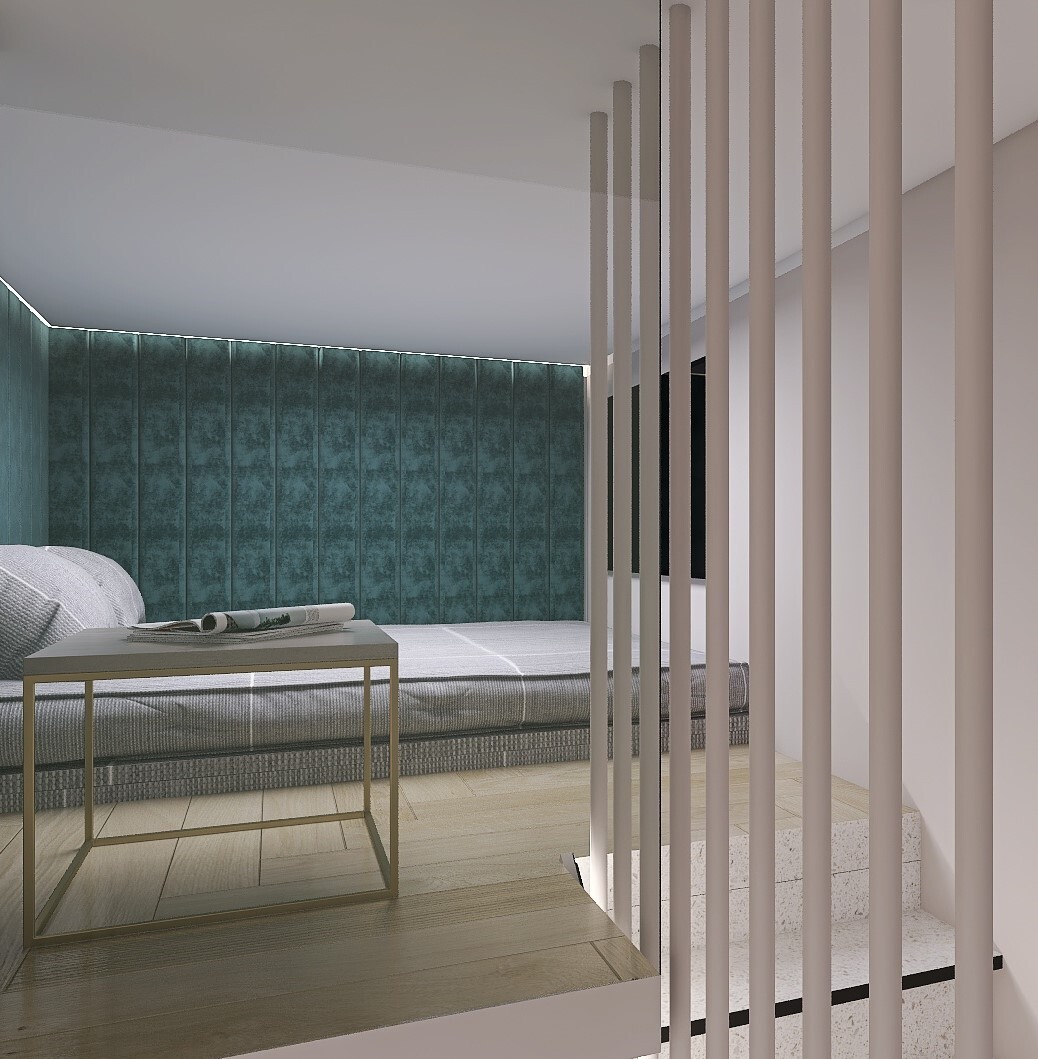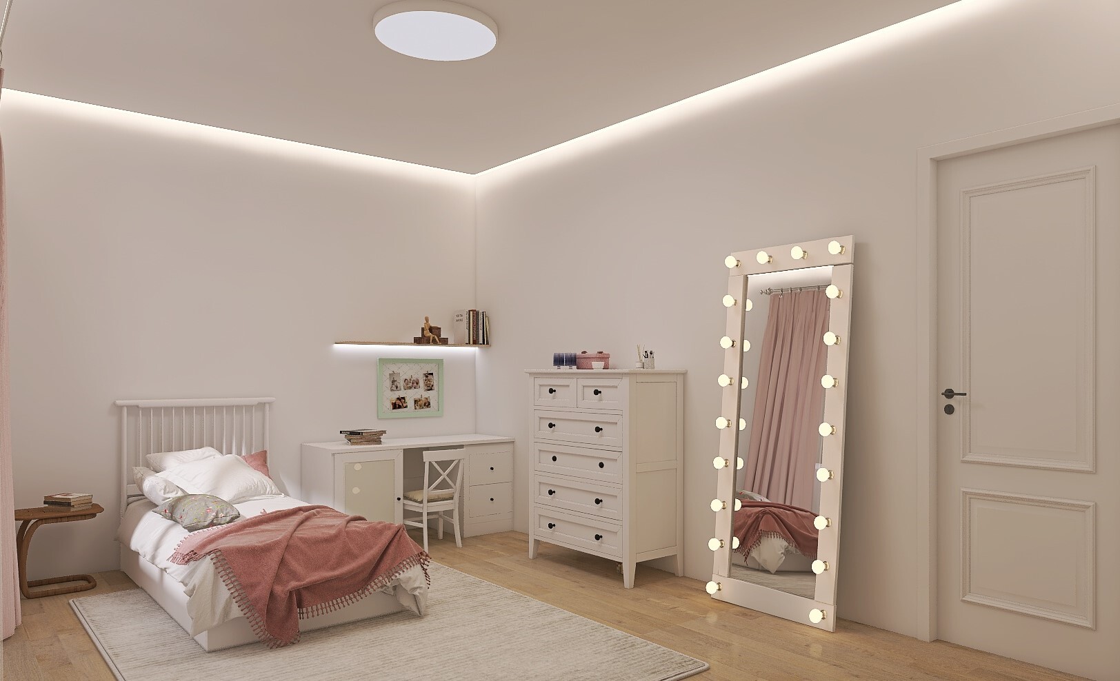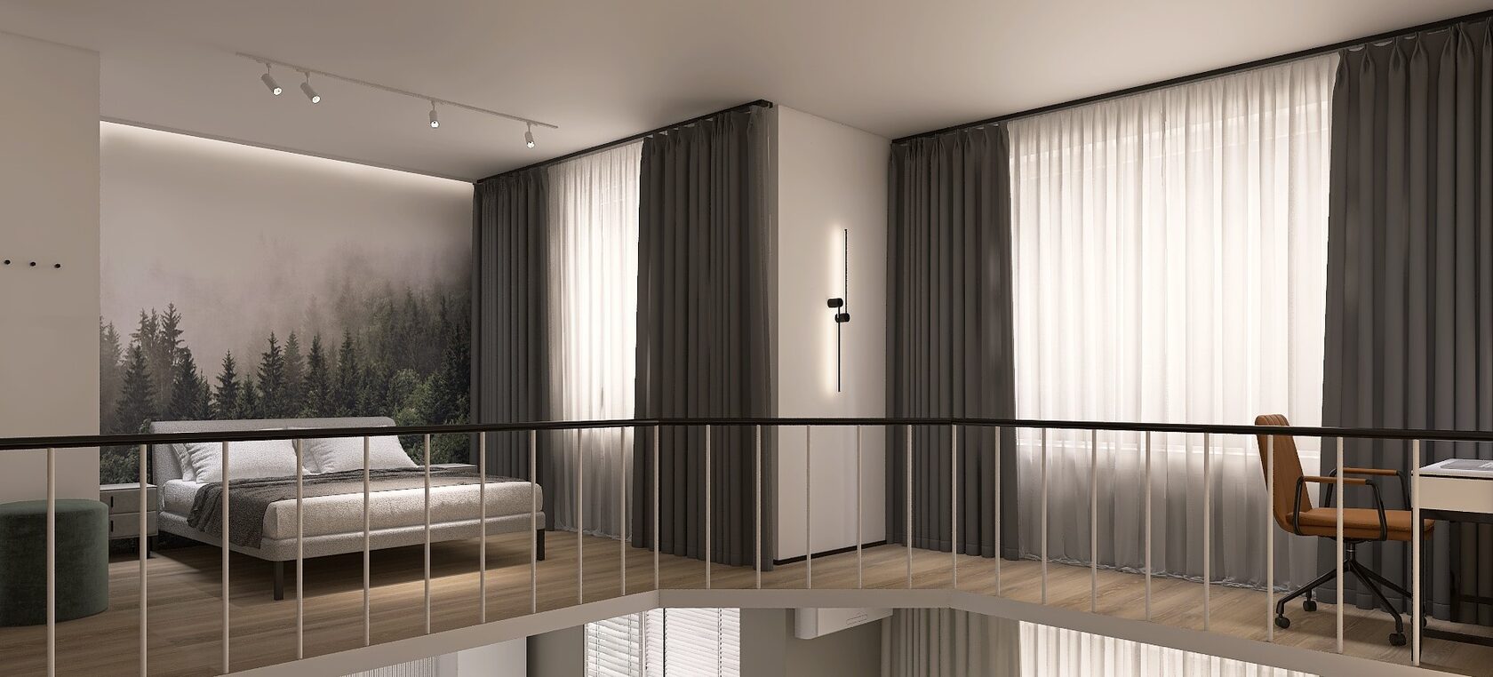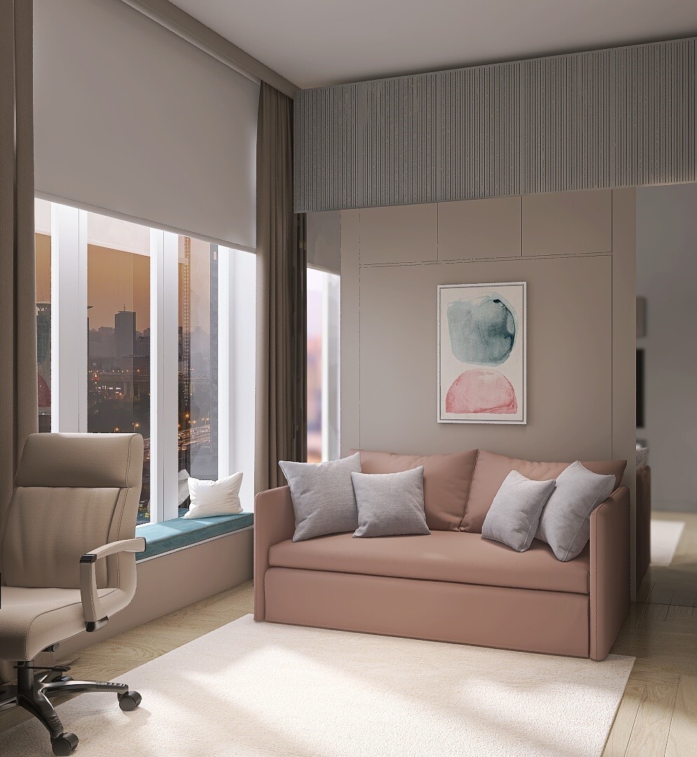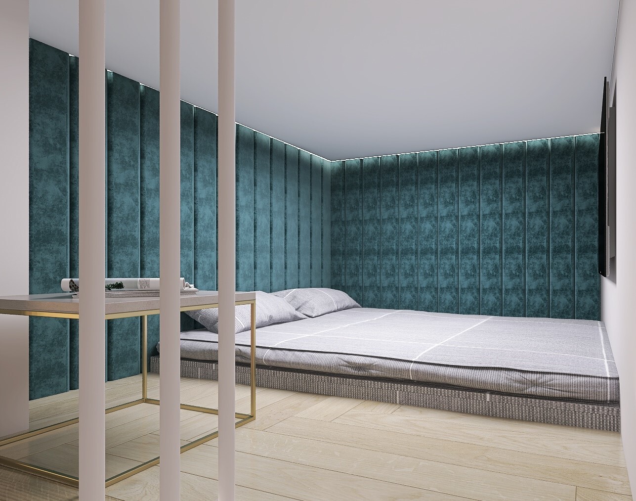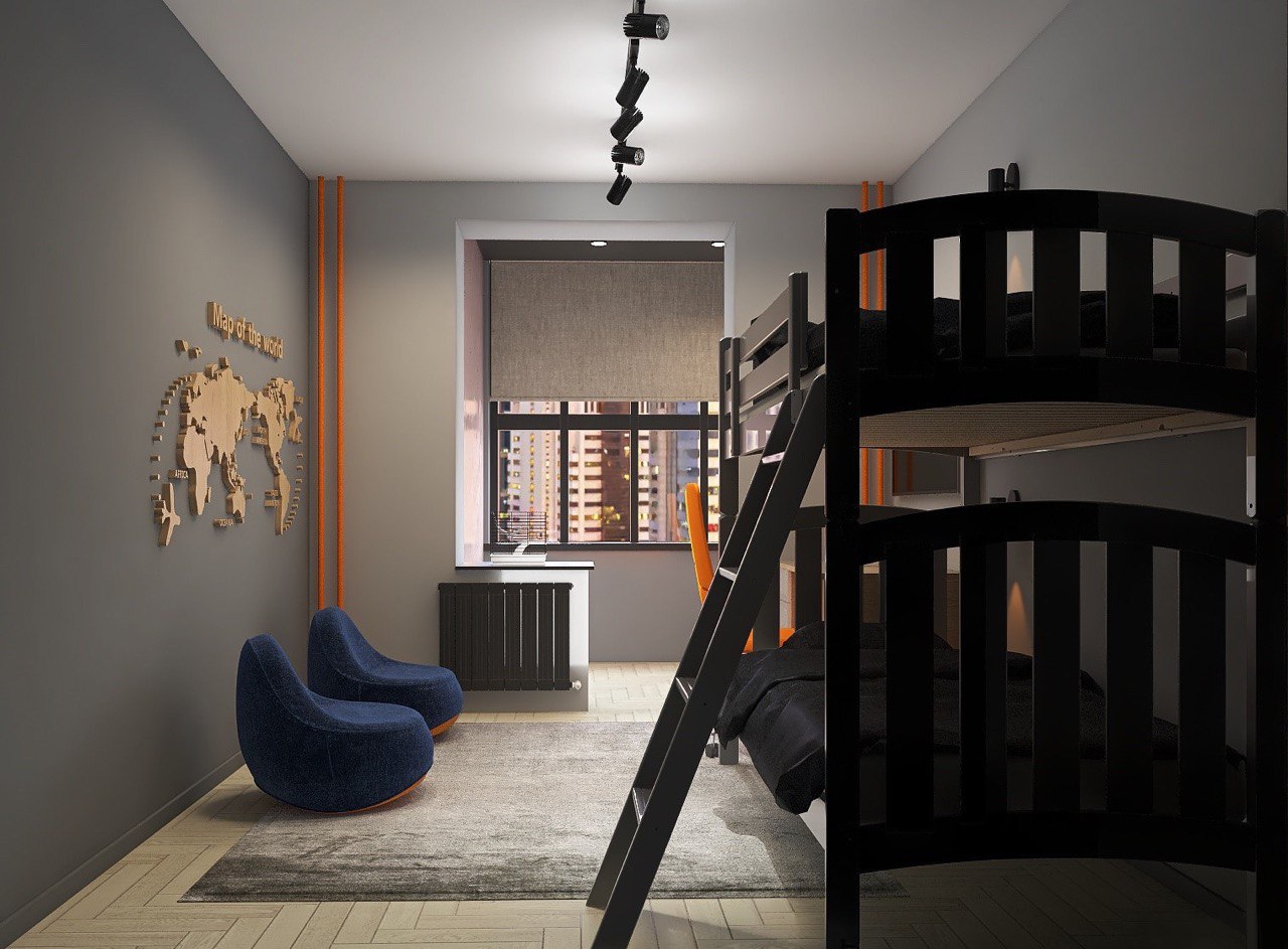 Высокие потолки 3.7 м запустили фантазию и заказчики пришли ко мне с главным пожеланием - сделать второй этаж. Но пришлось их переубедить, ведь для двух этажей надо не менее 4.5 м. Поэтому в квартире получилась только антресольная полка для папы - чтобы, не мешая никому, играть в компьютерные игры. В маленькой спальне поставили кровать-трансформер, а сыну придумали интерактивную двухярусную кровать.