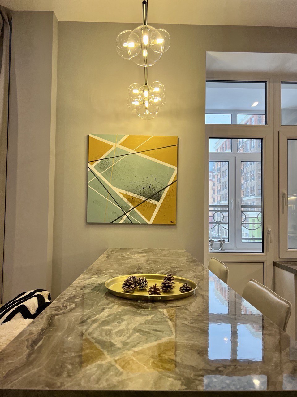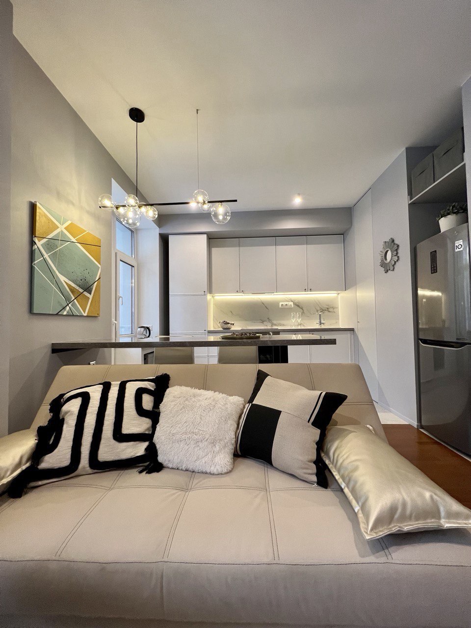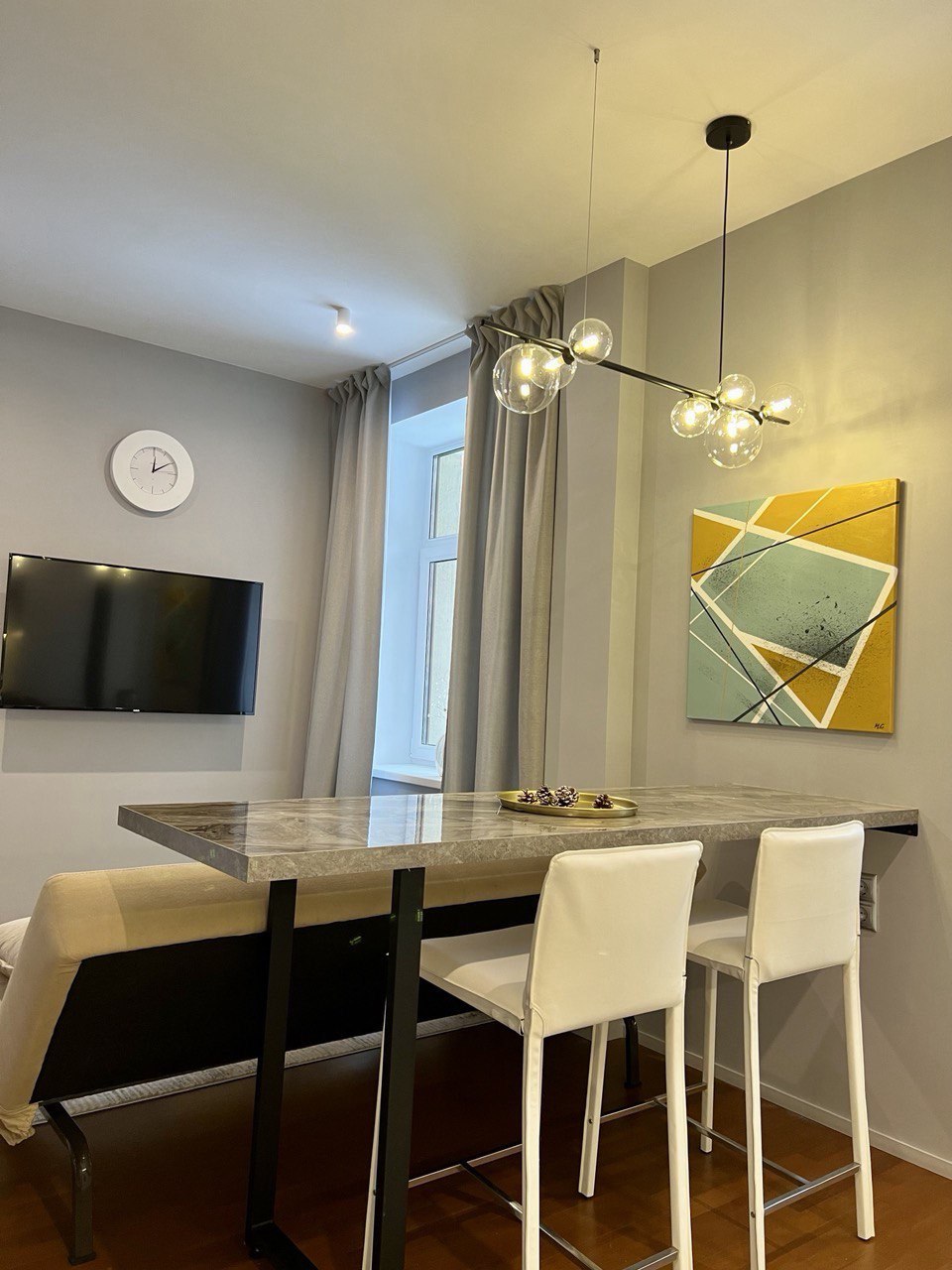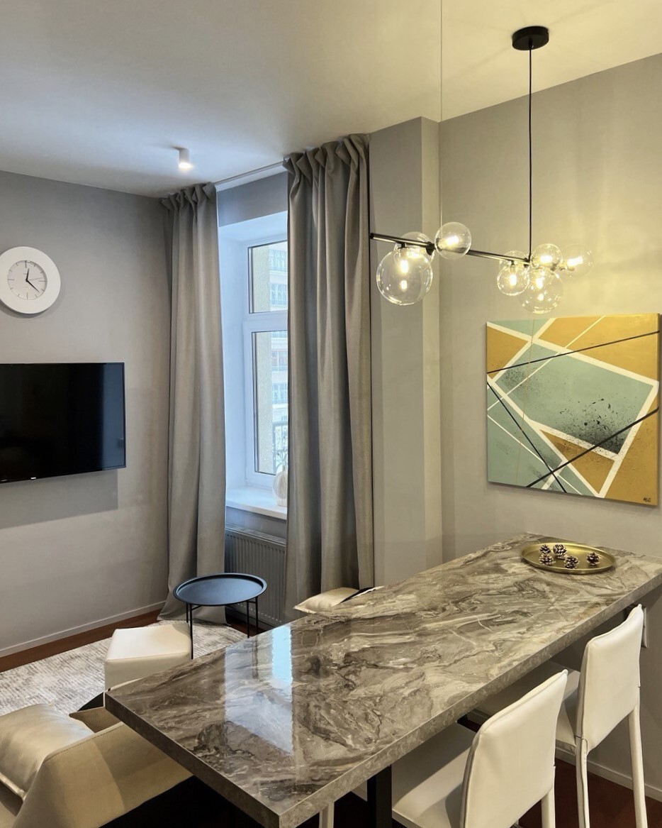 Студия примечательна исходной необычной планировкой от застройщика. Три панорамных окна и всего один угол 90 градусов в жилой зоне. Я придумала около 10 вариантов планировок, чтобы прийти к финальному варианту. Оказалось удобно и просторно — все, кто посещал давал на глаз не менее 35 м2. Результат — выверенная эргономика, огромная система хранения – 5 погонных метров шкафов в потолок, просторная удобная кухня со всей необходимой техникой. В санузле спланирована просторная душевая, установлена стирально-сушильная машина. И еще несколько приятных мелочей в виде парящей двухместной кровати с матрасом 1.60х2м, удобная зона релакса, заказная барная стойка с дубовой столешницей по чертежам автора проекта, итальянские стулья. Яркий акцент - круглая картина. Это копия выполнена мной лично.