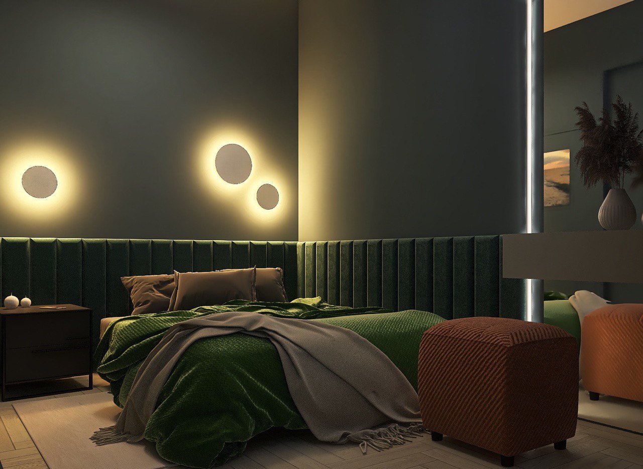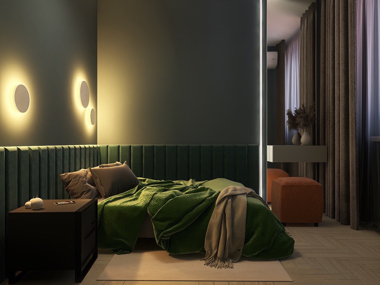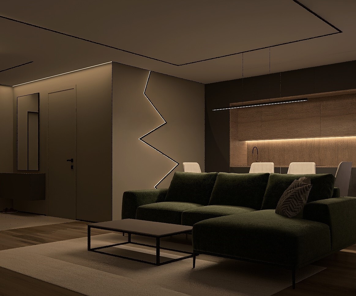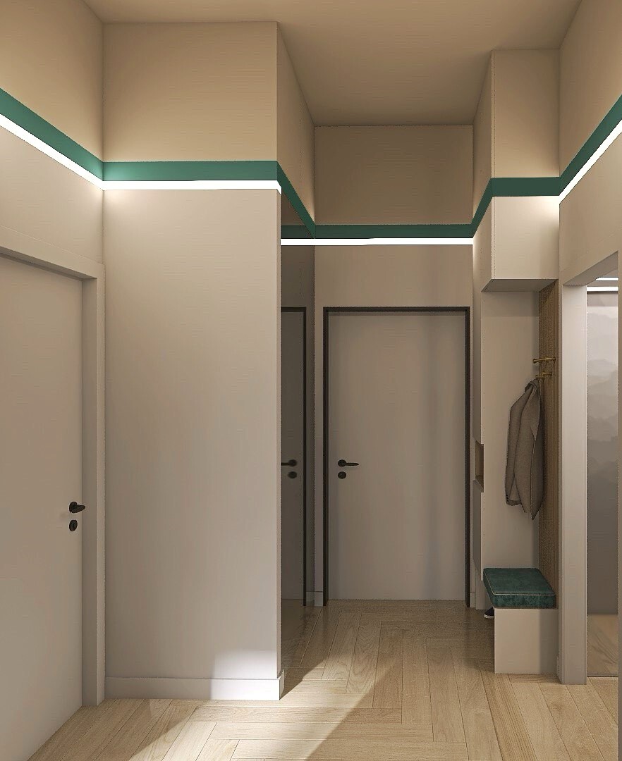 Максимальная функциональность и продуманность пространства. Здесь нашлось место для верстака, рабочего кабинета, 3д-принтера и многочисленных спортивных приспособлений. В большом санузле 8 м2 есть место для мини-душевой, чтобы ухаживать за мотоциклетным обмундированием. Светильник-молнию в гостиной Заказчик решил смастерить сам. Мне оставалось лишь свести воедино пожелания, раскрасить все любимым зеленым цветом и запрограммировать многочисленные инженерные решения для вентиляции, звукоизоляции, умного дома. Проект завершается Ждем результат.