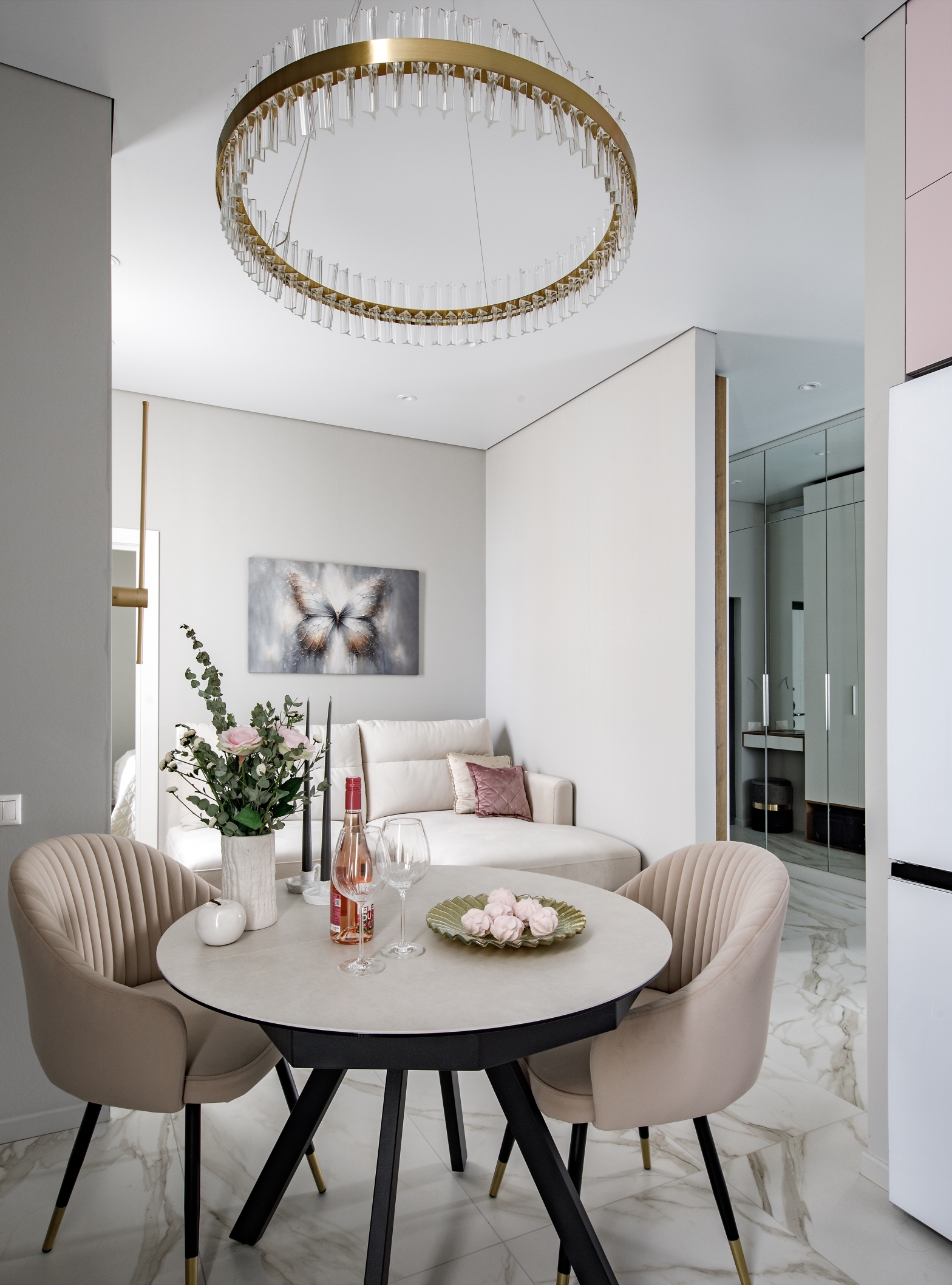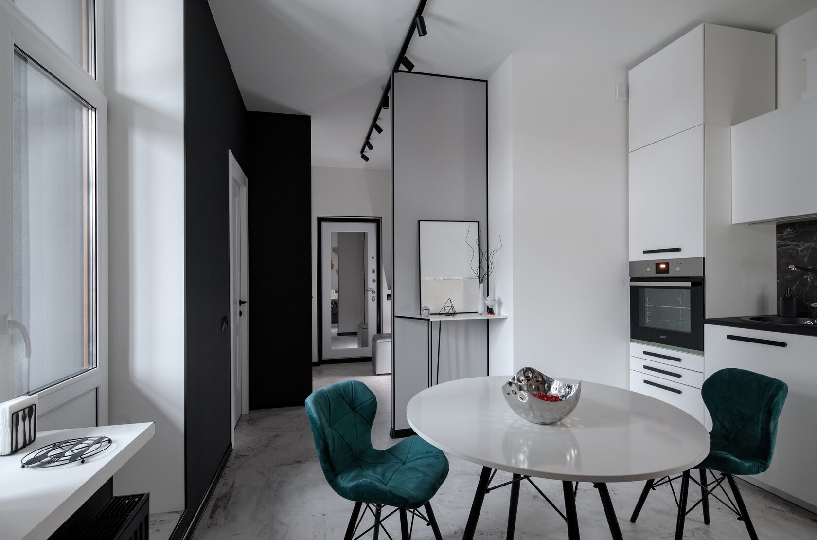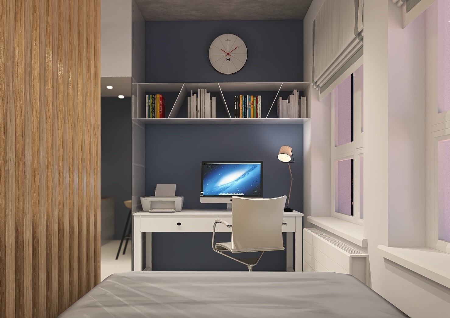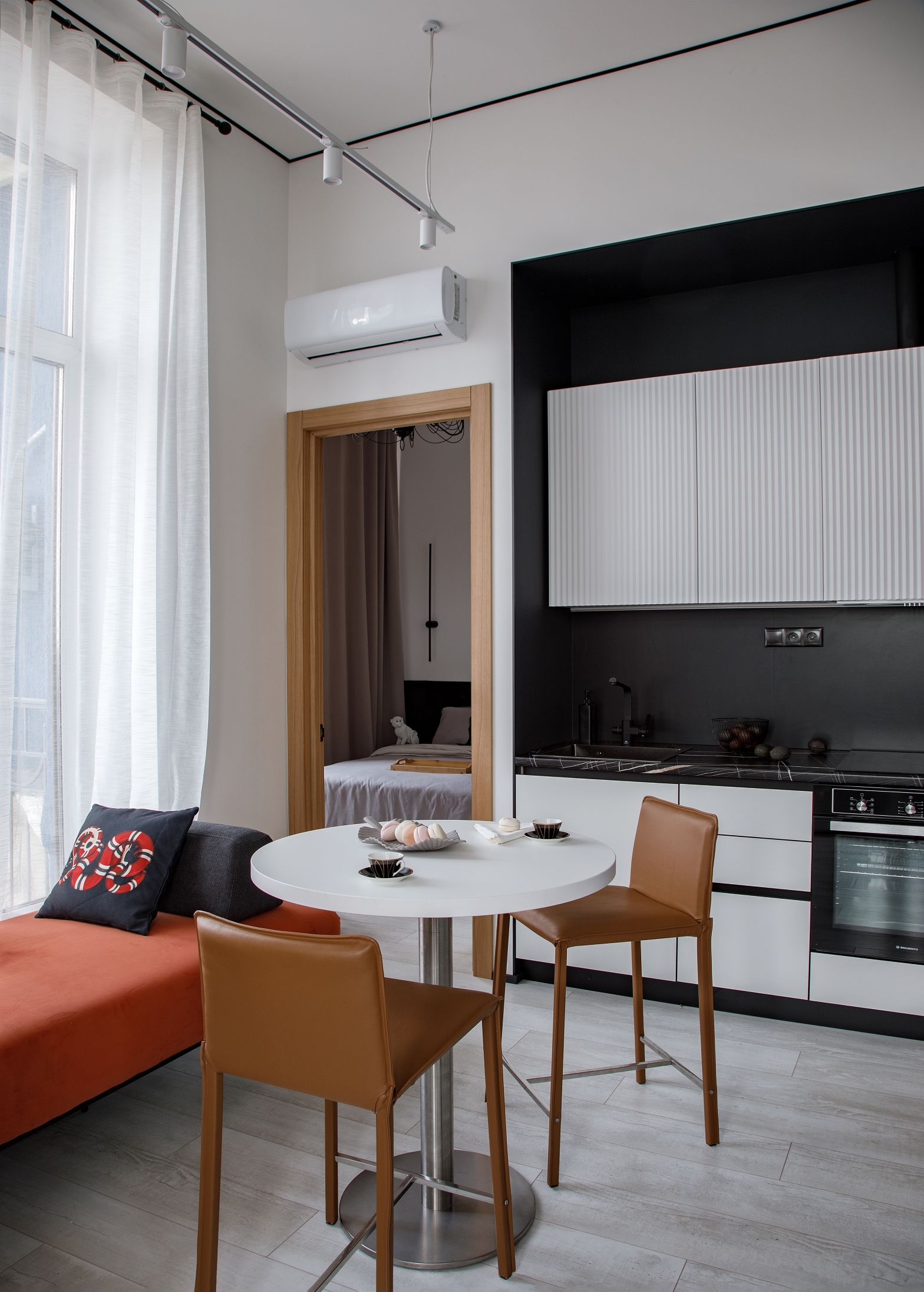 Студия для студентки - будущего экономиста Марии. Особых пожеланий я не услышала. Мне прислали несколько референсов того, что нравится, несколько пожеланий по цвету и мебели и со словами: "что можно уместить на 25 м2?))" передали квартиру мне для работы. Решение: У студии изначально оказалась удобная планировка и удобные параметры. Поэтому уместить удалось практически все атрибуты нормальной квартиры. А именно, полноценную кухню со всей техникой, включая посудомойку, полубарную стойку, рабочую зону, кровать 140х200, огромную для такой малютки систему хранения - шкаф 3.50 м длиной, 60 см глубиной и 2.90 м высотой. В санузле появилась полноценная ванна 1.70х0.7 и стиральная машинка. Все рады)