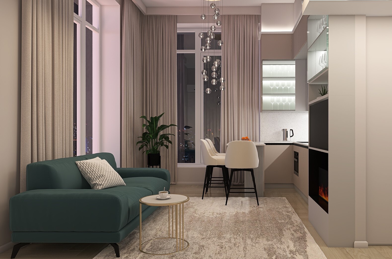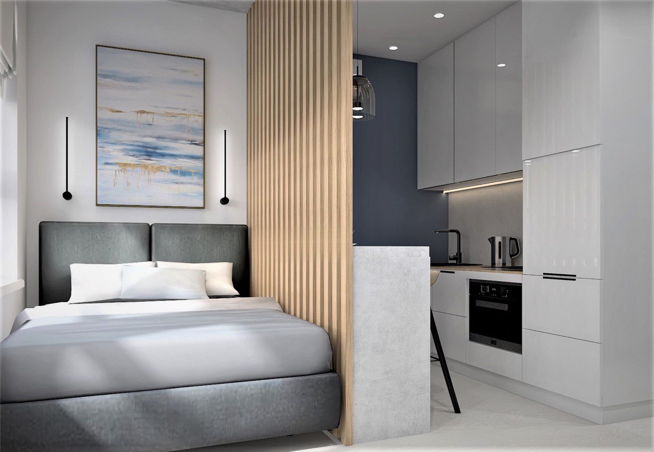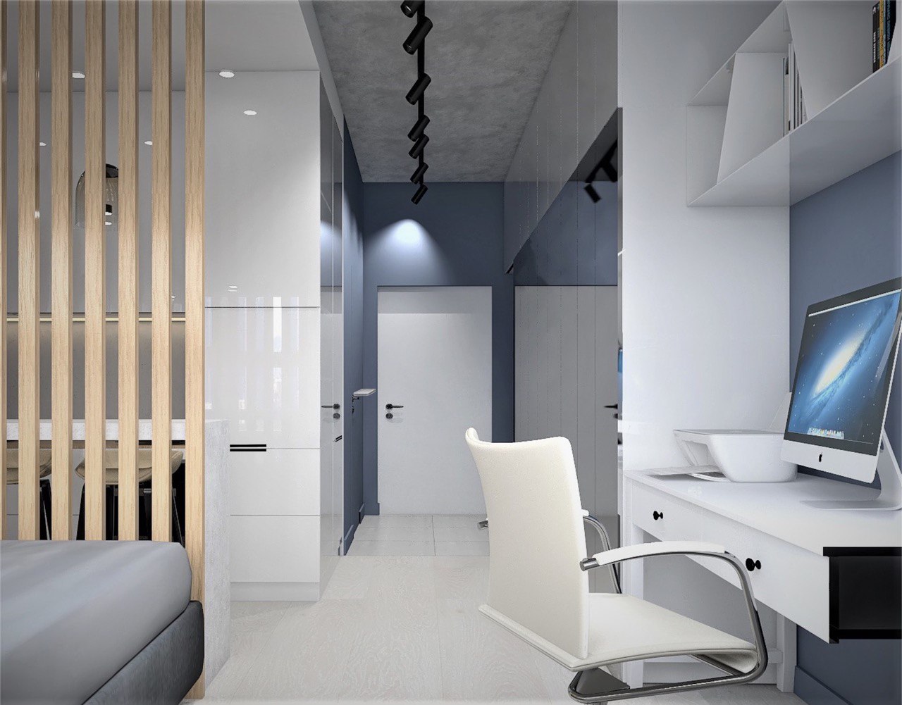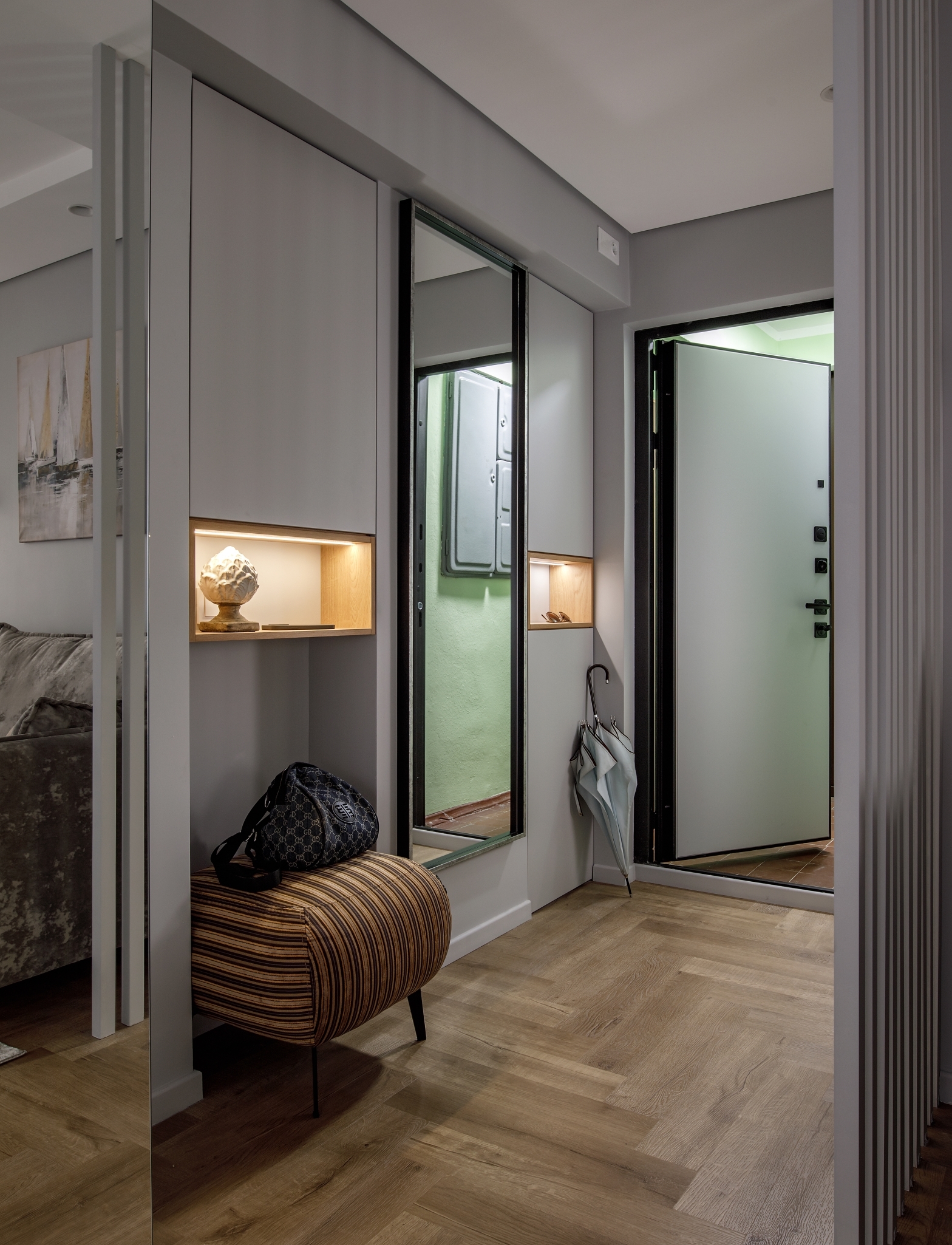 Студия для студентки - будущего экономиста Марии. Особых пожеланий я не услышала. Мне прислали несколько референсов того, что нравится, несколько пожеланий по цвету и мебели и со словами: "что можно уместить на 25 м2?))" передали квартиру мне для работы. Решение: У студии изначально оказалась удобная планировка и удобные параметры. Поэтому уместить удалось практически все атрибуты нормальной квартиры. А именно, полноценную кухню со всей техникой, включая посудомойку, полубарную стойку, рабочую зону, кровать 140х200, огромную для такой малютки систему хранения - шкаф 3.50 м длиной, 60 см глубиной и 2.90 м высотой. В санузле появилась полноценная ванна 1.70х0.7 и стиральная машинка. Все рады)