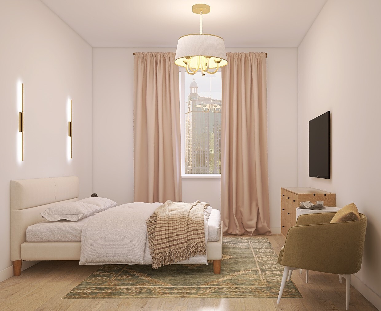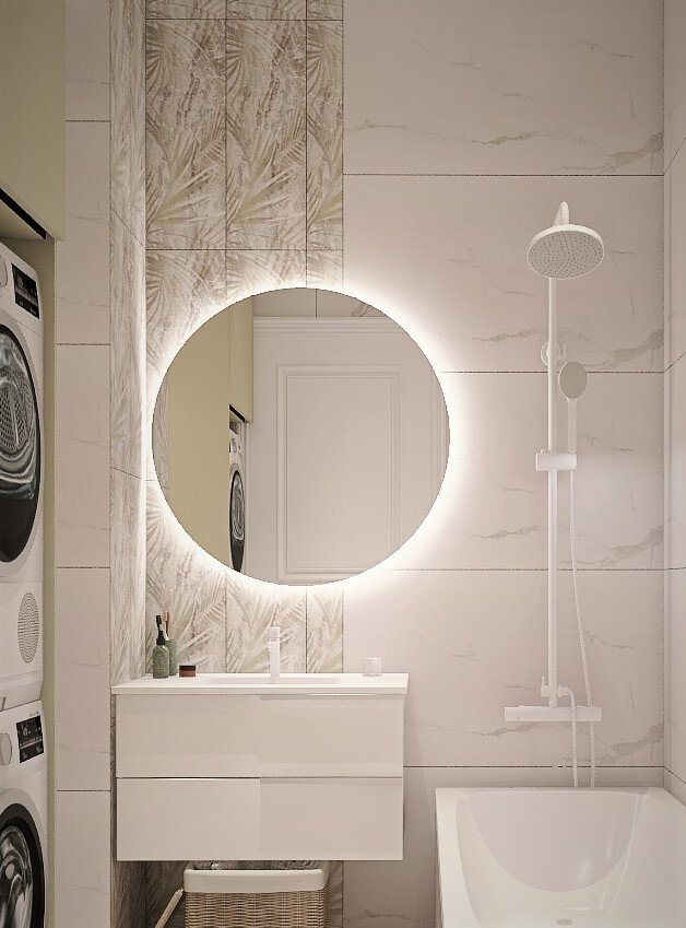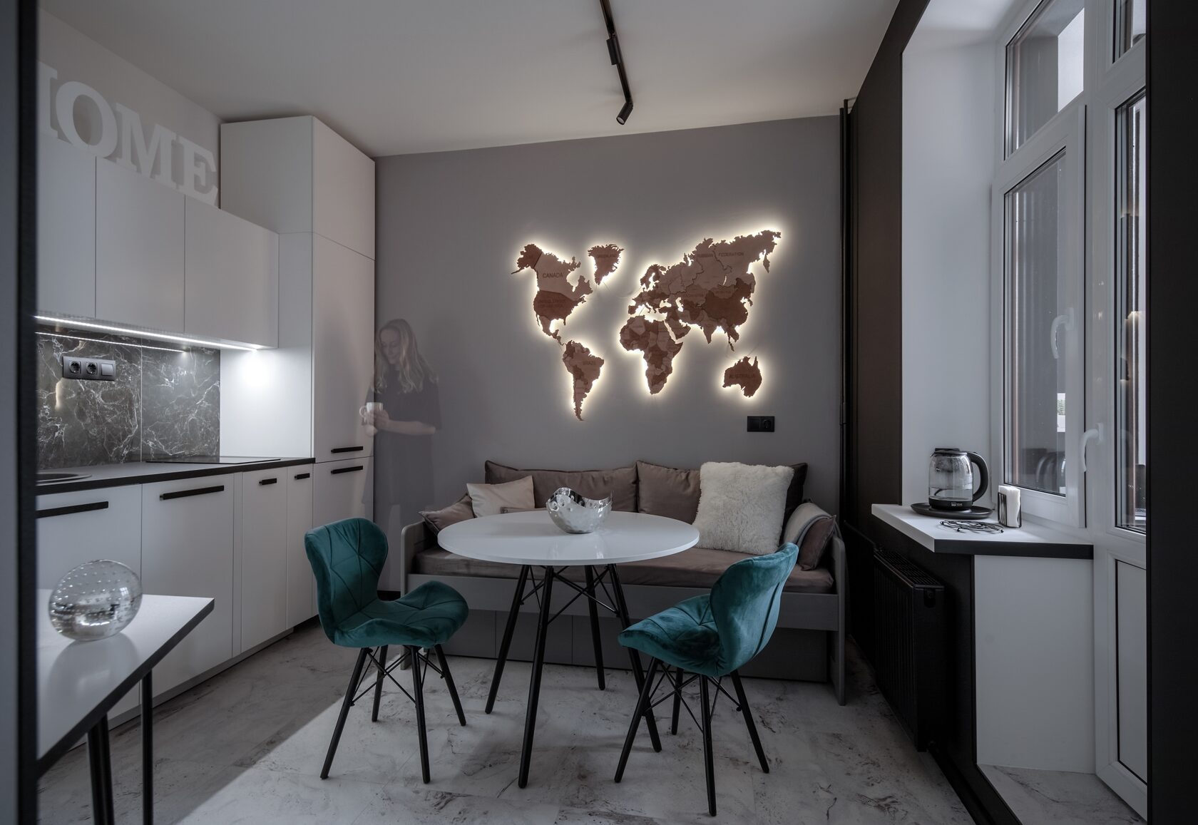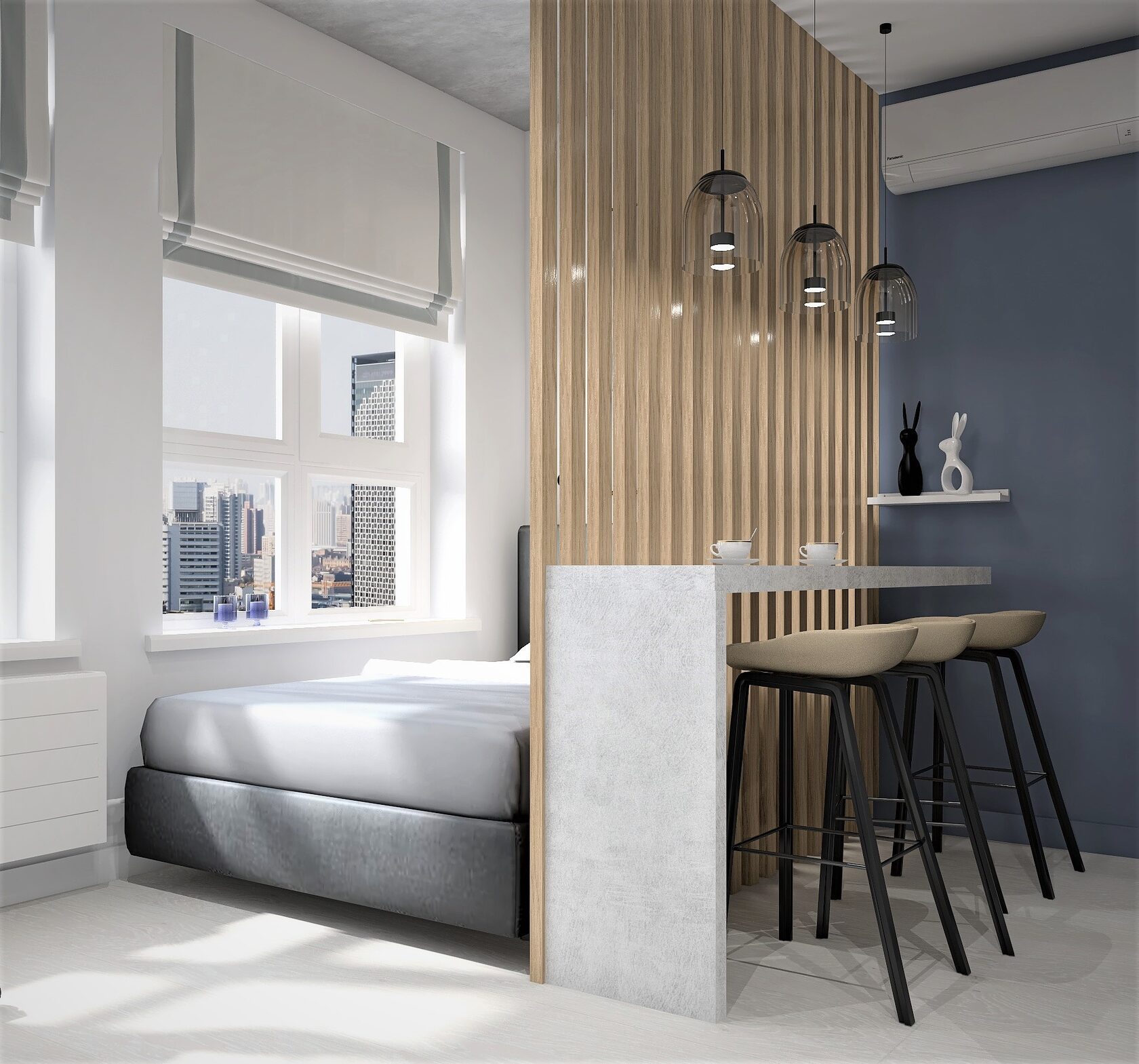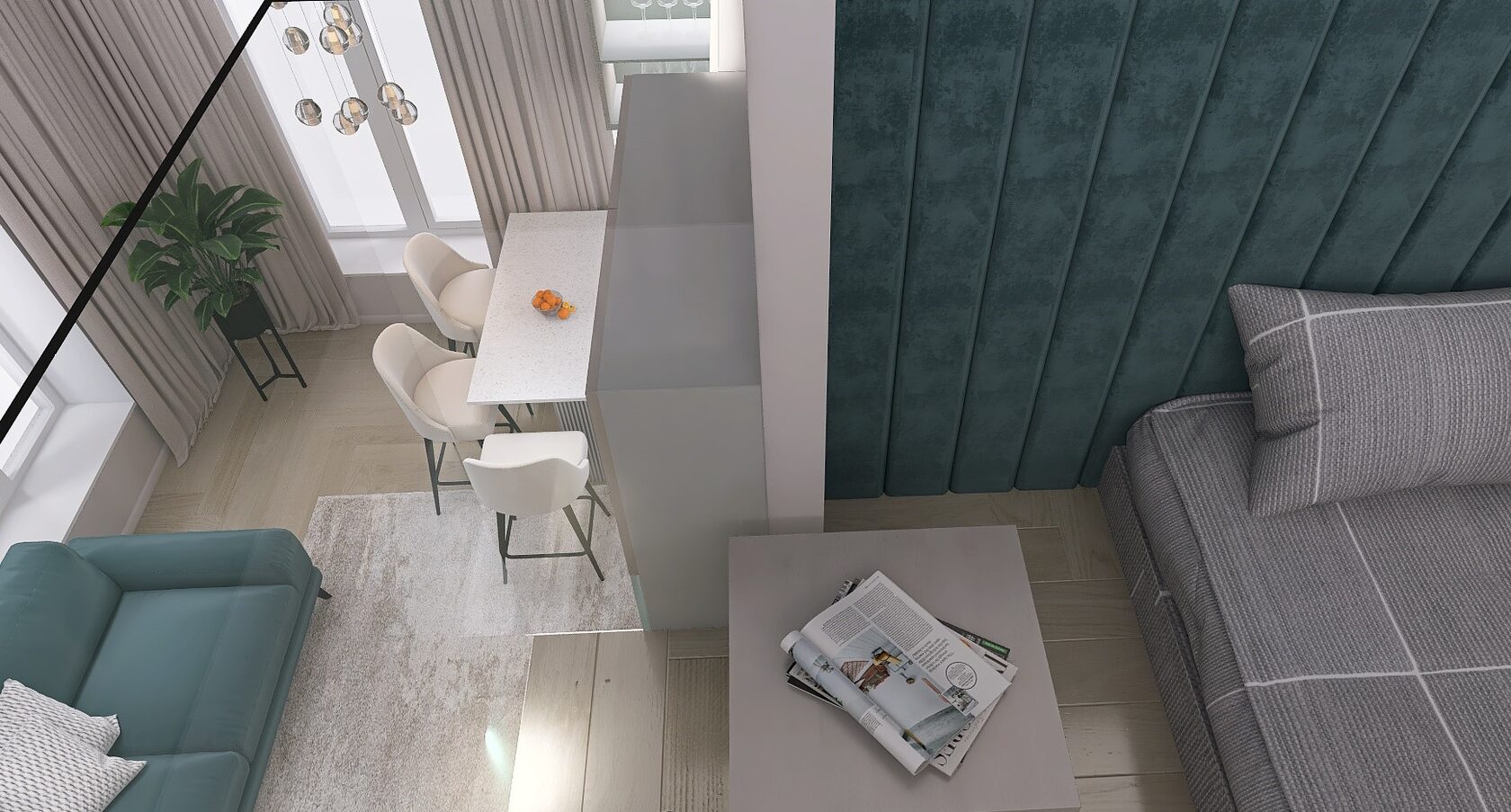 Студия для студентки - будущего экономиста Марии. Особых пожеланий я не услышала. Мне прислали несколько референсов того, что нравится, несколько пожеланий по цвету и мебели и со словами: "что можно уместить на 25 м2?))" передали квартиру мне для работы. Решение: У студии изначально оказалась удобная планировка и удобные параметры. Поэтому уместить удалось практически все атрибуты нормальной квартиры. А именно, полноценную кухню со всей техникой, включая посудомойку, полубарную стойку, рабочую зону, кровать 140х200, огромную для такой малютки систему хранения - шкаф 3.50 м длиной, 60 см глубиной и 2.90 м высотой. В санузле появилась полноценная ванна 1.70х0.7 и стиральная машинка. Все рады)