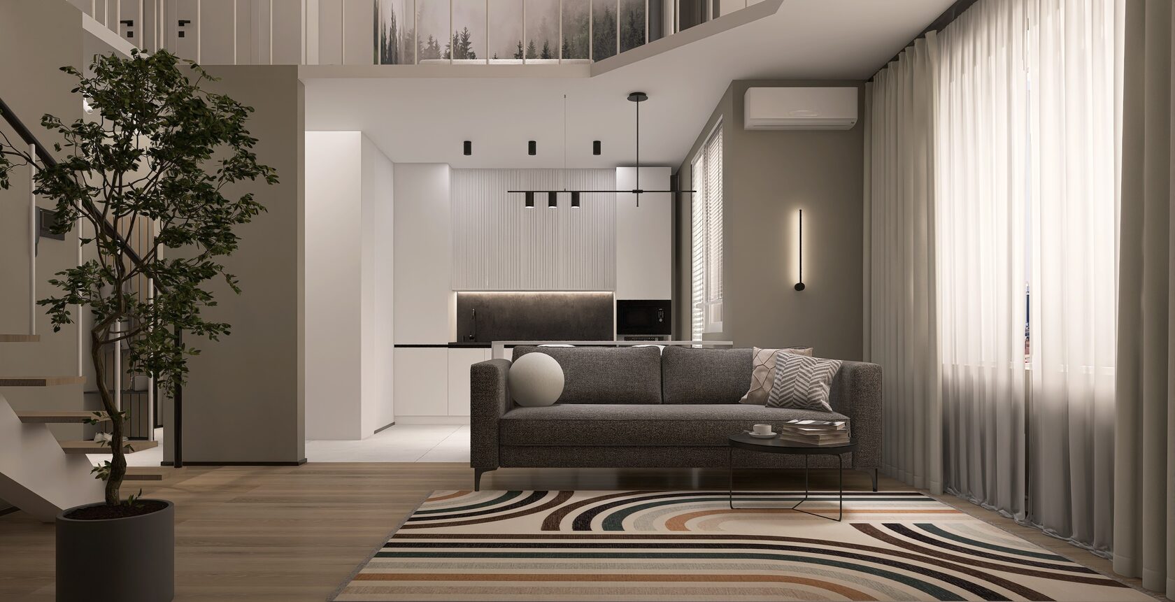 Квартира, занимающая два последних этажа в доме, с высотой потолков 5.3 метра. Прекрасный вид, птички летают, лесной массив... Природу решили перенести в интерьер, а еще сделали антресольный этаж - получилось красиво и функционально.