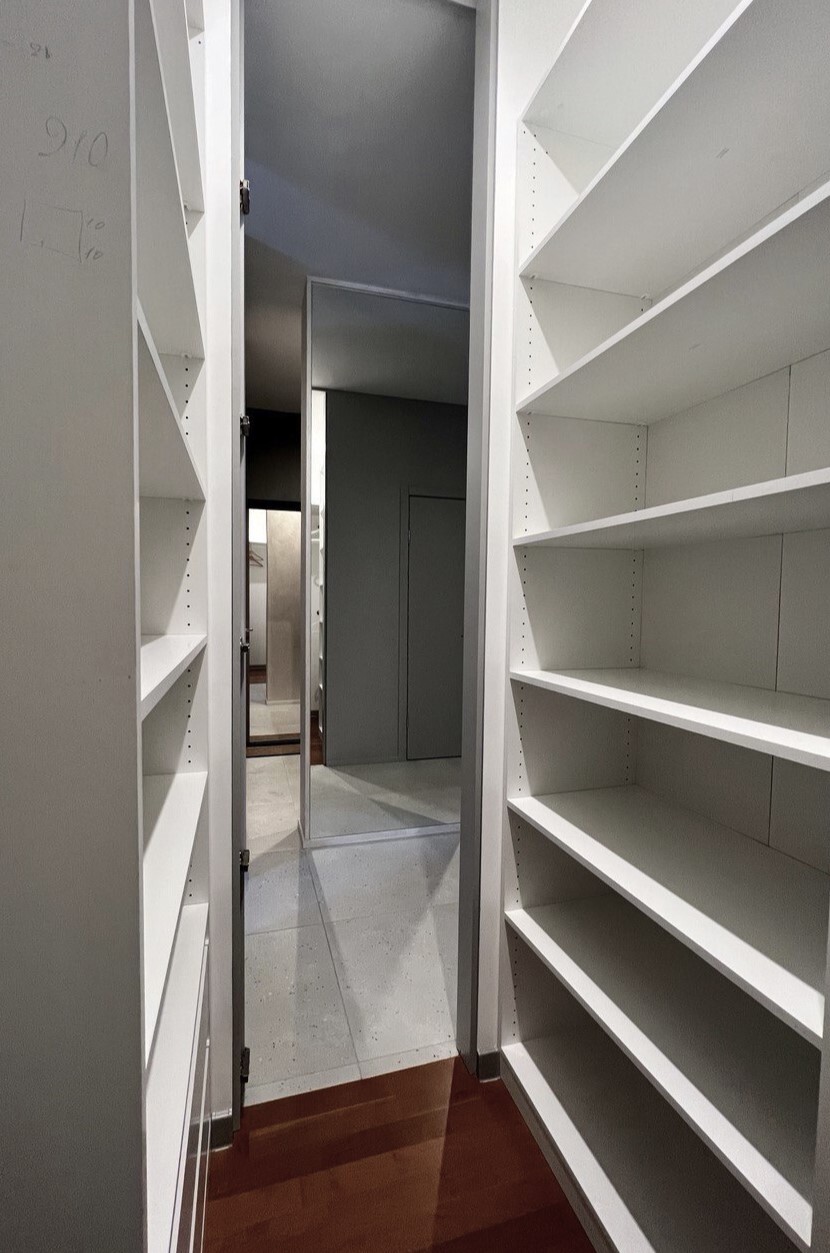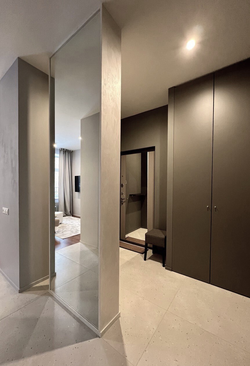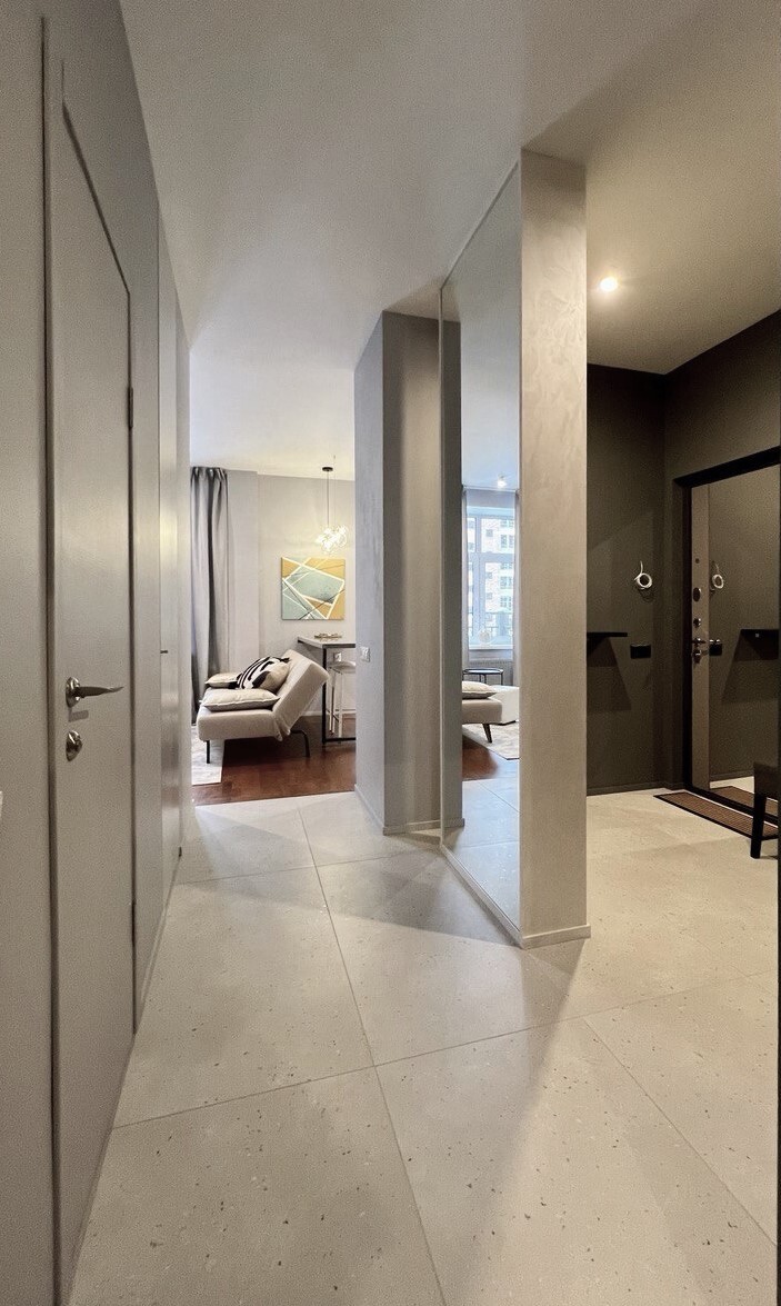 Моей Заказчице досталась новая квартира по реновации. Огромный плюс - дополнительные 15 м2! Но есть и существенный минус - новенький ремонт от застройщика оказался непригоден для жизни. Поэтому было решено сразу кардинально всё переделать. По проекту демонтировали практически все перегородки, стяжку, даже дверь на лоджию передвинули. Зато получилась огромная система хранения, 2 просторных санузла, отдельная постирочная зона, просторная спальня, гостиная с отдельным входом и кухня с мягким уголком - Заказчица очень хотела мягкую зону, но диван не поместился. А на утепленной лоджии появилась отдельная лайндж-зона.