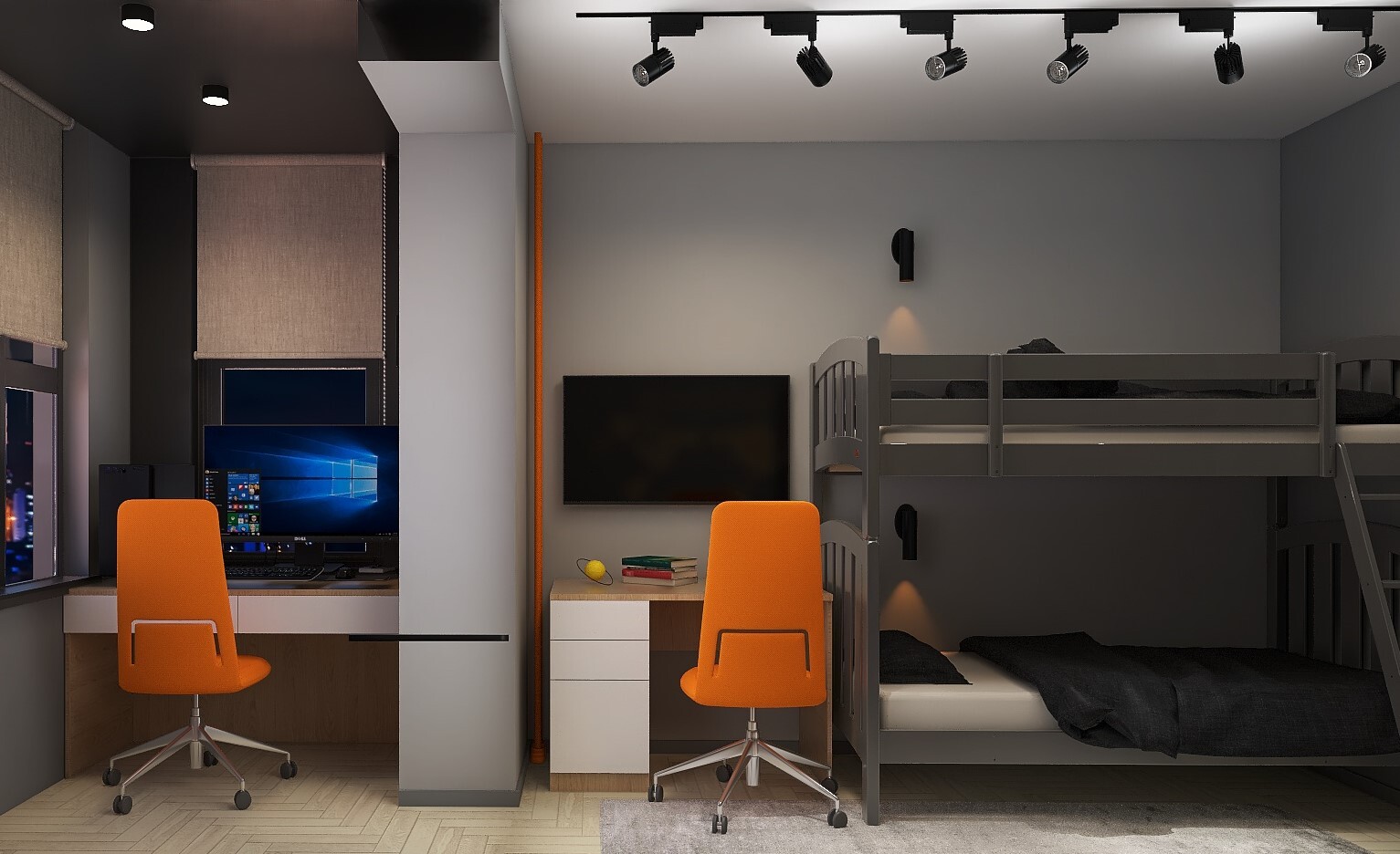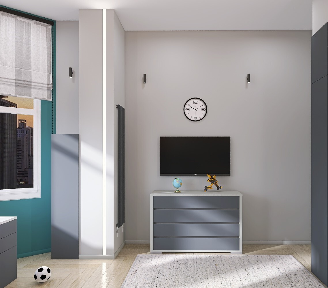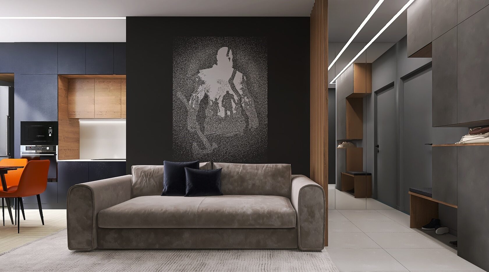 Заказчики сразу расположили к себе своим юмором и теплотой общения. Работа была в радость и проект получился необычным и харизматичным. Главным акцентом интерьера стал Бог войны Кратос из компьютерной игры - занял главную стену в гостиной. Юноши тоже рассказали, что хотят - и получили уютную комнату с удобными рабочими местами. Маме "разрешили" сделать спальню под ее вкус. В общем, все счастливы! И я тоже)