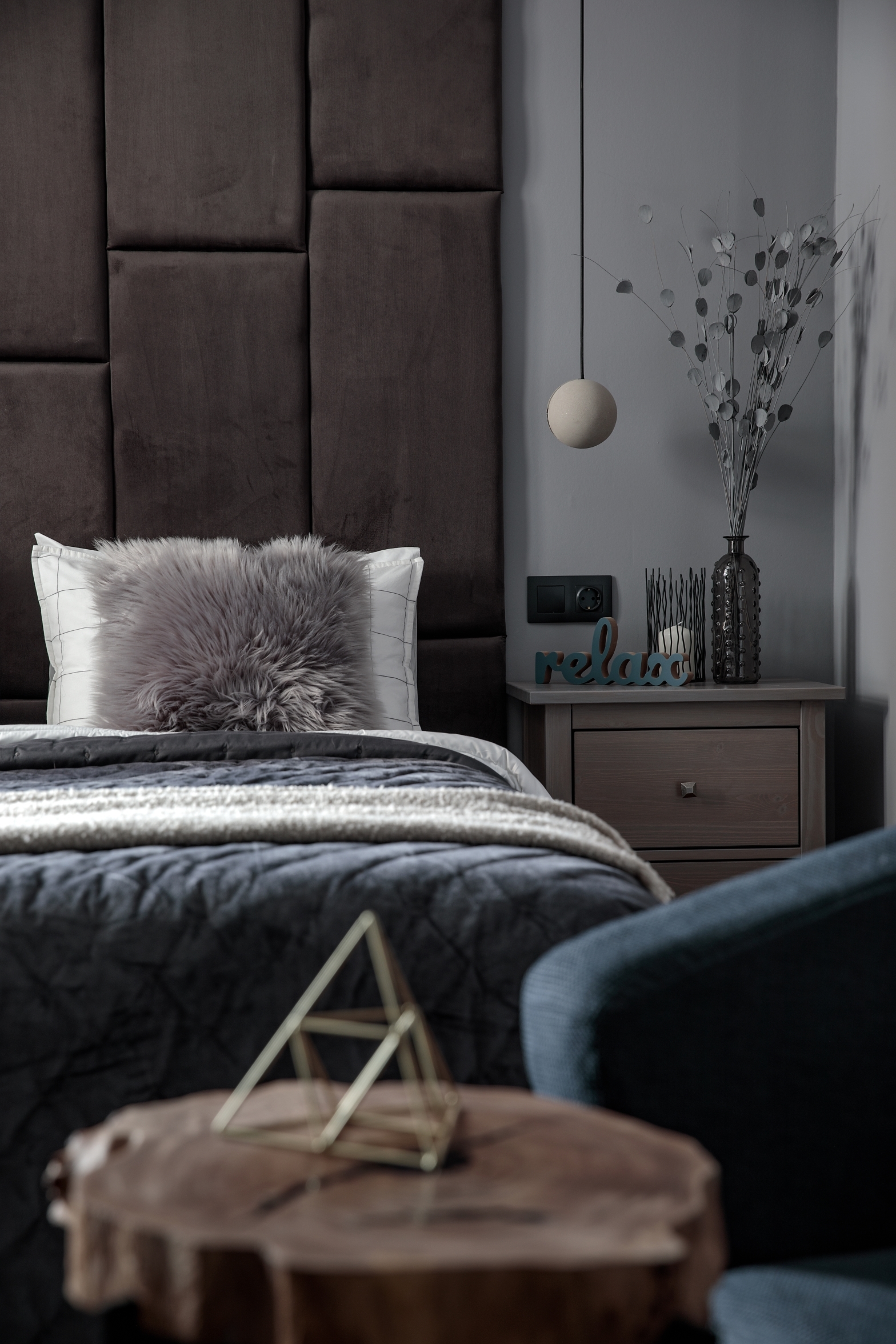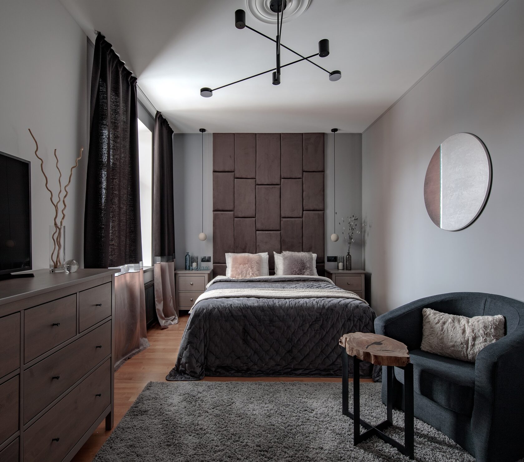 Он – еще студент и начинающий бизнесмен, она – психолог и прекрасная домохозяйка. Любят все оттенки серого и уют в доме. В проекте использованы хозяйские предметы мебели, но в новом воплощении. Что-то перекрасили, что-то перешили, перетянули. И вот что получилось! Фото Сергей Моргунов